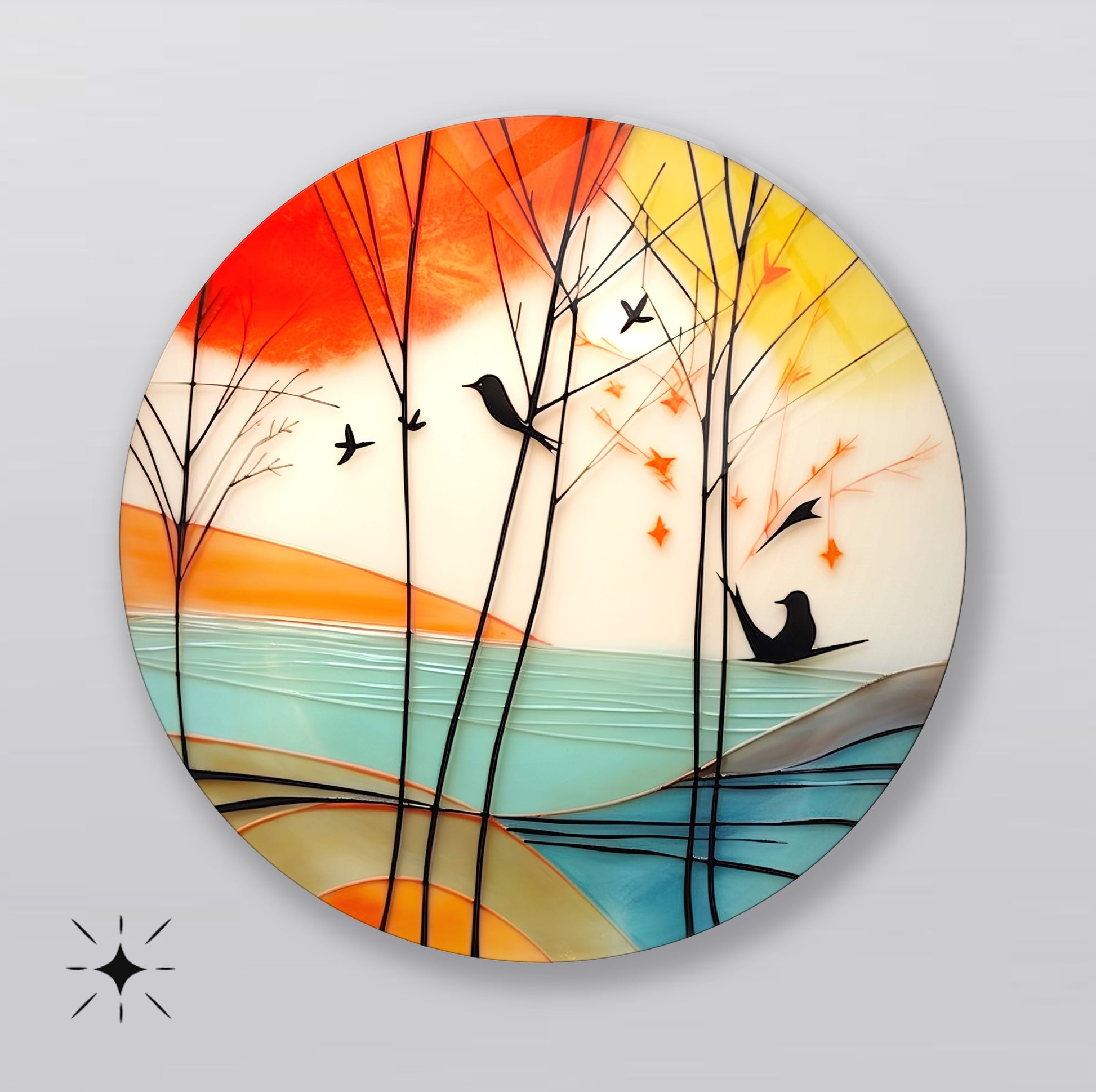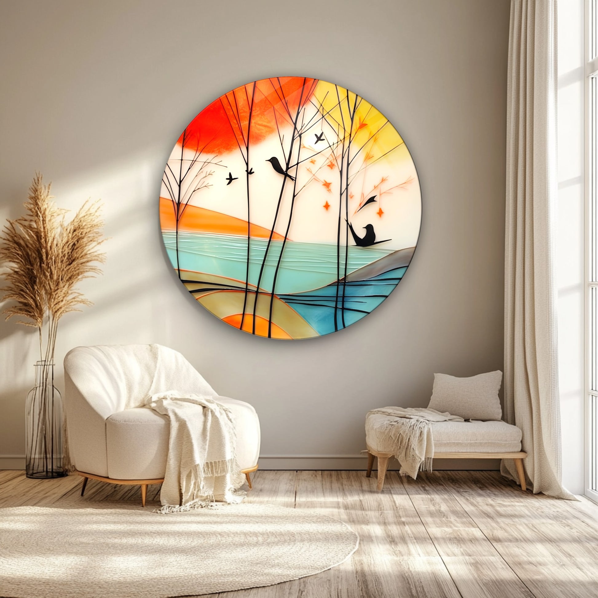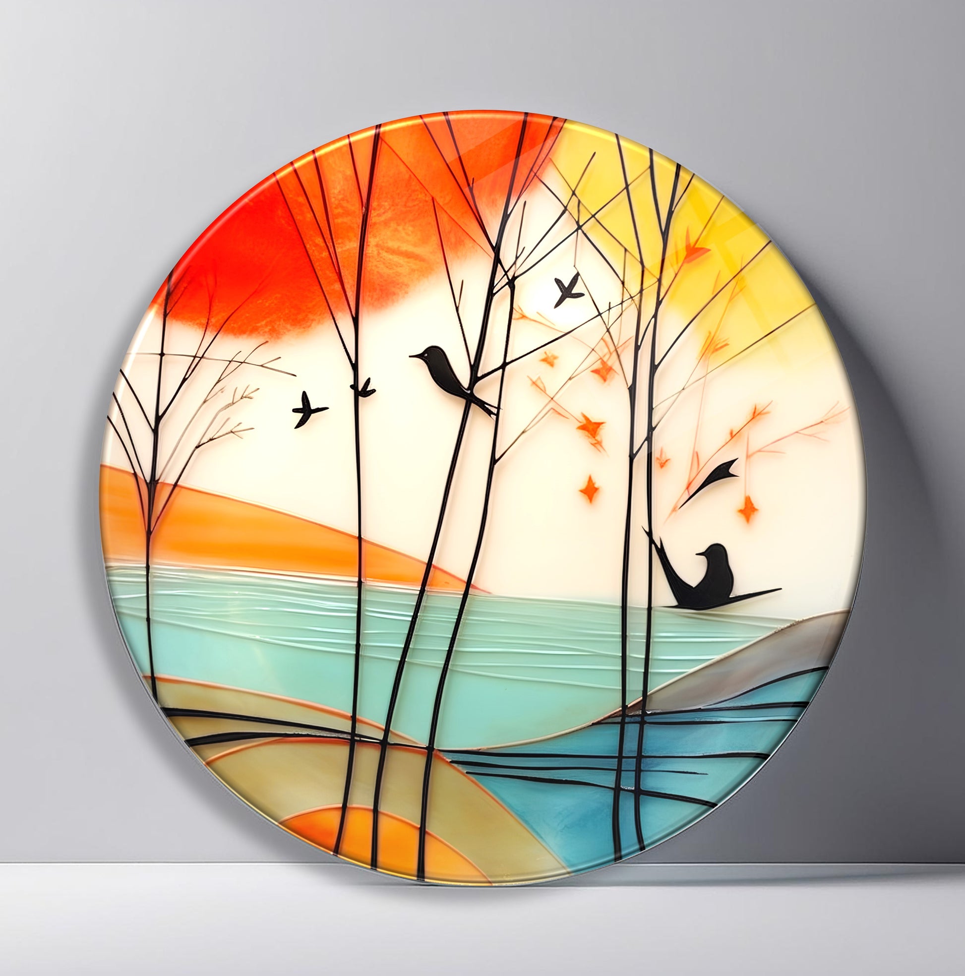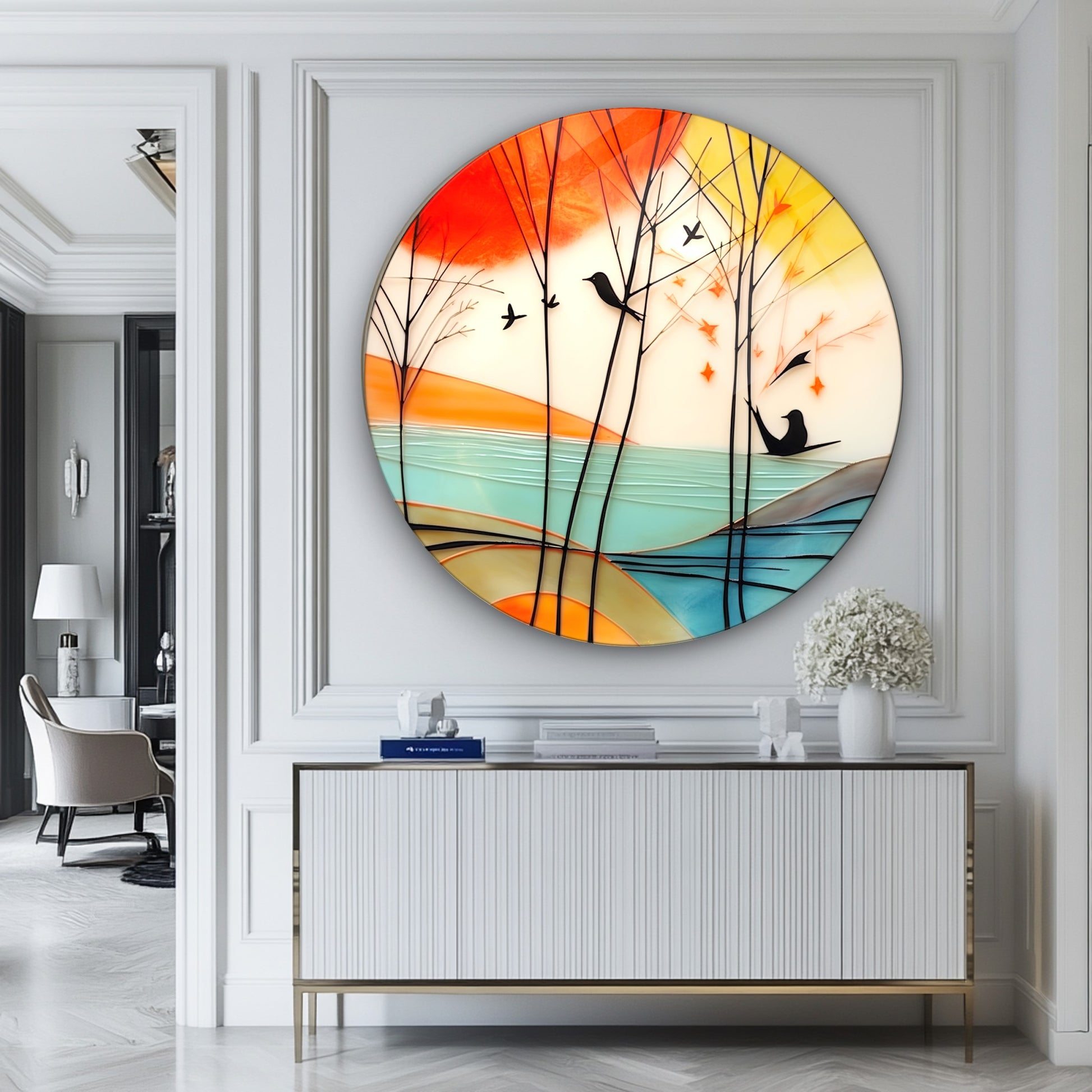 Soyut Gün Batımı ve Kuşlar Yuvarlak Cam Tablo