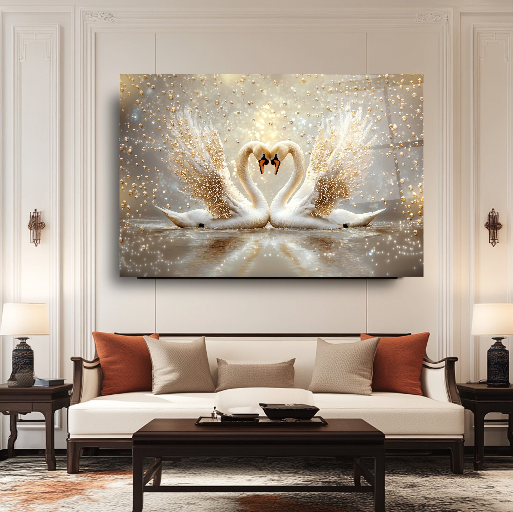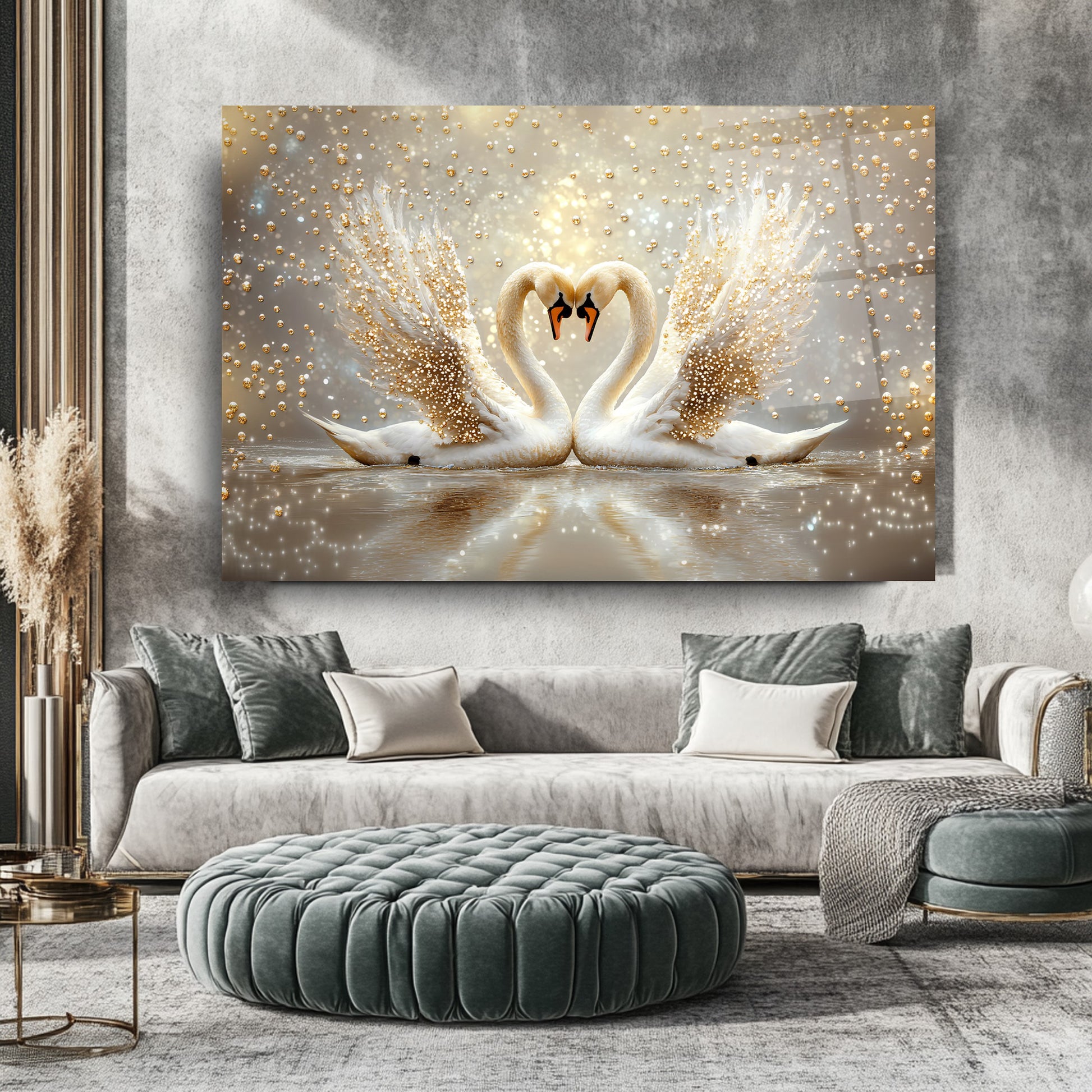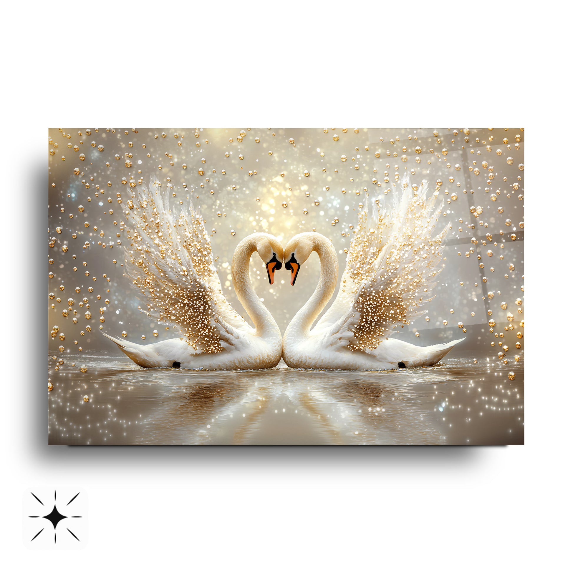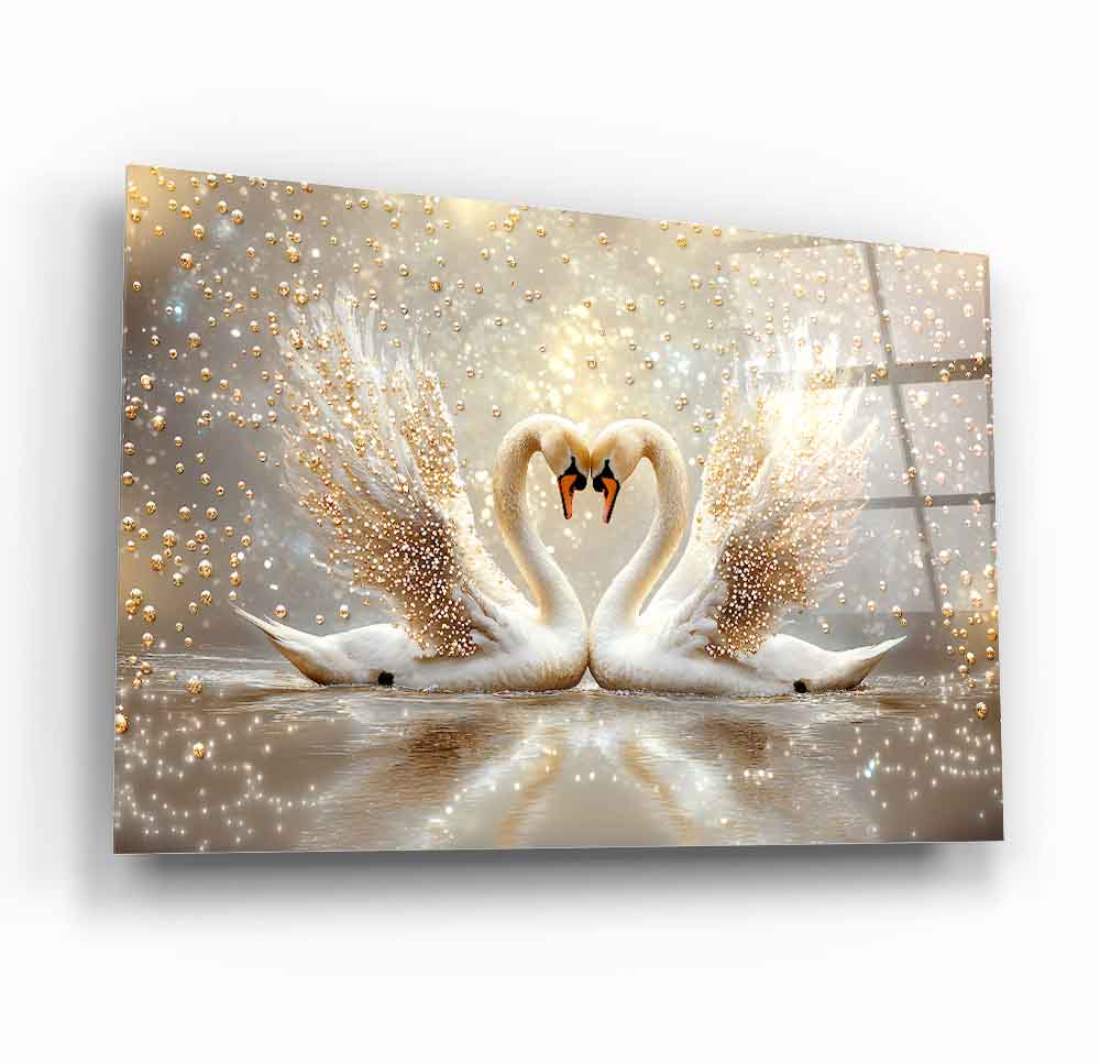 Romantik atmosferin simgesi olan bu cam tabloda, altın yaldızlı incilerle vurgulanmış iki kuğunun zarif silueti, su üzerindeki huzurlu yansımalarıyla dikkat çekiyor. Yumuşak mavi veya gece mavisi arka planı sayesinde yatak odası veya oturma alanlarınıza estetik ve duygusal bir dokunuş katacak bir dekoratif unsur. UV baskı teknolojisiyle solmayan canlı renkler, temperli cam dayanıklılığı ve çerçevesiz modern tasarımıyla bir arada sunuluyor. Kolay montaj özelliği sayesinde, sevgi dolu ve şık bir atmosfer arayanlar için ideal bir tercih.