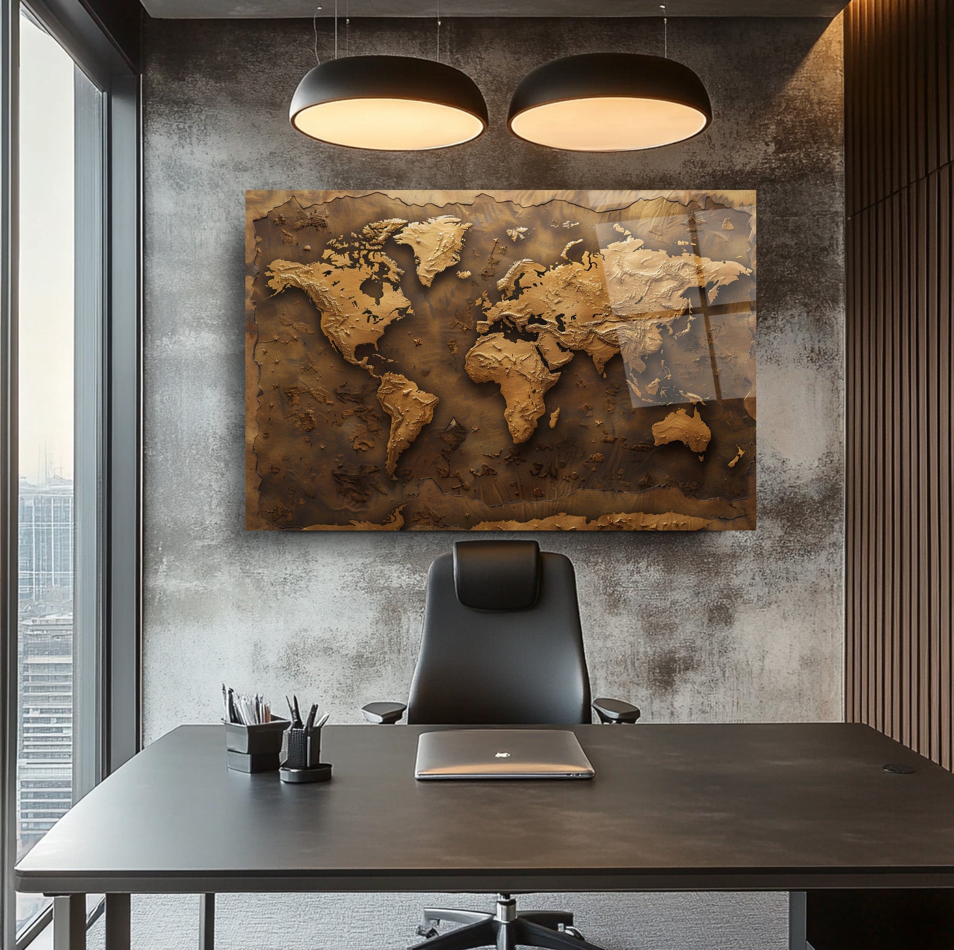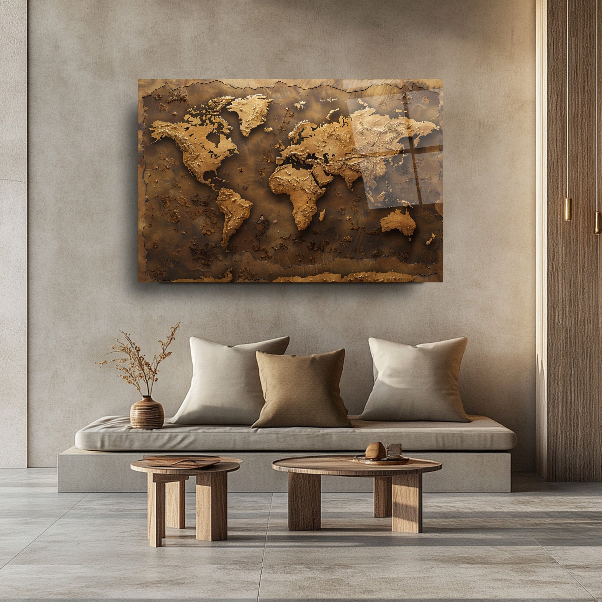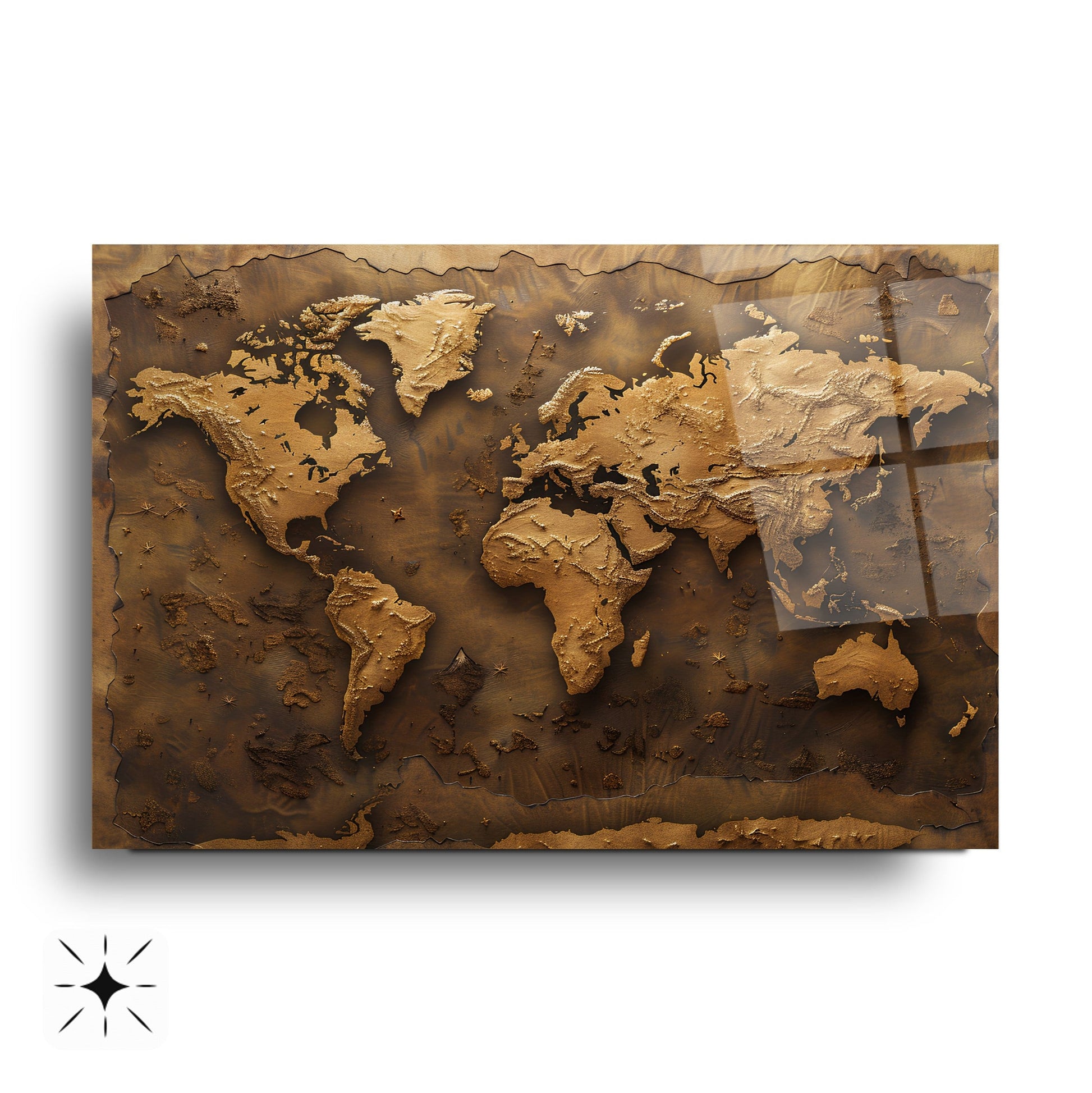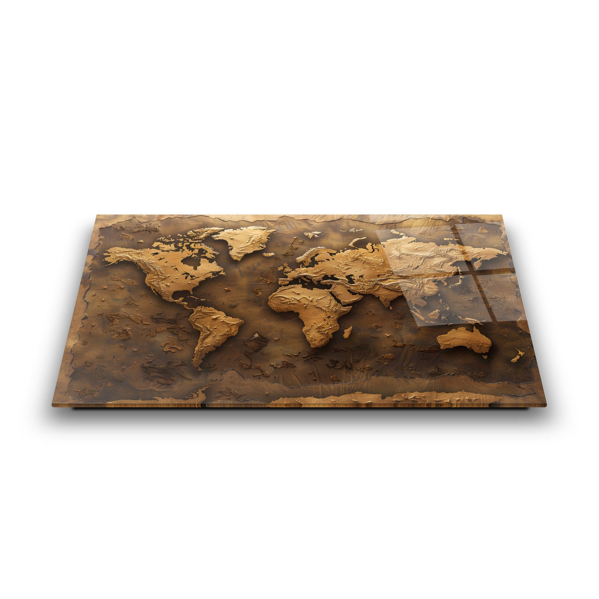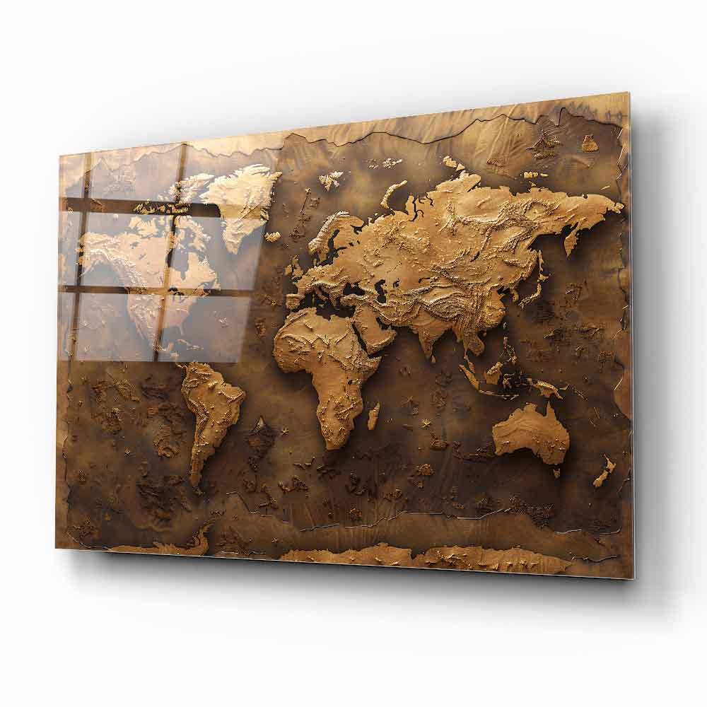 Kahverenginin sıcak tonlarında, kabartmalı detaylarla işlenmiş bu dünya haritası, mekânınıza zarif ve sofistike bir dokunuş katıyor. 4 mm kalınlığında, kırılmaya karşı 10 kat daha dayanıklı temperli cam üzerine UV dijital baskı teknolojisiyle işlenen bu eser, renklerin solmasını engeller ve uzun ömürlü kullanım sunar. Rodajlanmış kenarları sayesinde estetik ve güvenli bir görünüm sağlar. Kolay montaj için tüm aksesuarlar kutu içinde sunulur. Ofis, makam odası veya antre gibi farklı mekanlarda şıklık ve prestij arayanlar için ideal bir tercihtir.