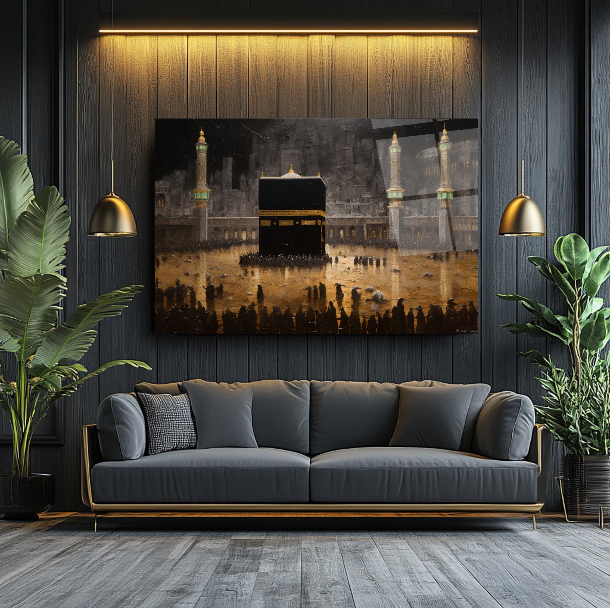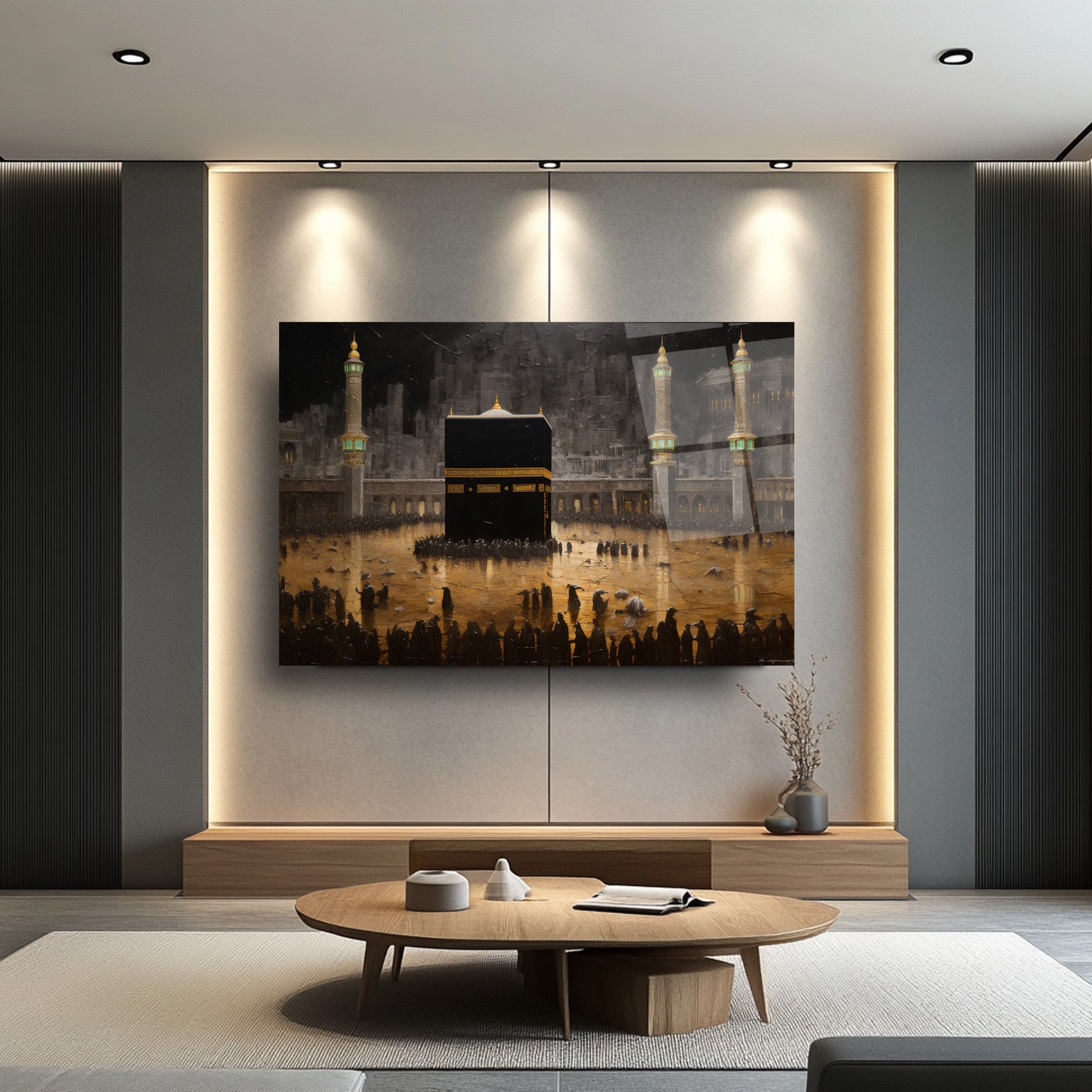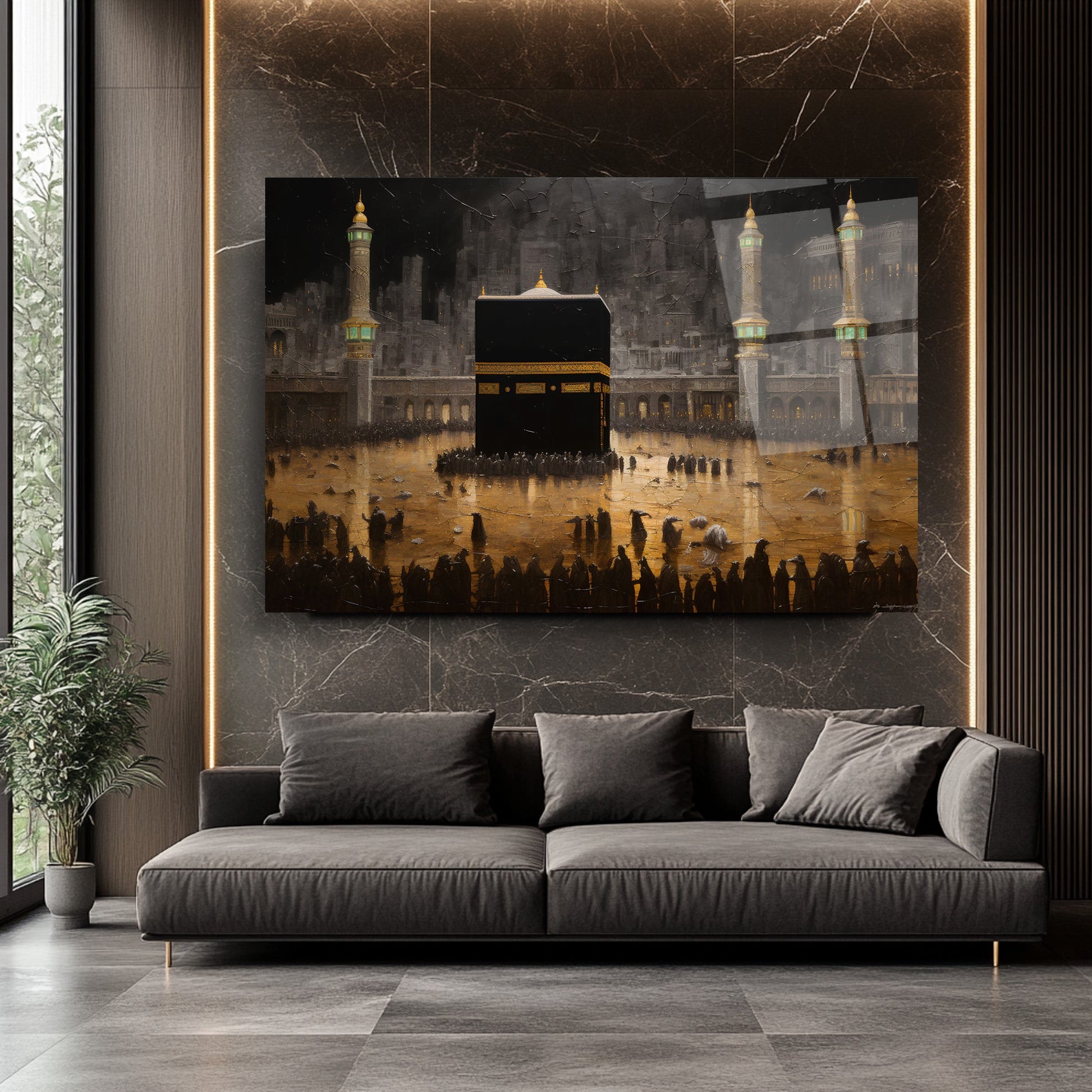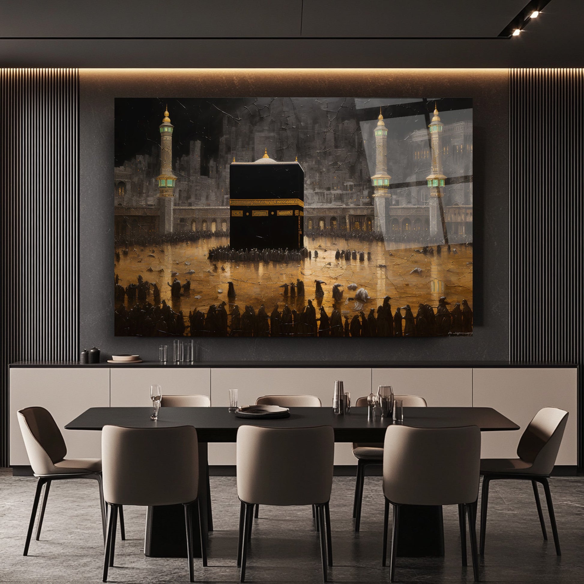 Gold detaylarla süslenen Kabe manzarası, bu gerçek cam tabloya manevi bir derinlik ve zarafet katar. Kırılmaz temperli cam tablo yapısıyla hem dayanıklı hem estetik bir dekorasyon seçeneğidir. Dini ve İslami temalı mekanlarda anlamlı ve şık bir atmosfer yaratmak isteyenler için ideal bir tercih.