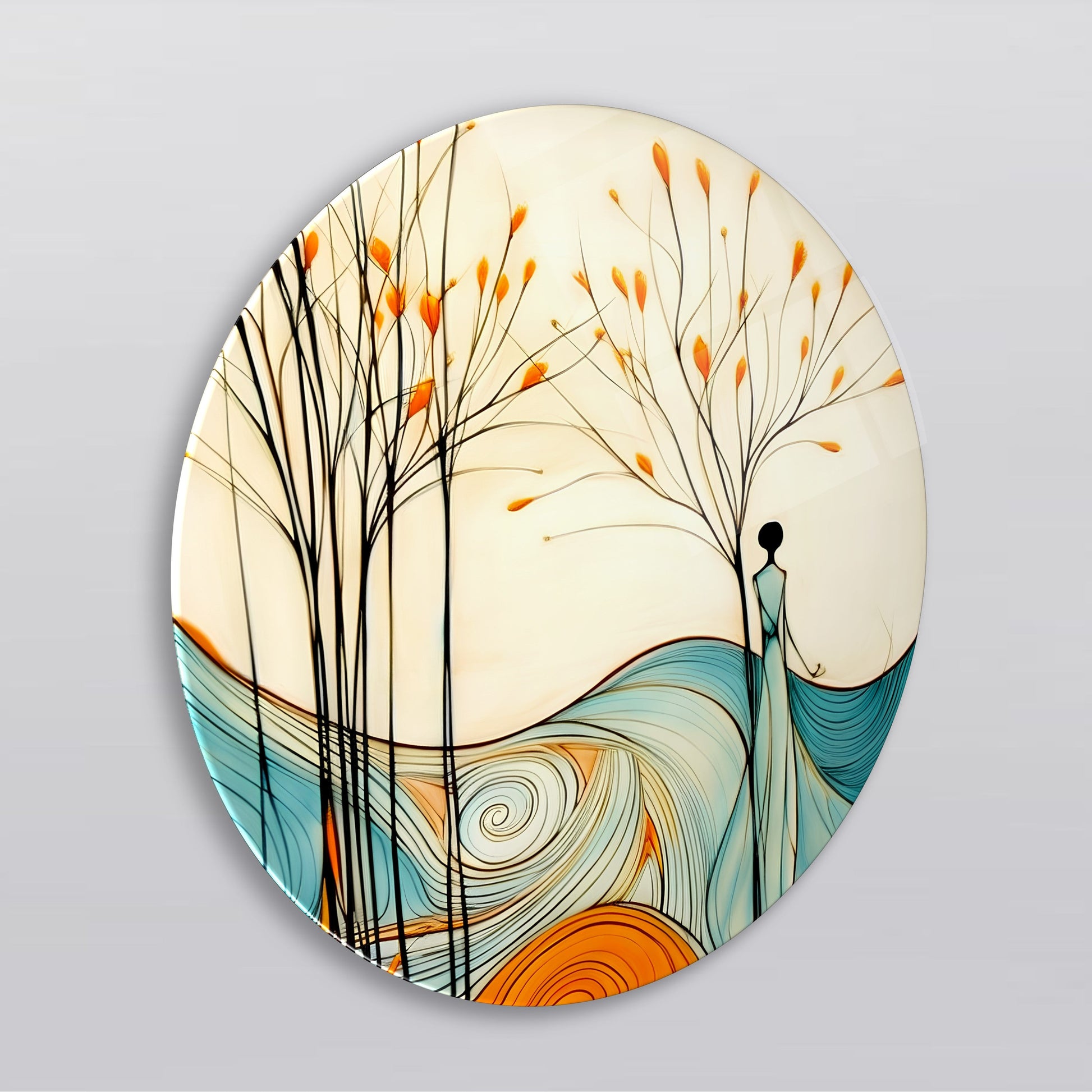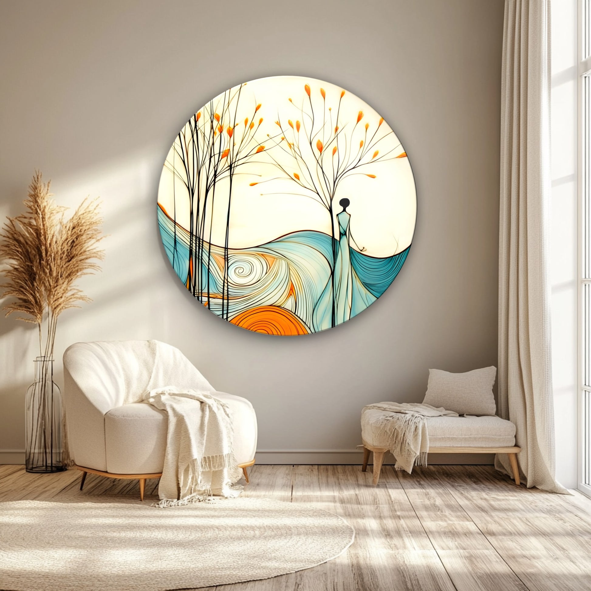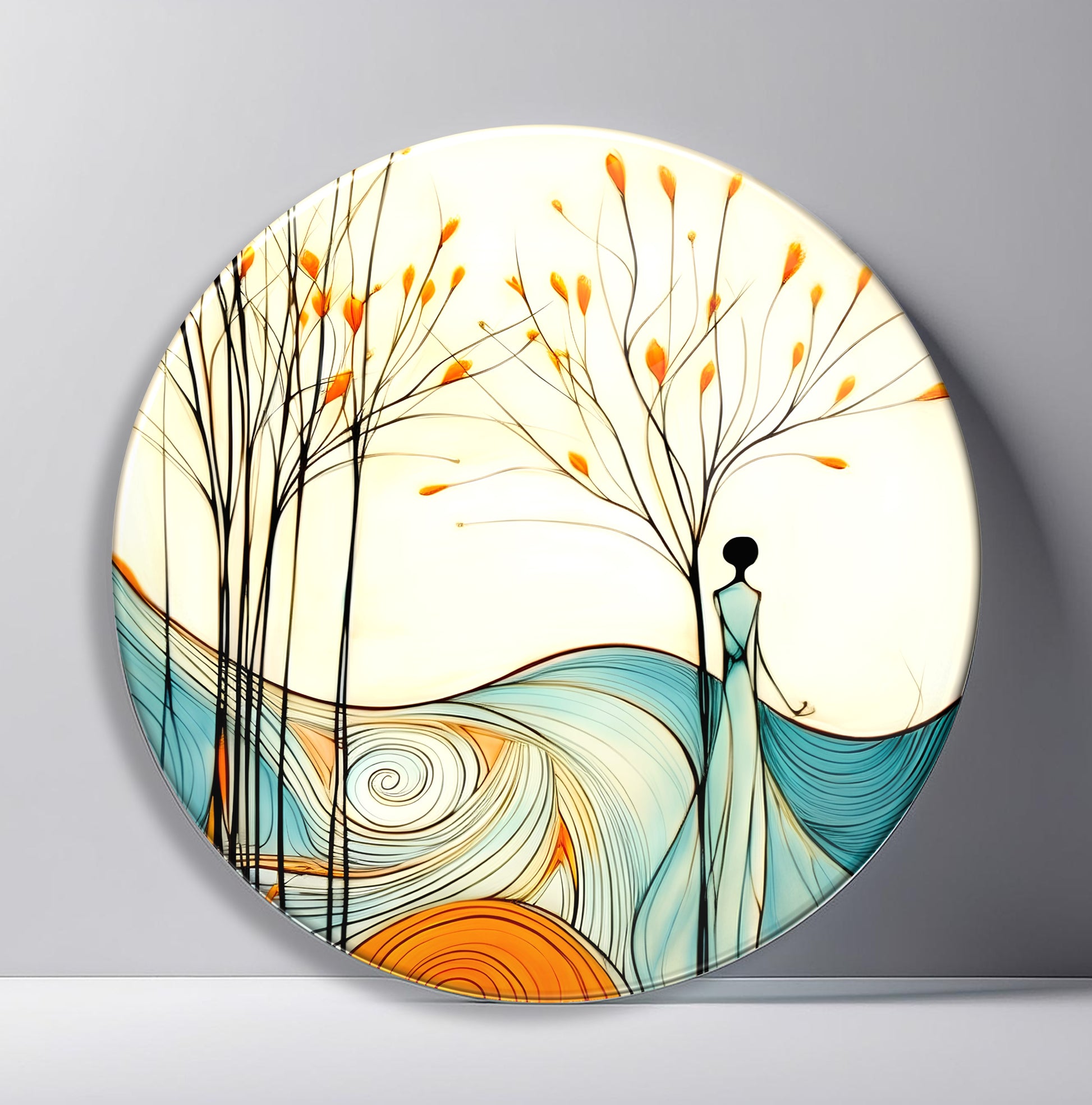 Kadın ve Soyut Manzara Yuvarlak Cam Tablo