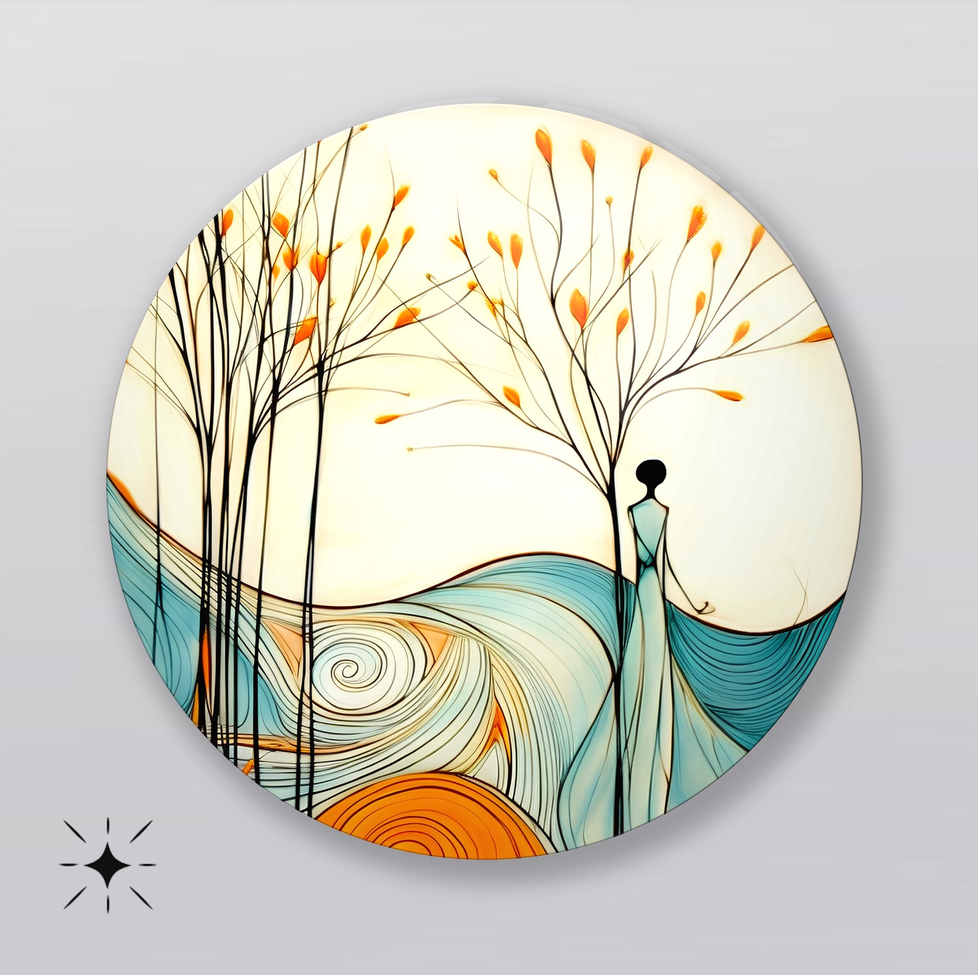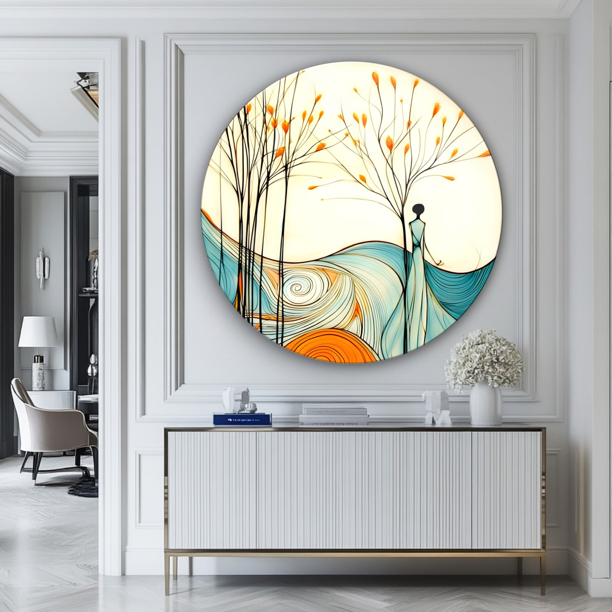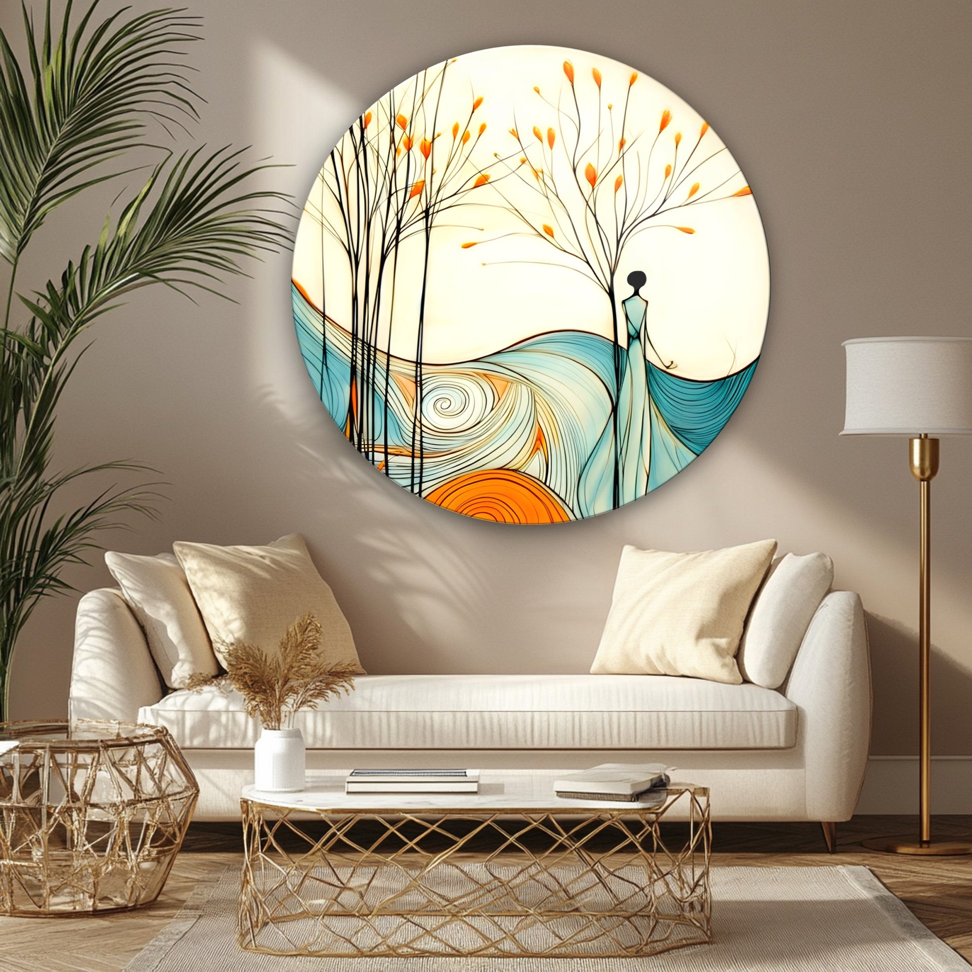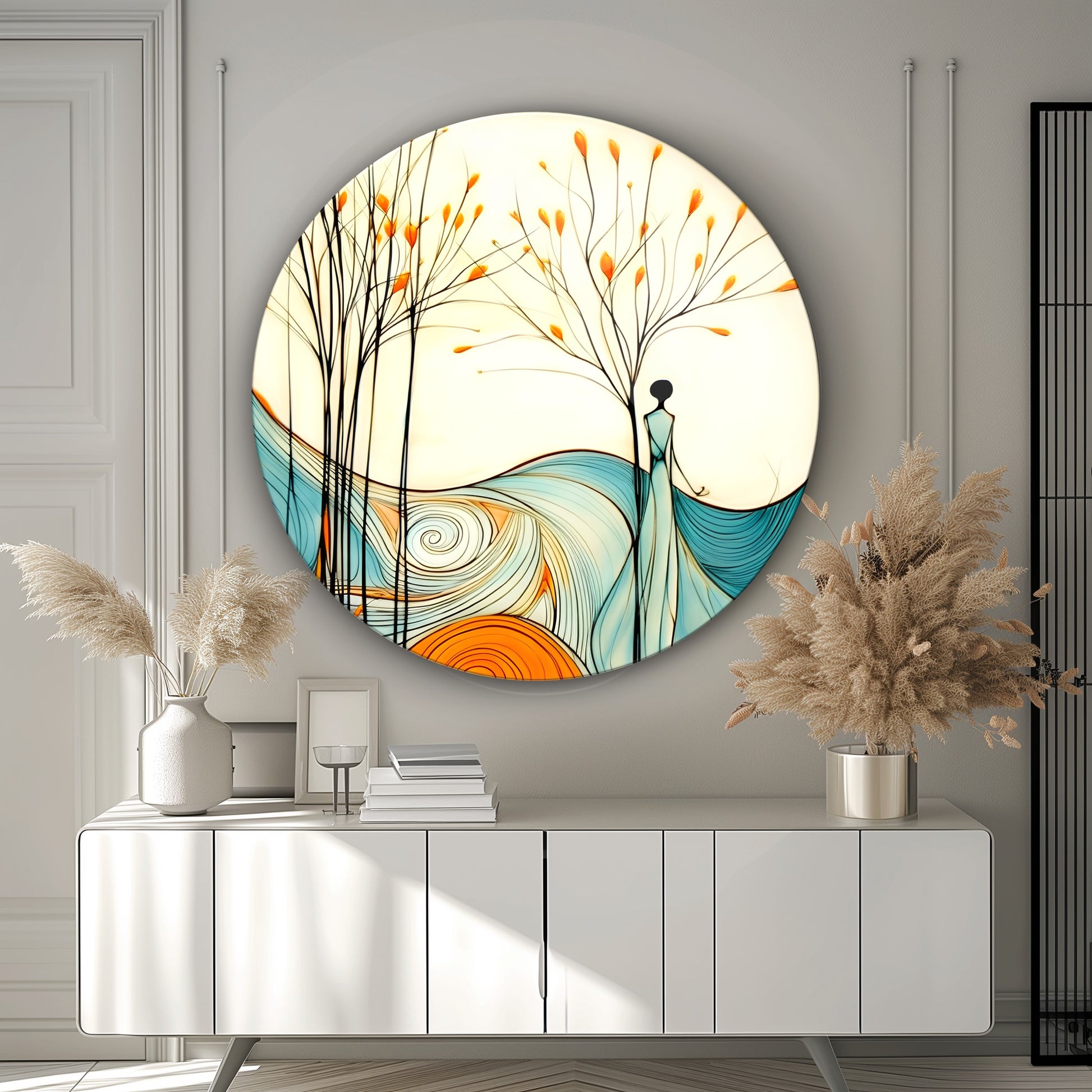 Kadın ve Soyut Manzara Yuvarlak Cam Tablo