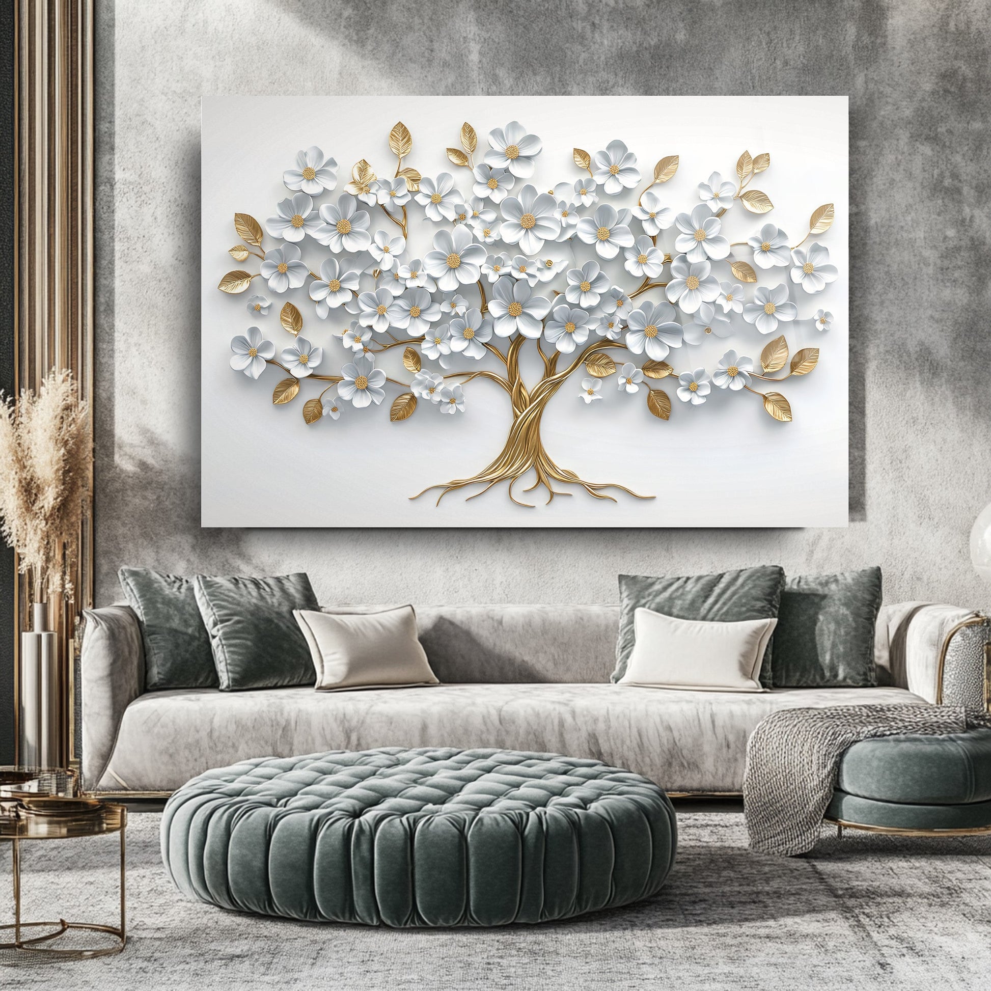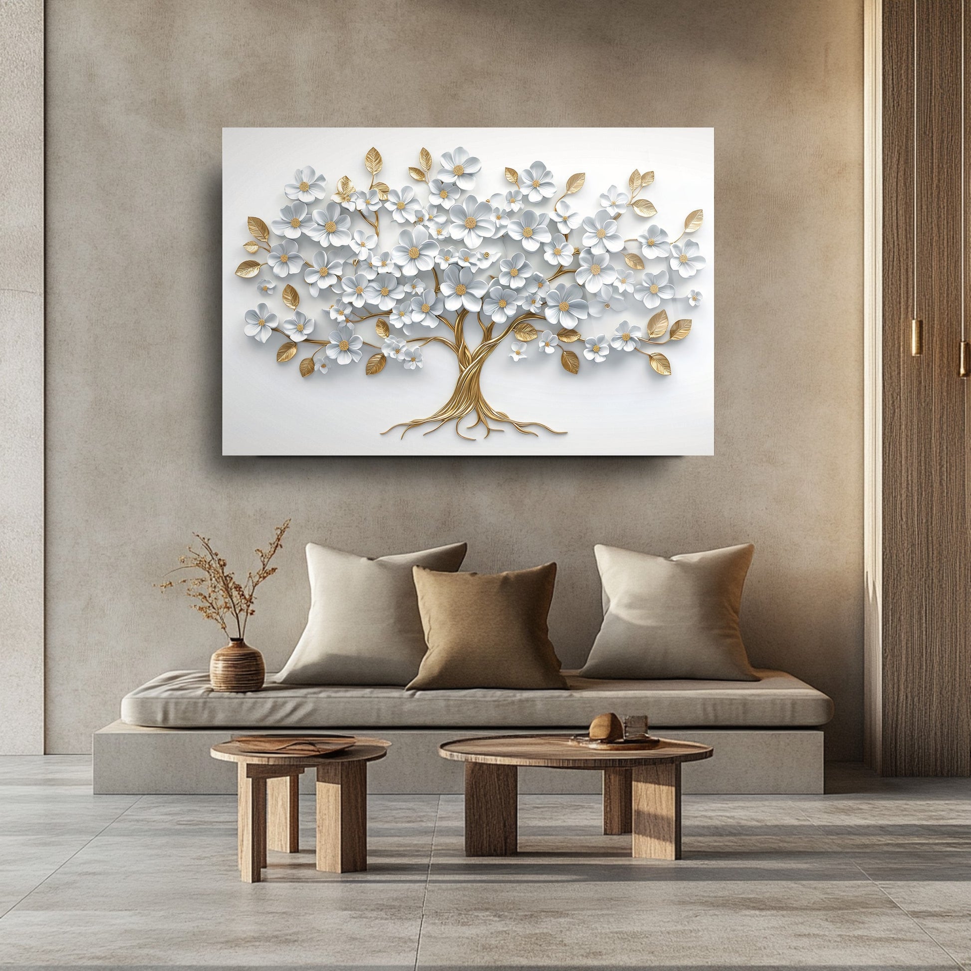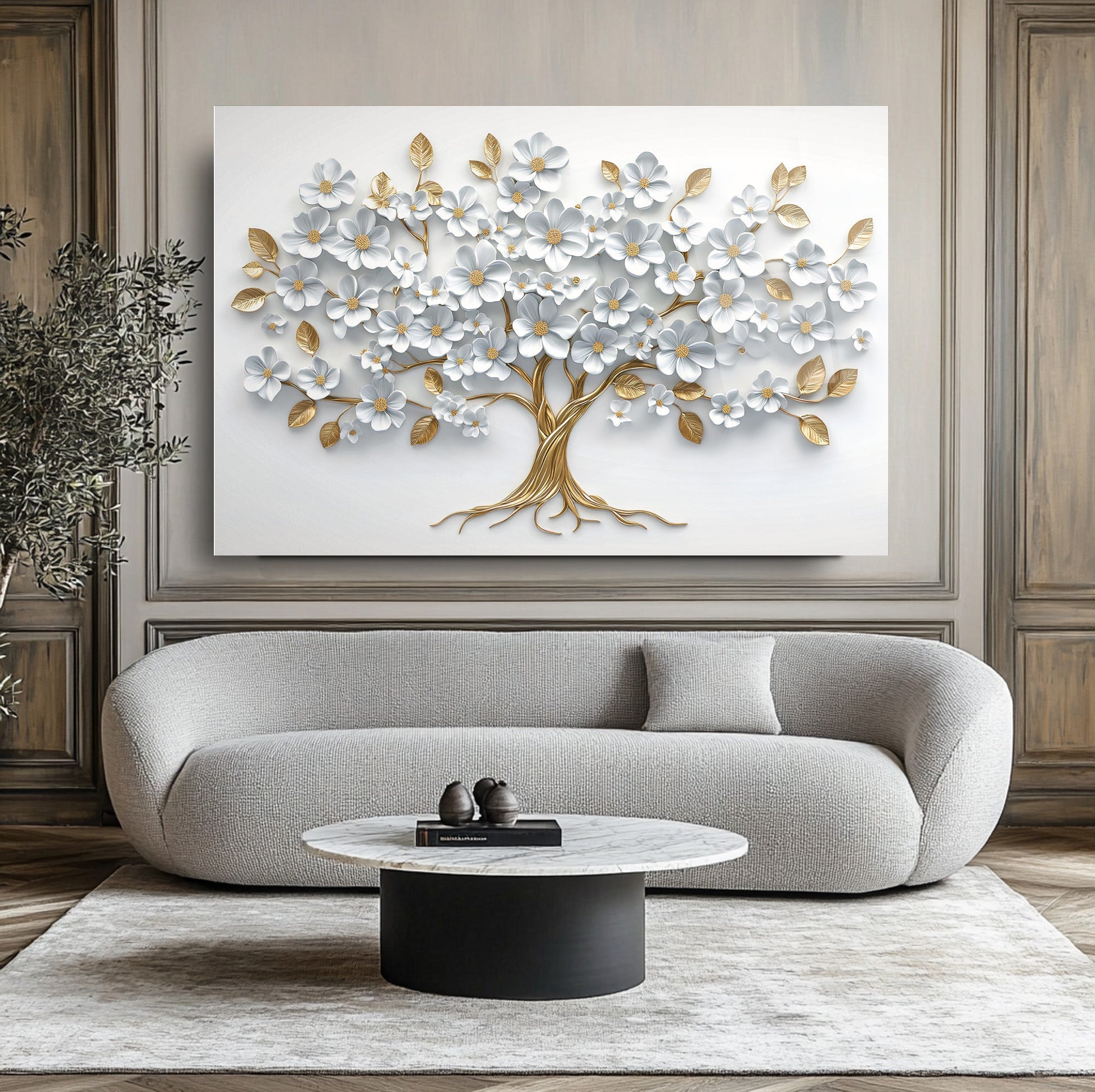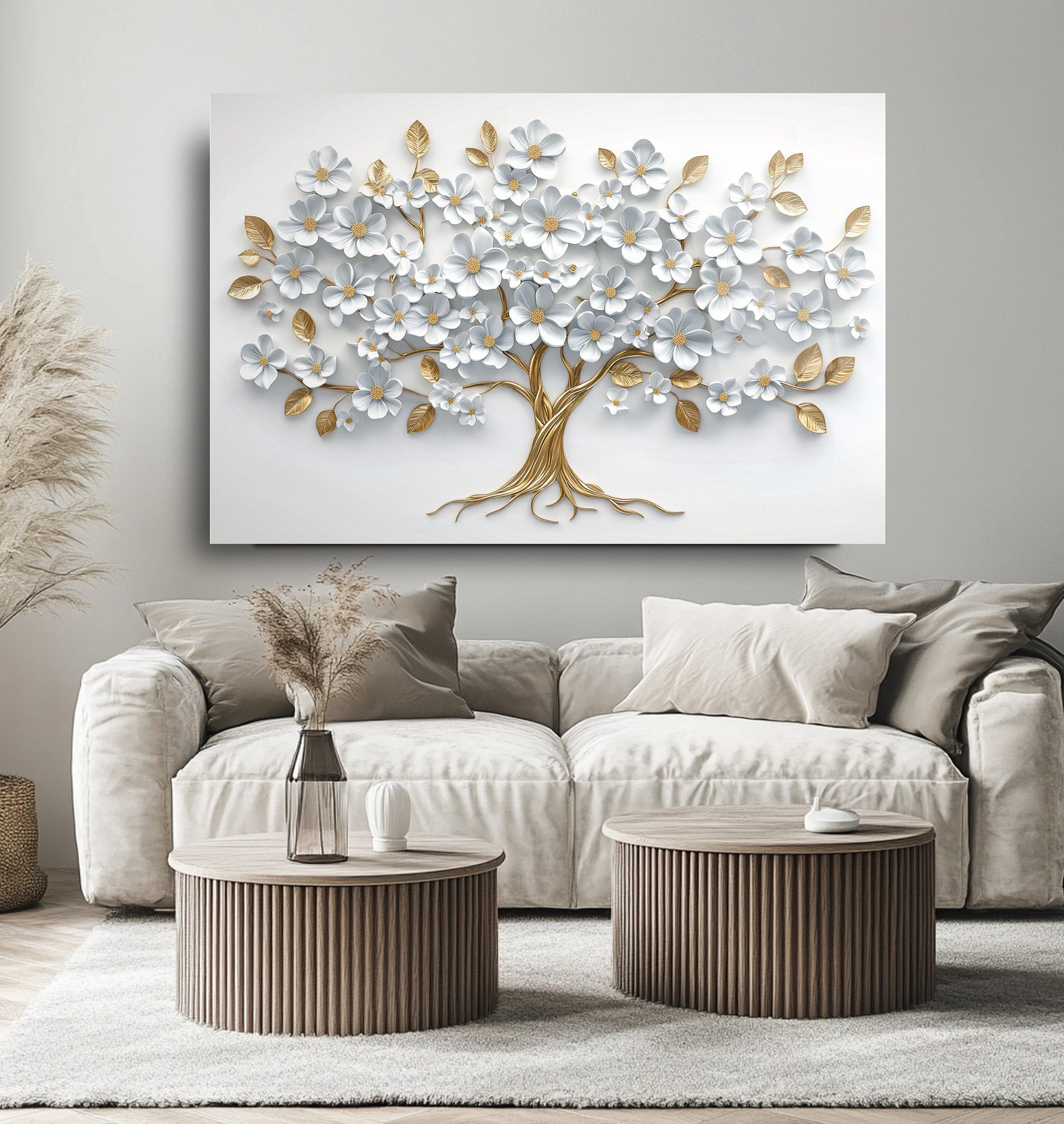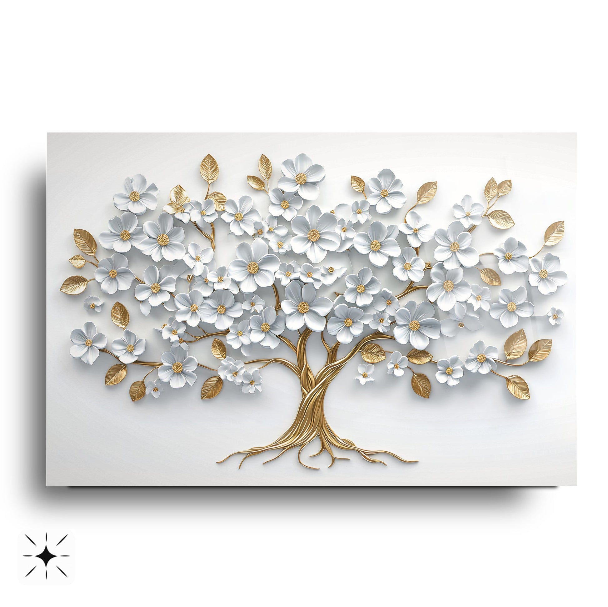 Mekanlarınıza Canlılık ve Dönüşüm Katın: Kelebekli Beyaz Gold Hayat Ağacı Cam Tablo