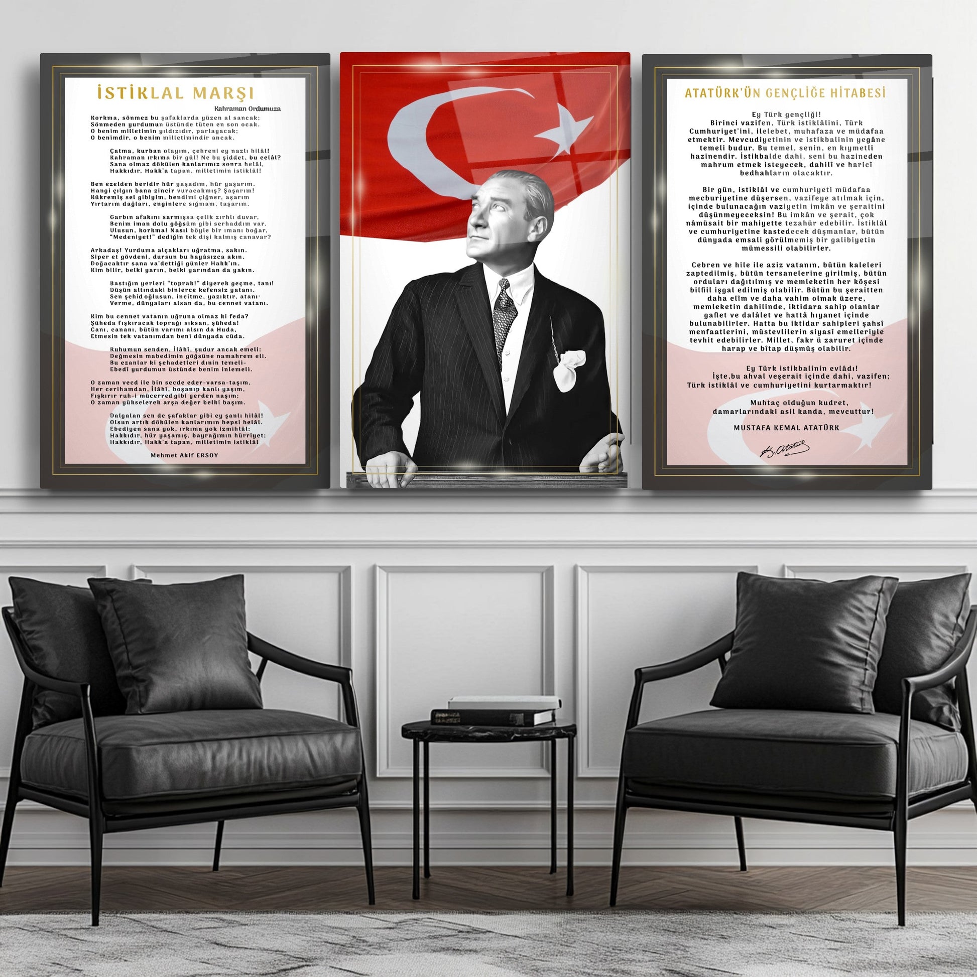 Kolejler, okullar, makam odaları ve ofisler için özel olarak tasarlanmış bu modern üçlü set cam tablo ile mekanlarınıza milli bir kimlik kazandırın. Okul Atatürk köşesi ve makam odası dekorasyonu oluşturmak isteyenler için mükemmel bir seçim olan bu set, Türk Bayrağı'nın gururunu, İstiklal Marşı'nın coşkusunu ve Atatürk'ün Gençliğe Hitabesi'nin yol gösteren sözlerini bir araya getiriyor.