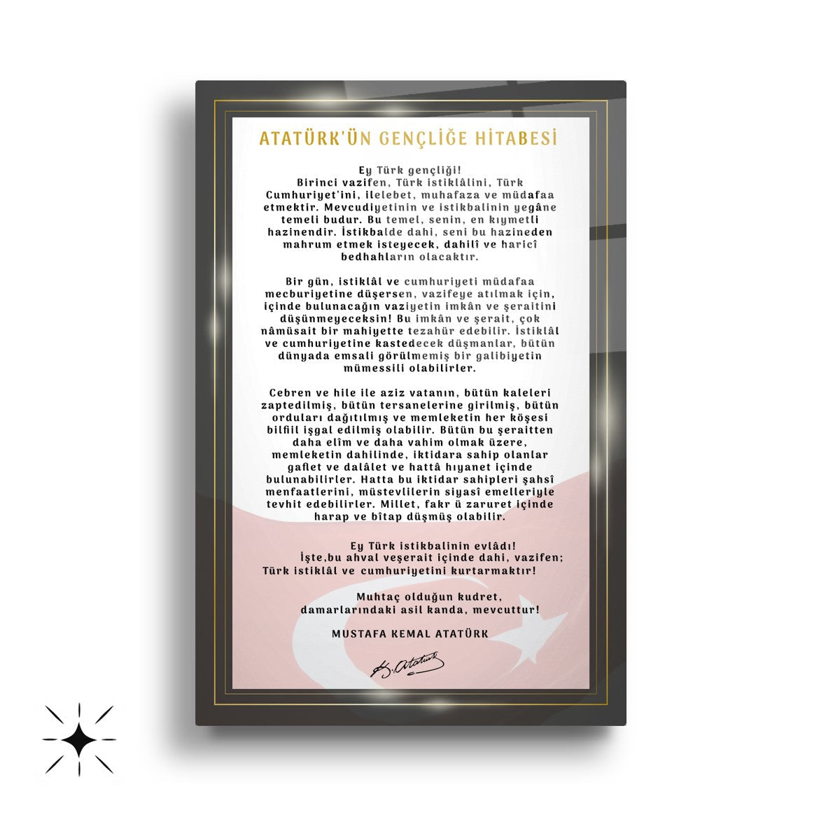 Bu set, sadece bir dekorasyon parçası olmanın ötesinde, bulunduğunuz ortama derin bir anlam katar. Her baktığınızda ay yıldızlı bayrağımızın asaletini, milli marşımızın anlam dolu dizelerini ve Büyük Önder'in gençliğe olan sonsuz güvenini hissedersiniz. Okul duvar dekorasyonunuzu veya ofisinizdeki makam odanızı bu anlamlı setle zenginleştirerek, çalışanlarınıza, ziyaretçilerinize ve öğrencilerinize milli bilinç aşılayın.