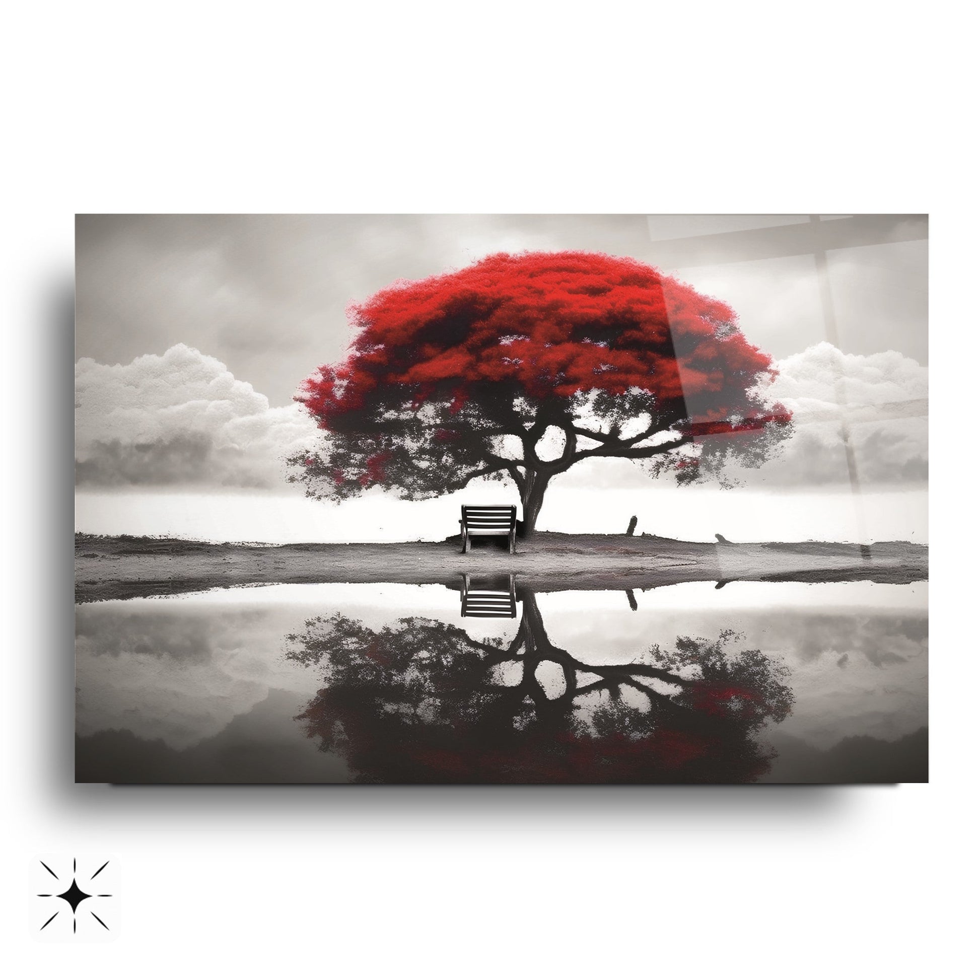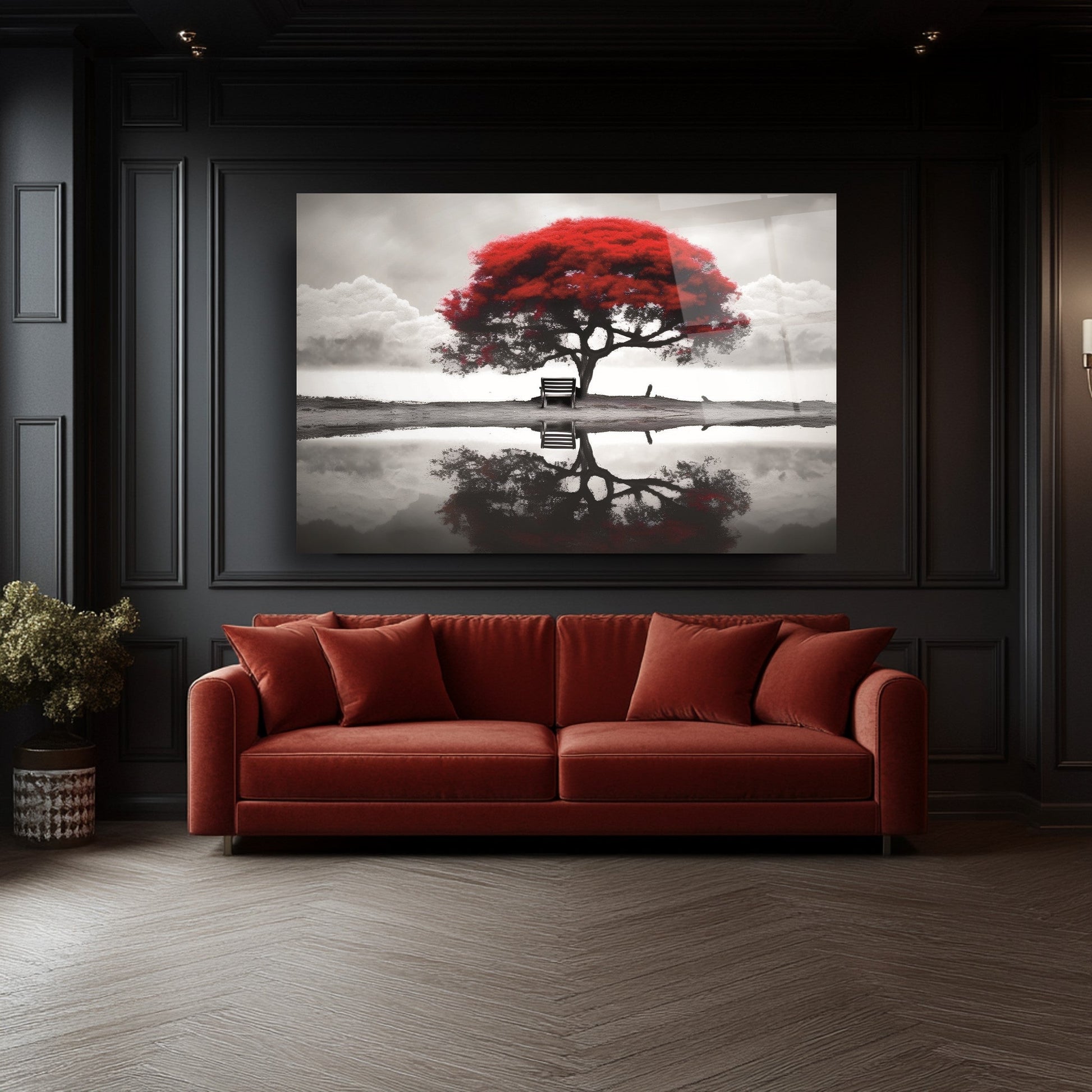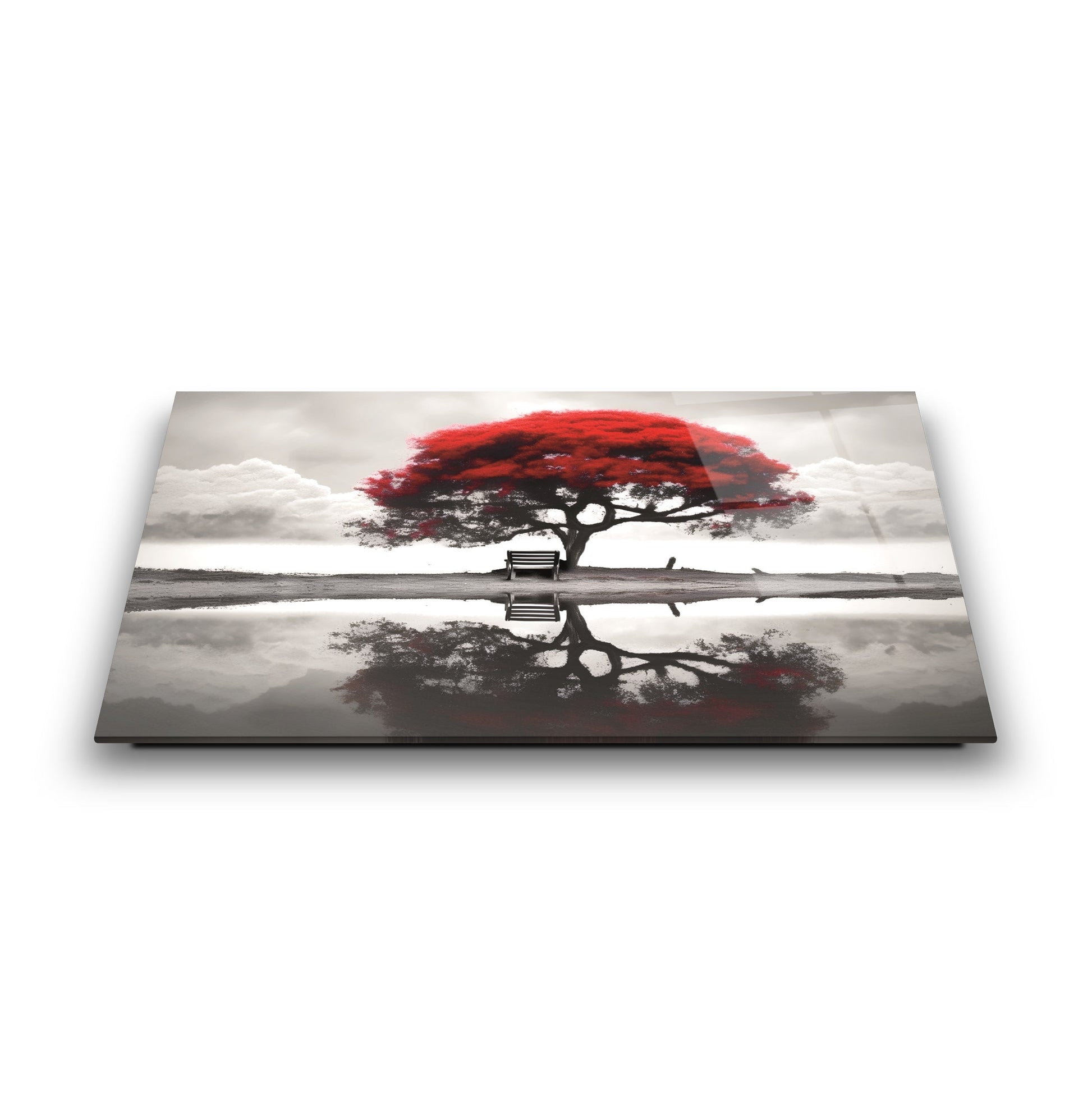 Mekanlarınıza Kırmızı Tonlarda Bir Yaşam: Kırmızı Hayat Ağacı Göl Manzarası Cam Tablo
