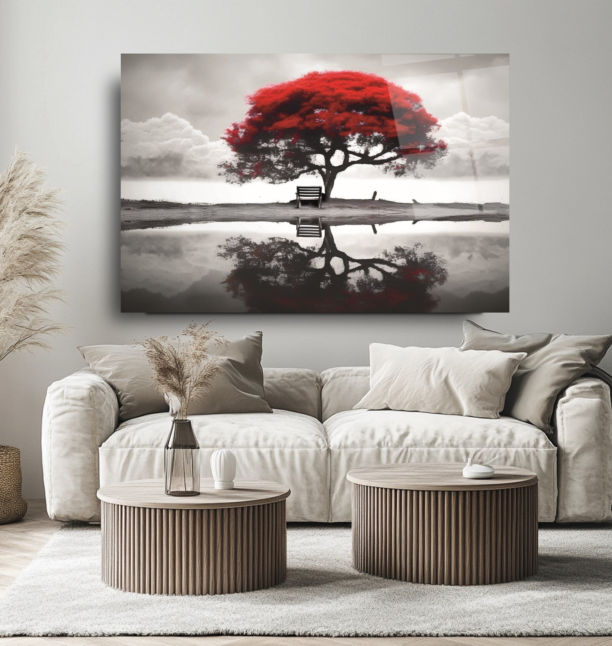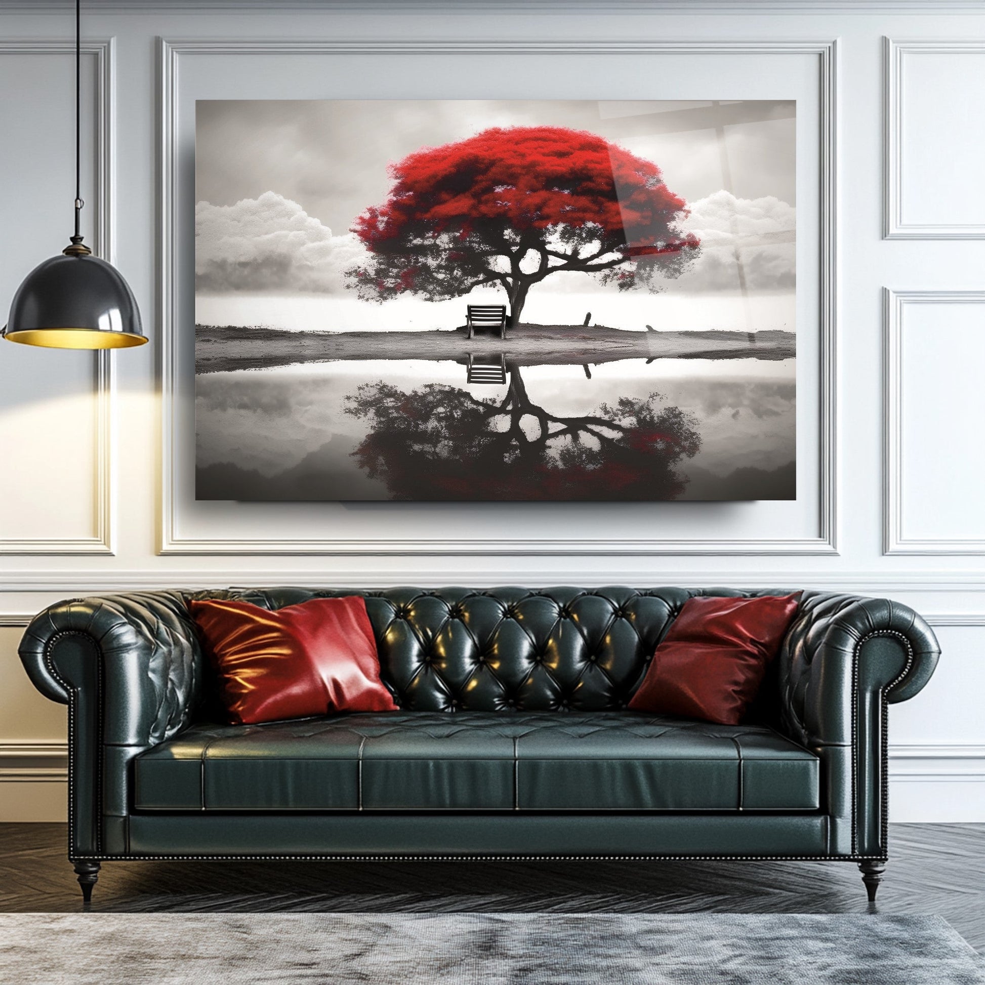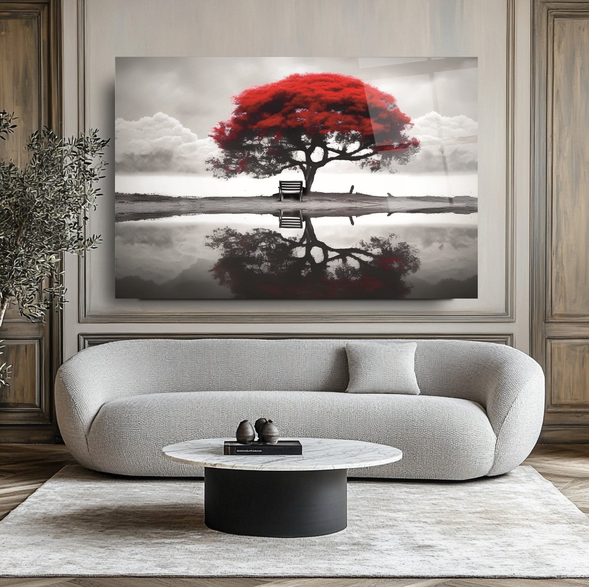 Mekanlarınıza Kırmızı Tonlarda Bir Yaşam: Kırmızı Hayat Ağacı Göl Manzarası Cam Tablo