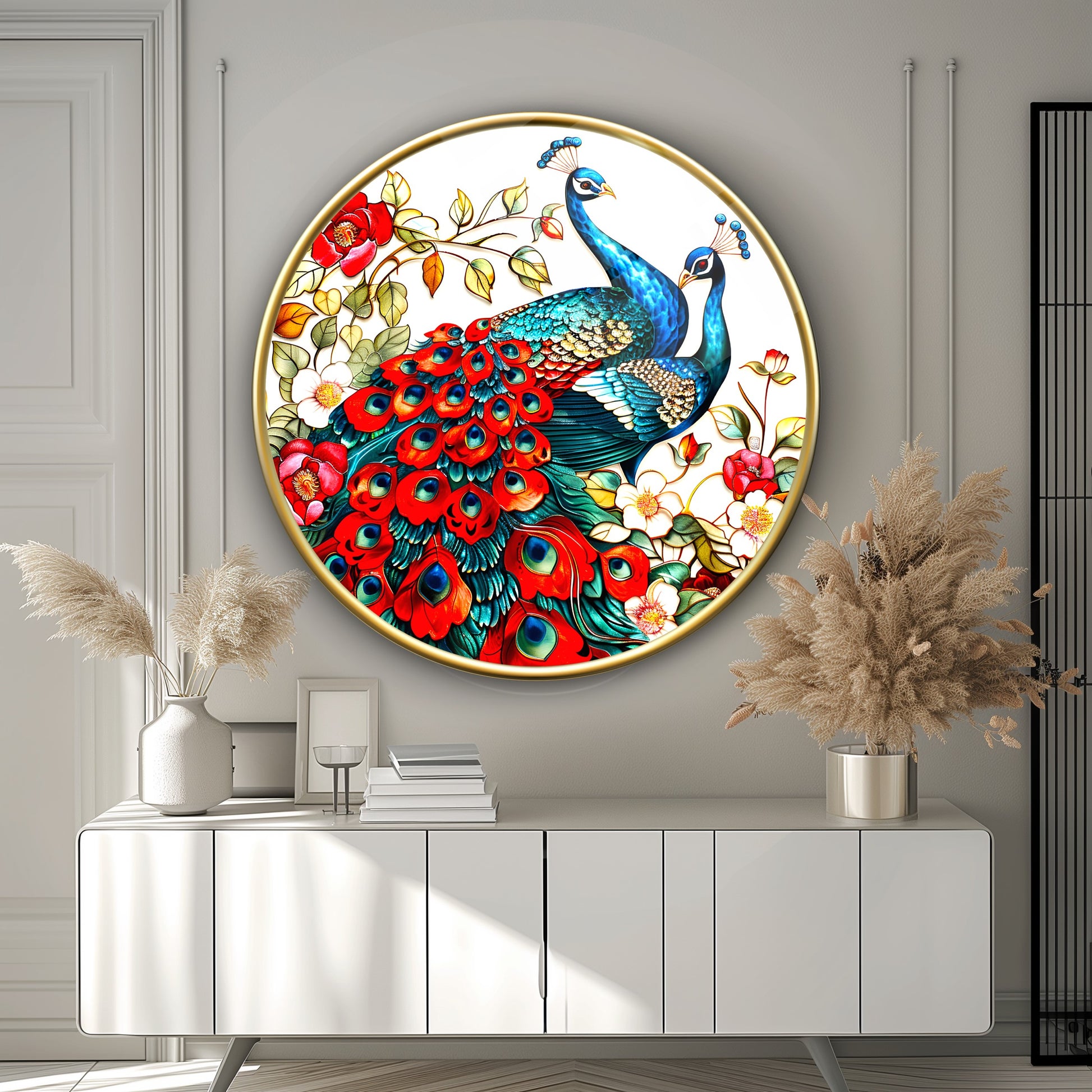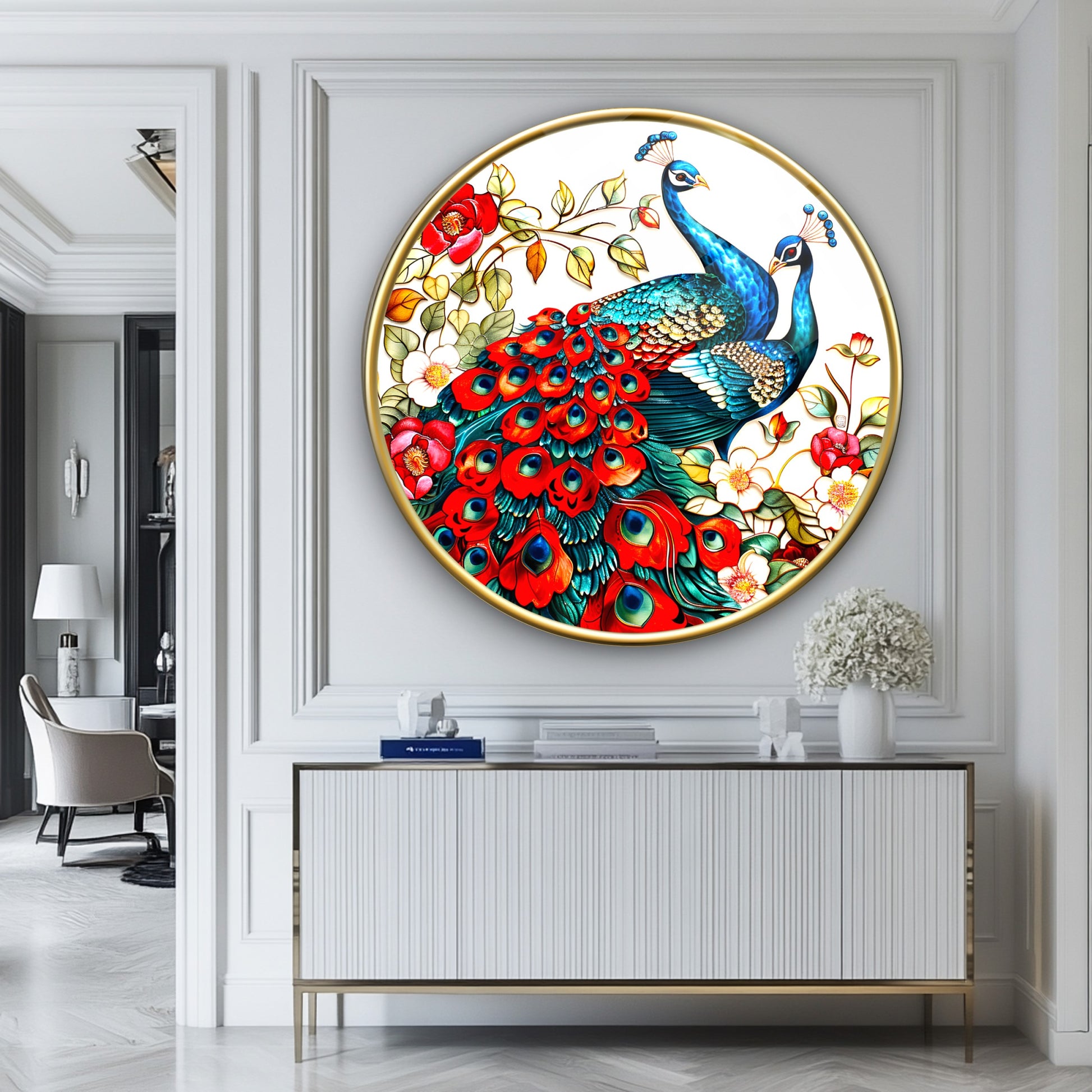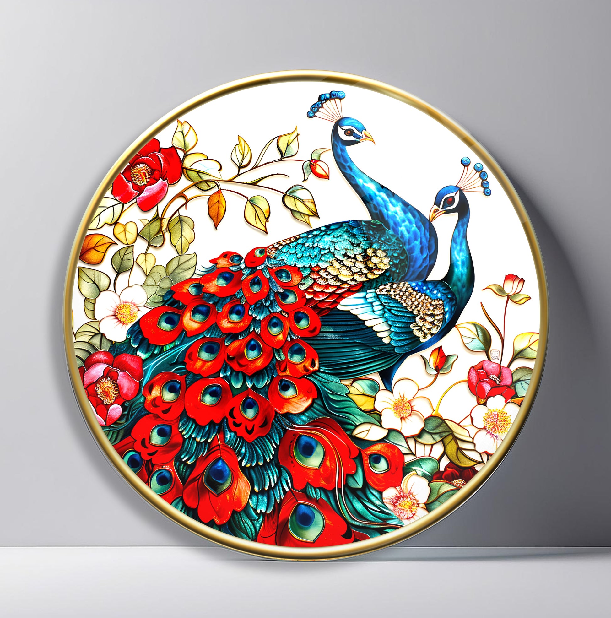 Kırmızı Çiçekli Tavus Kuşu Yuvarlak Cam Tablo