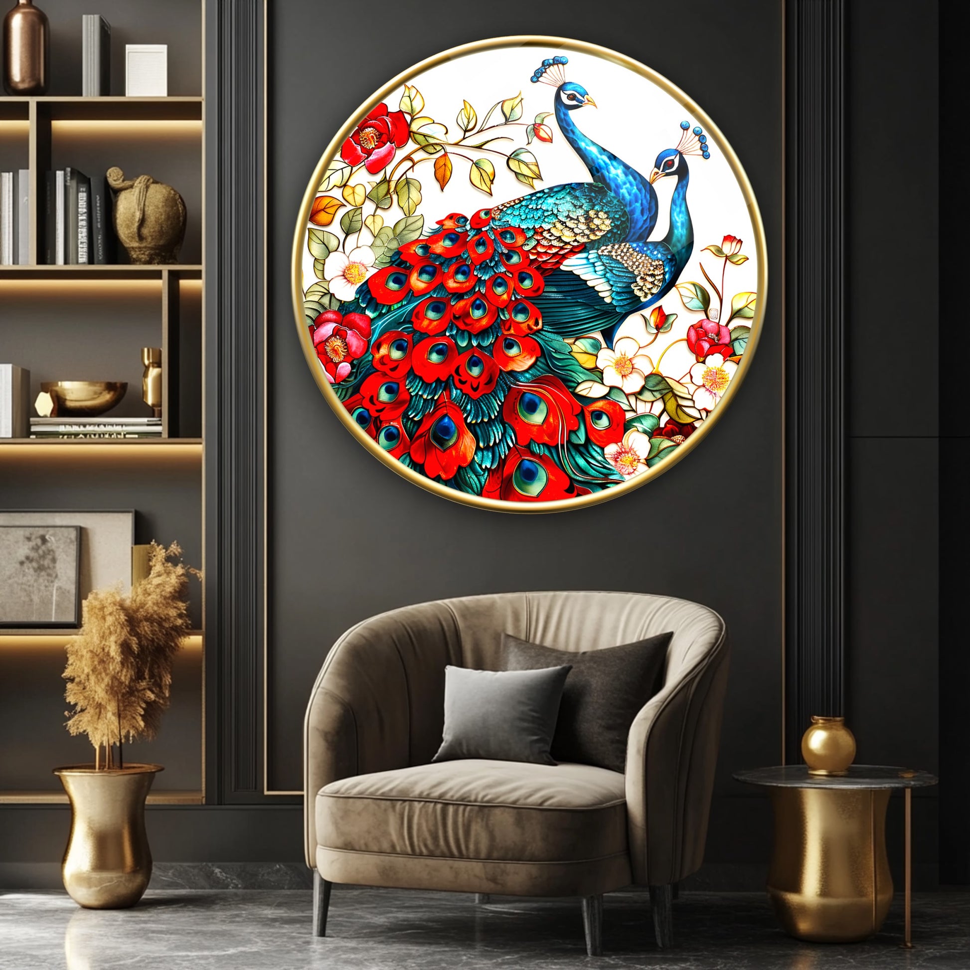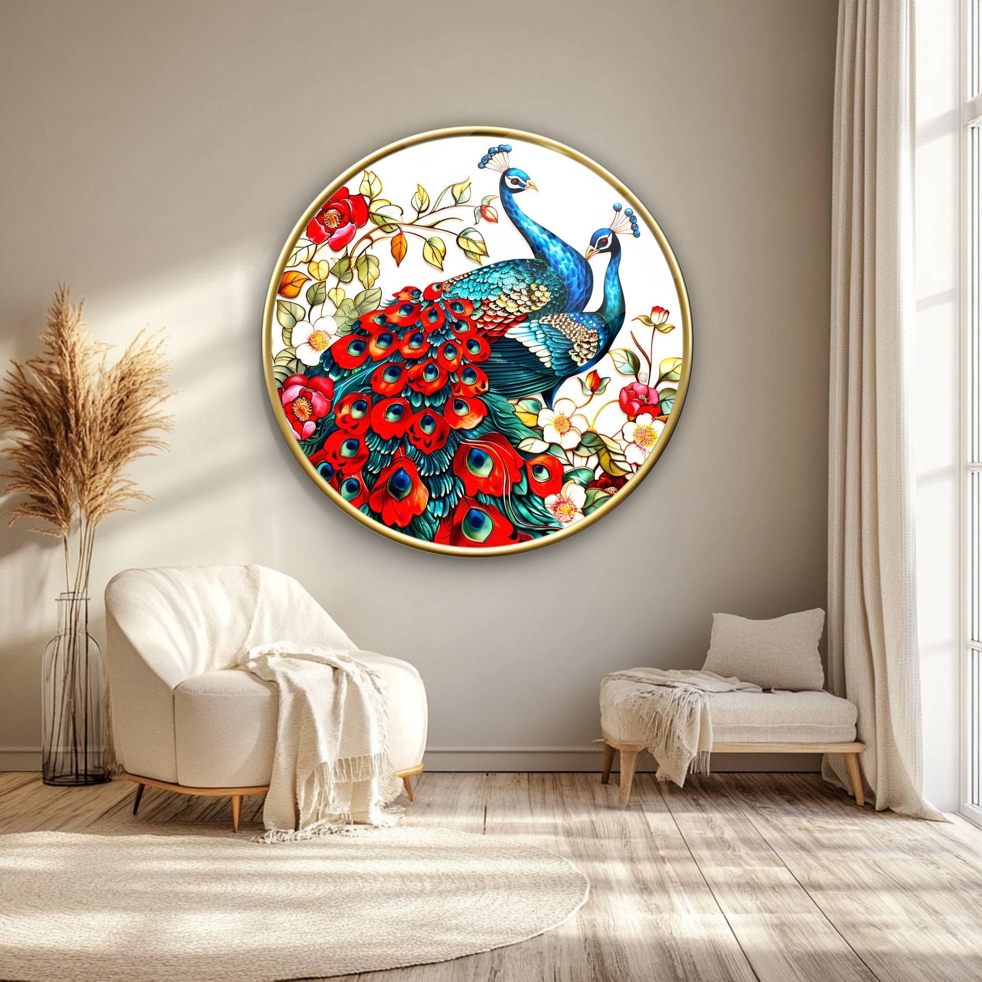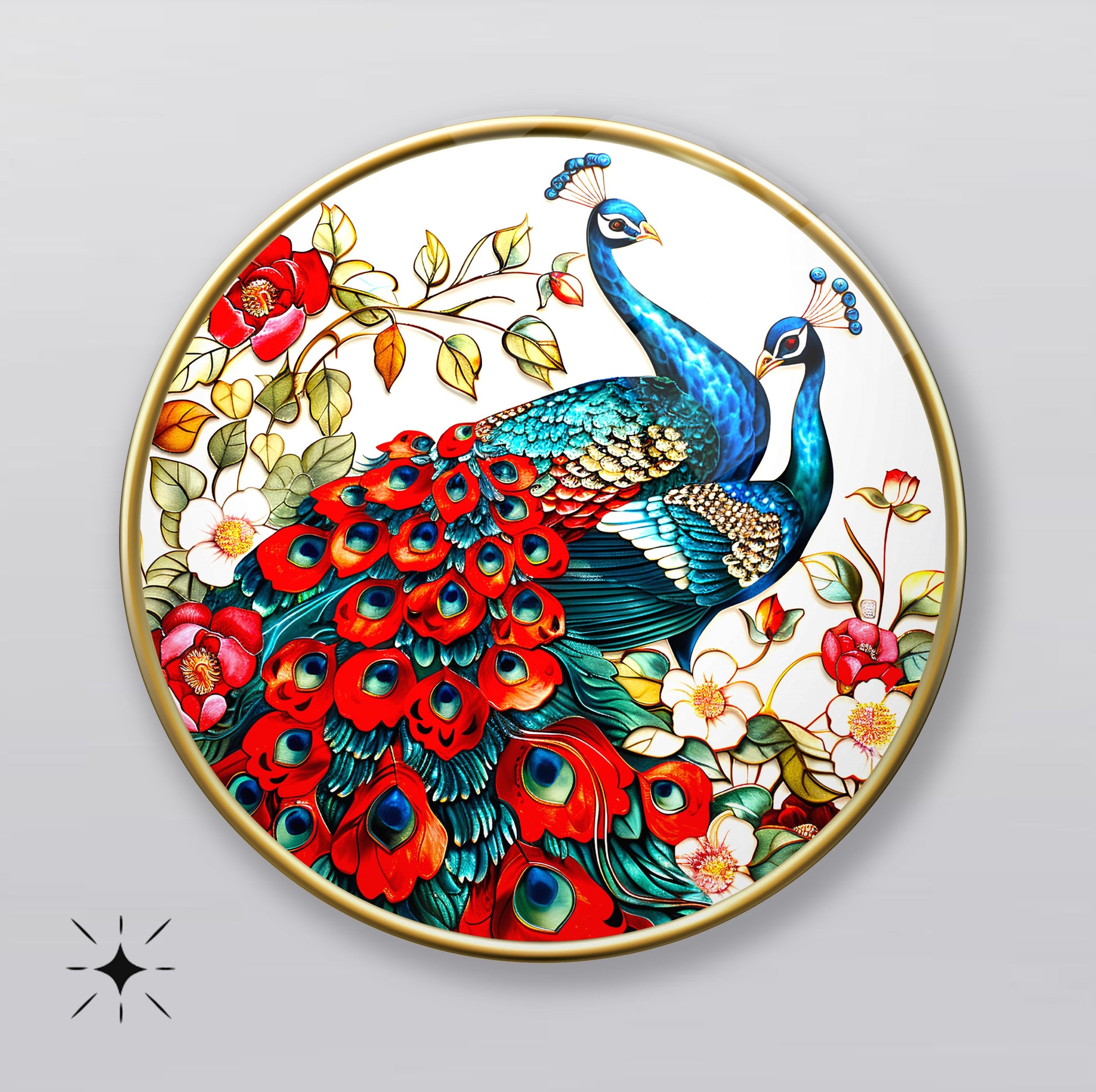 Kırmızı Çiçekli Tavus Kuşu Yuvarlak Cam Tablo