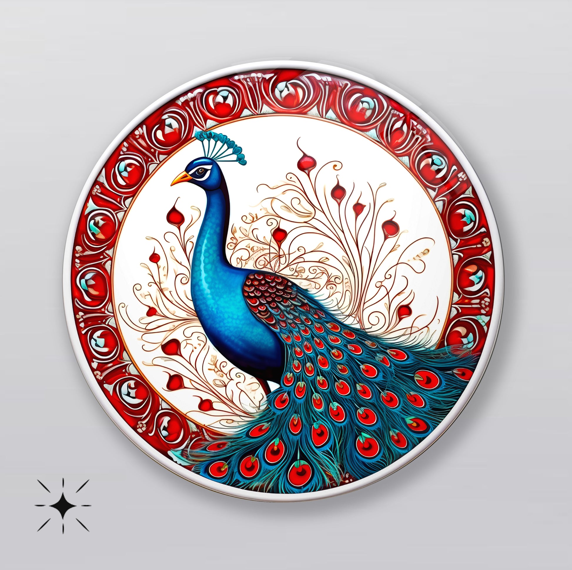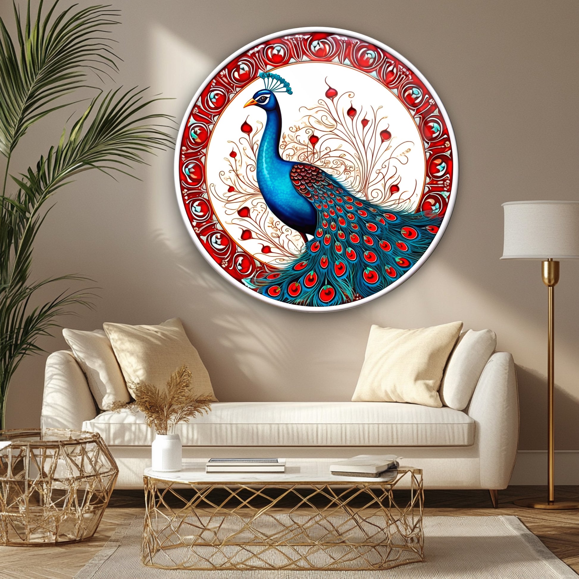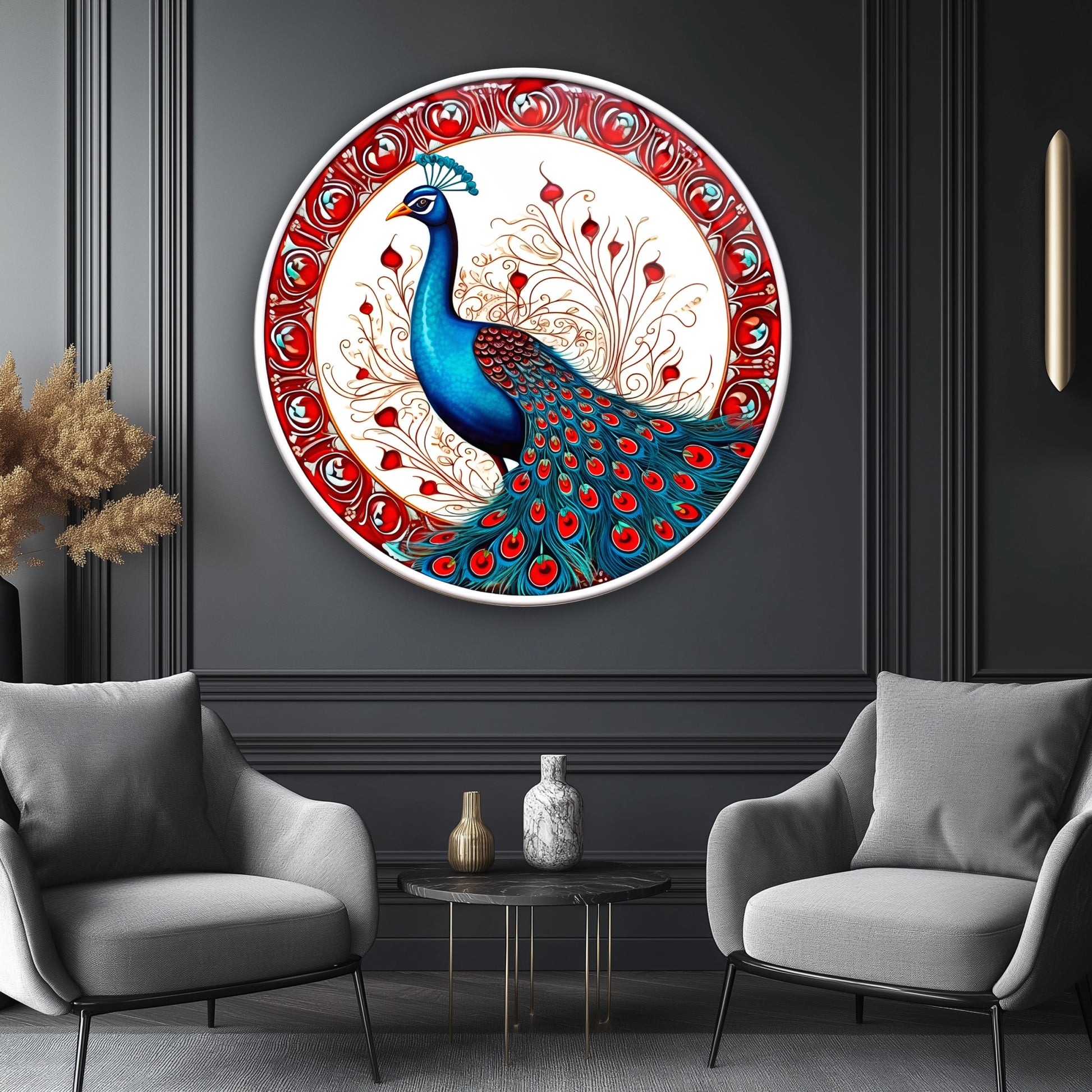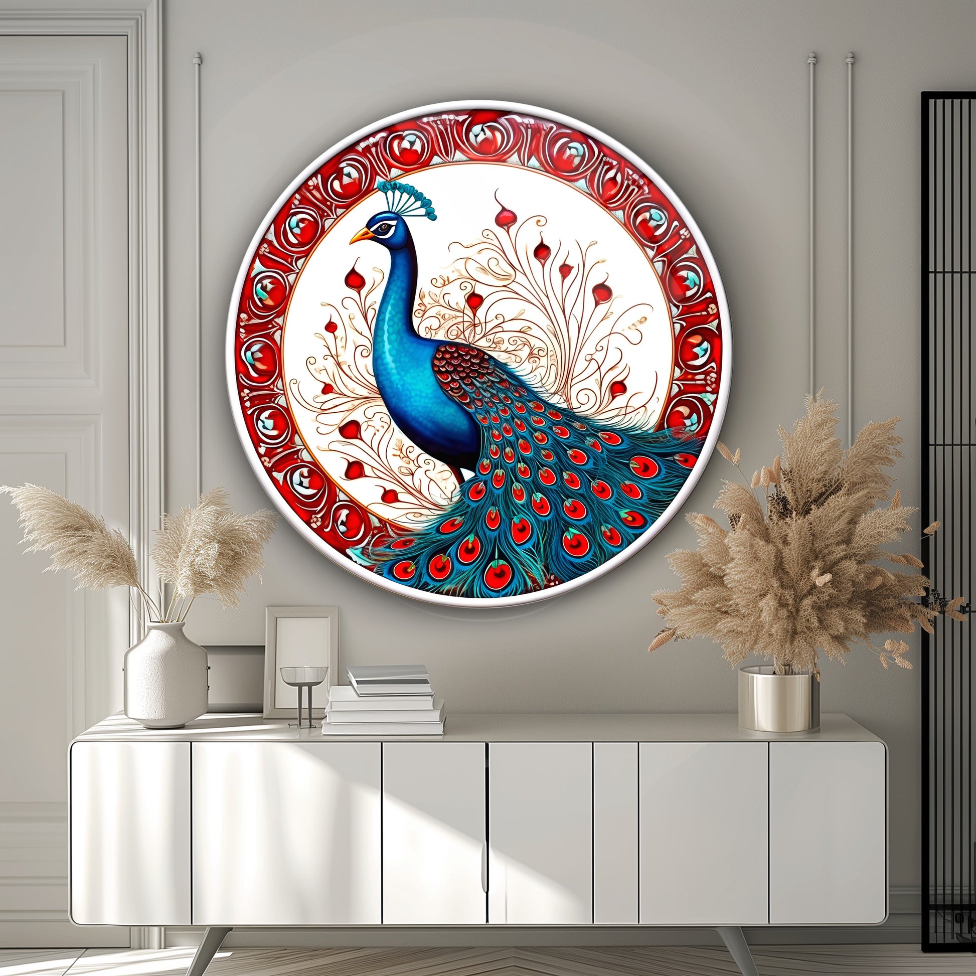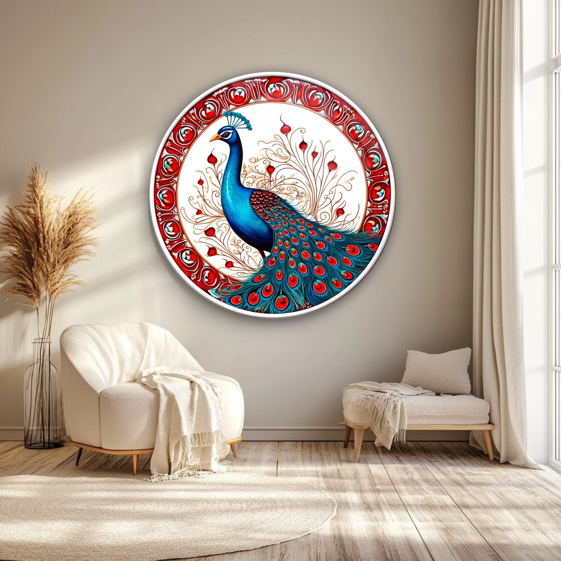 Kırmızı Çiçekli Tavus Kuşu Yuvarlak Cam Tablo