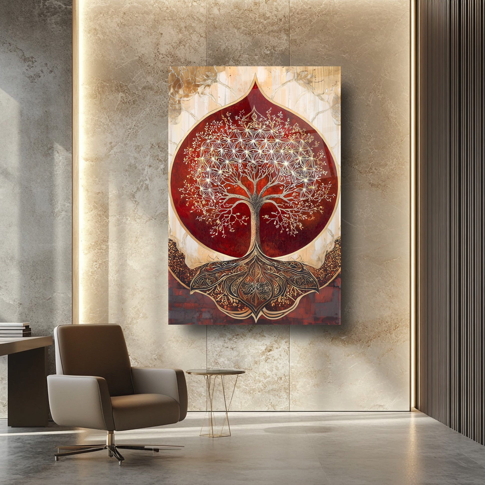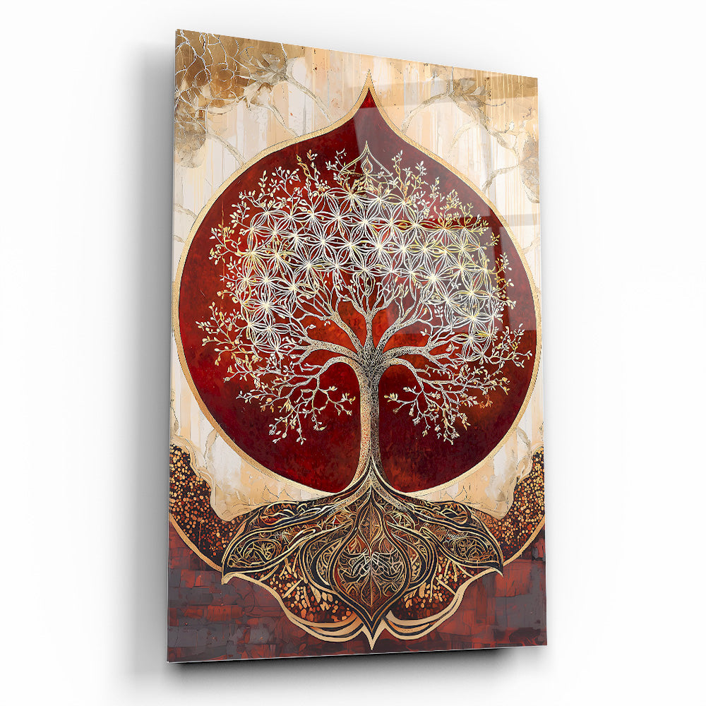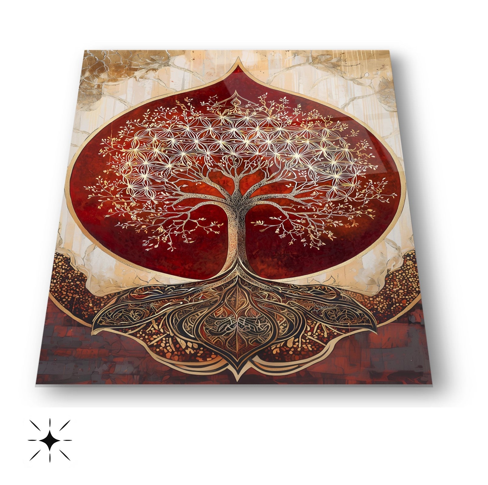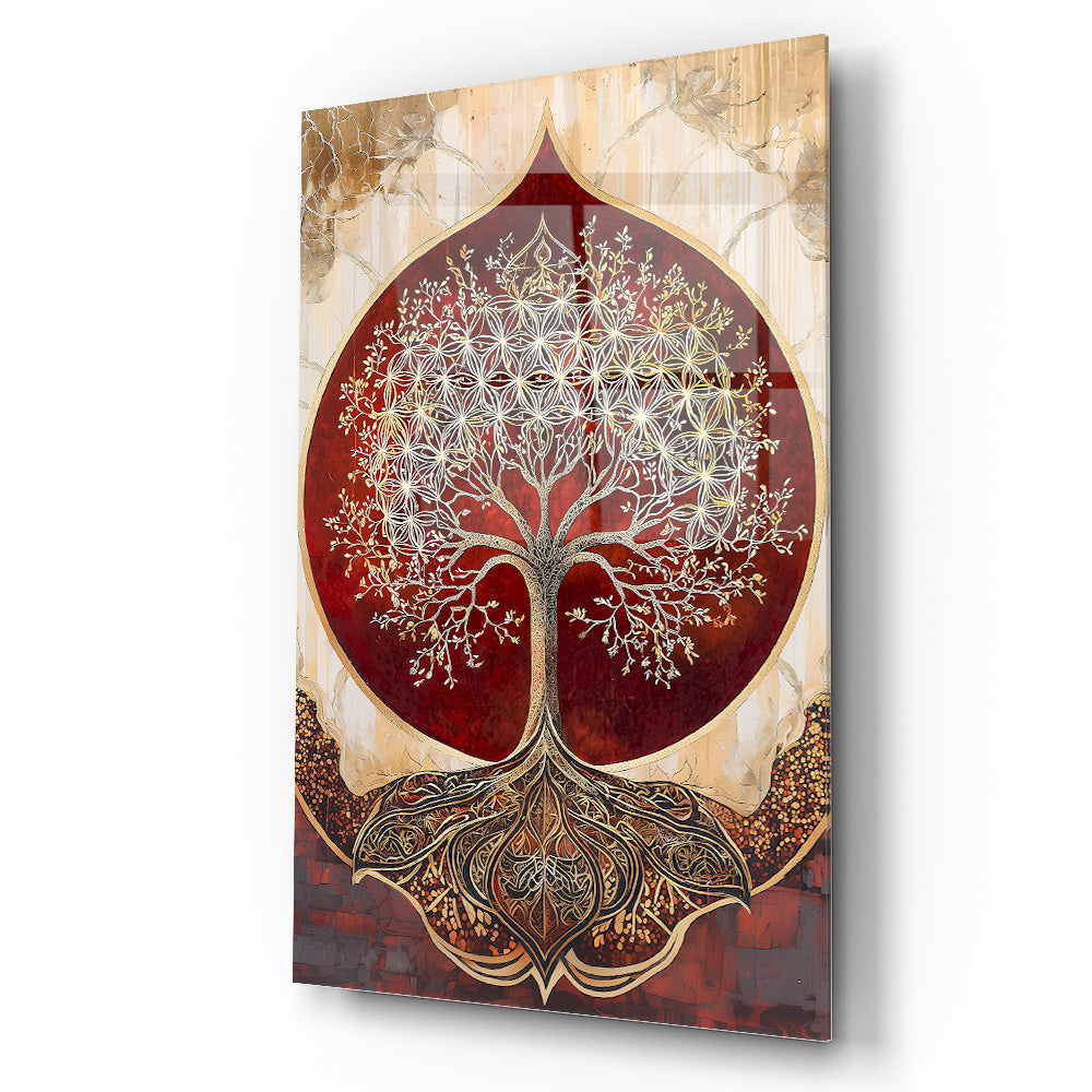 Mekanlarınıza Sanatsal Bir Canlılık: Kırmızı Detaylı Gold Hayat Ağacı Cam Tablo