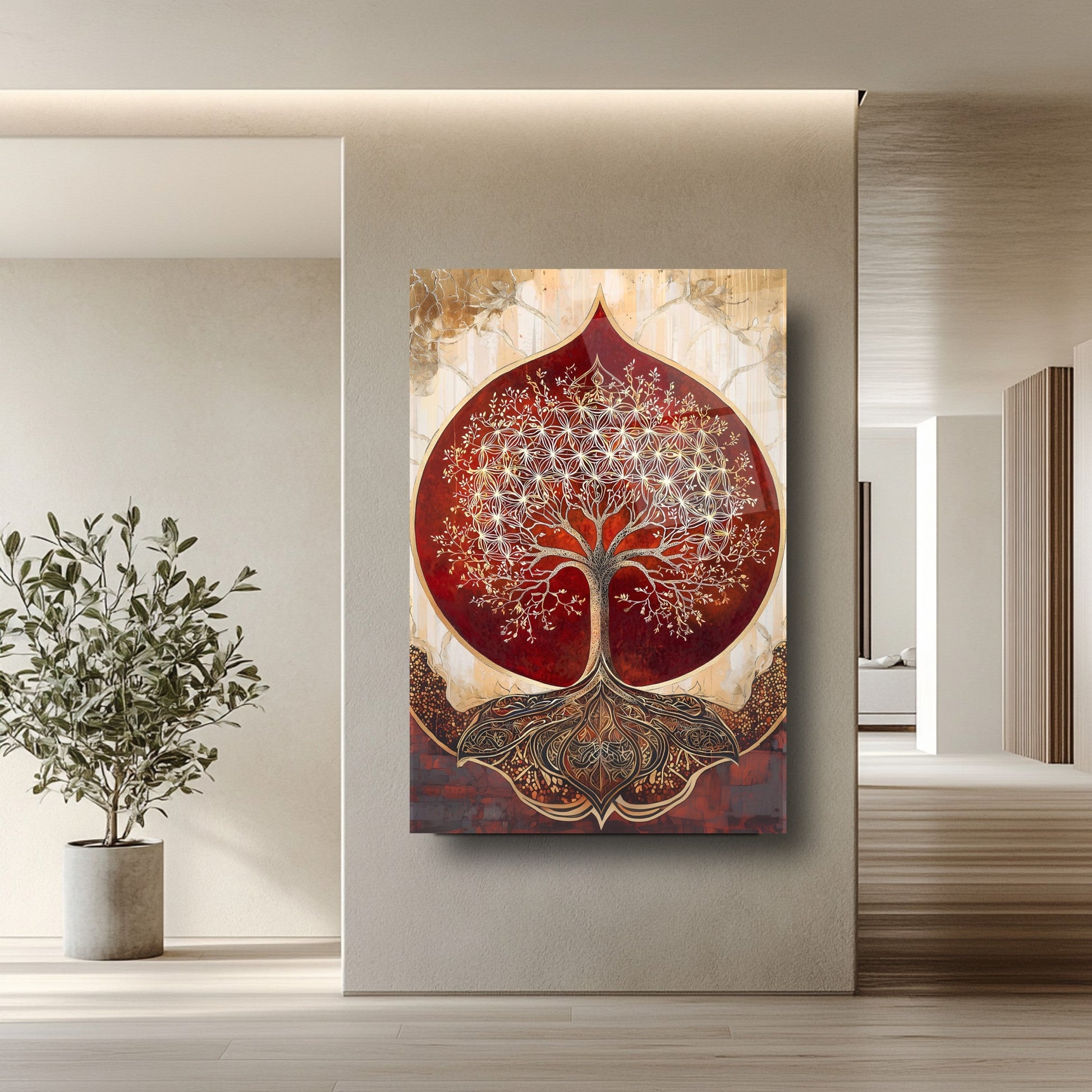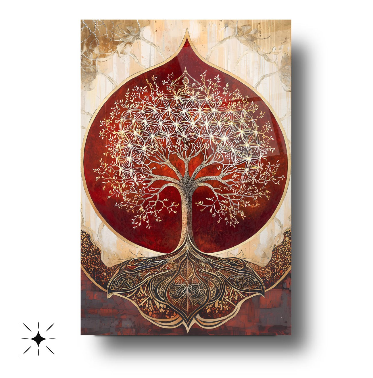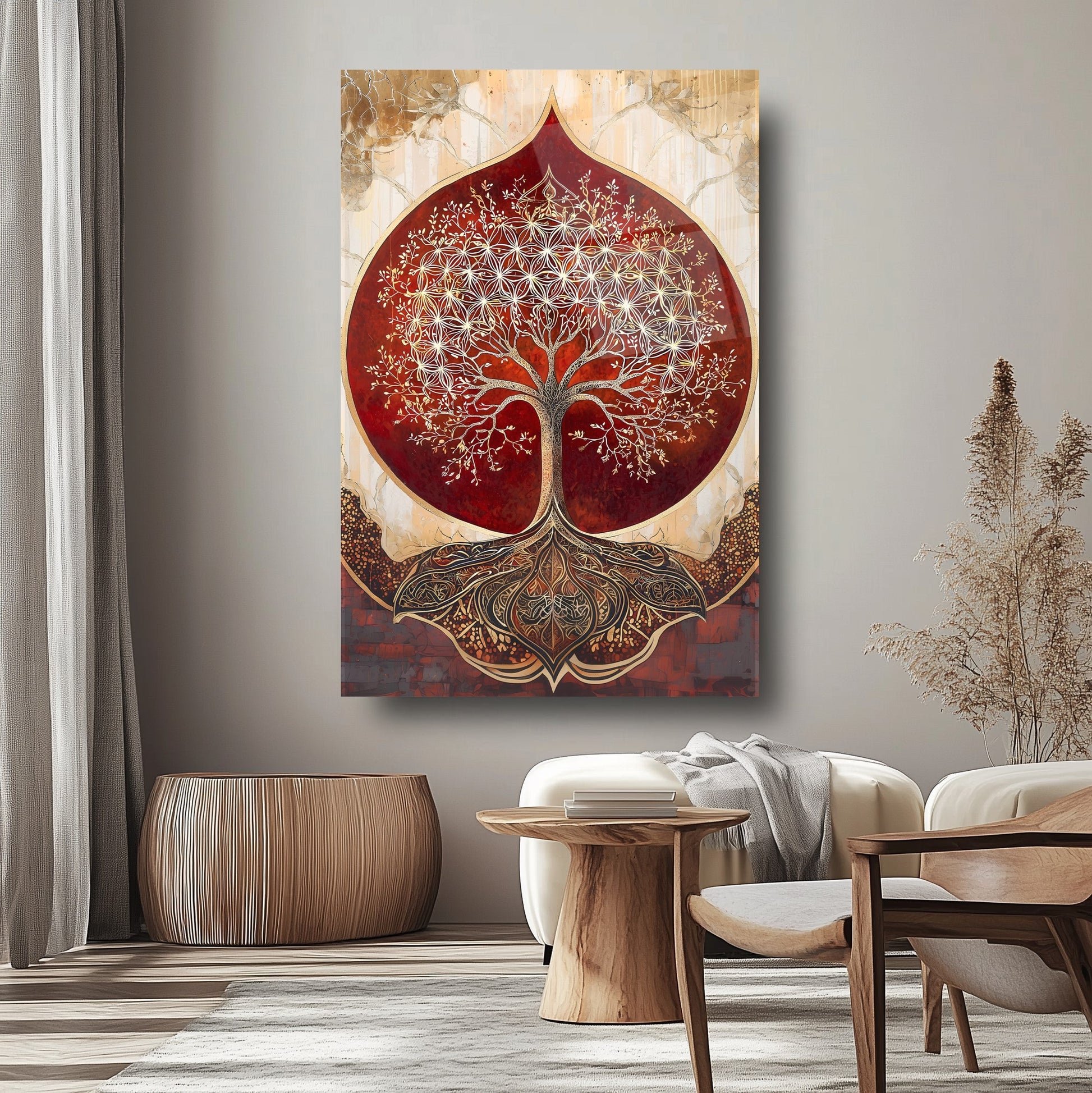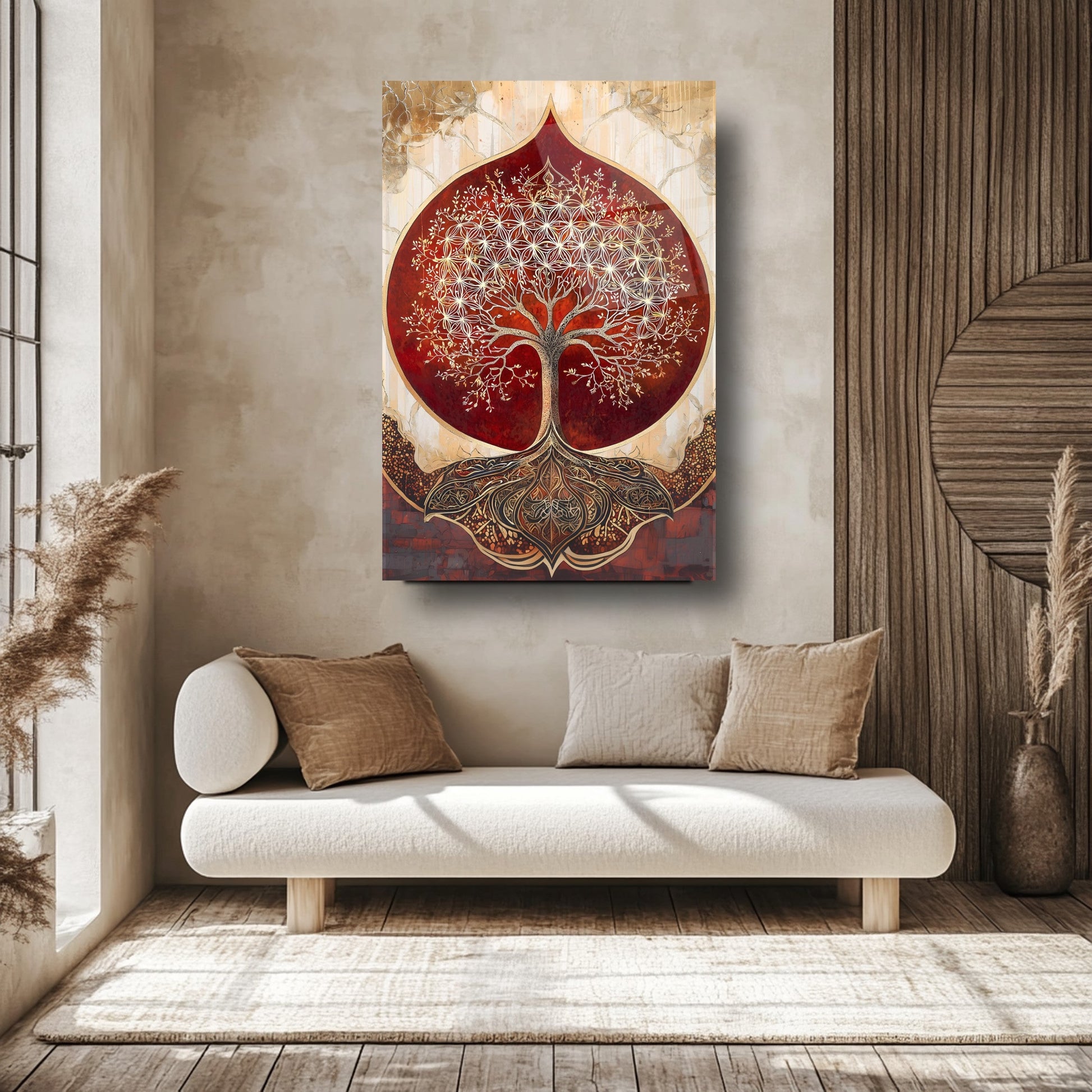 Mekanlarınıza Sanatsal Bir Canlılık: Kırmızı Detaylı Gold Hayat Ağacı Cam Tablo