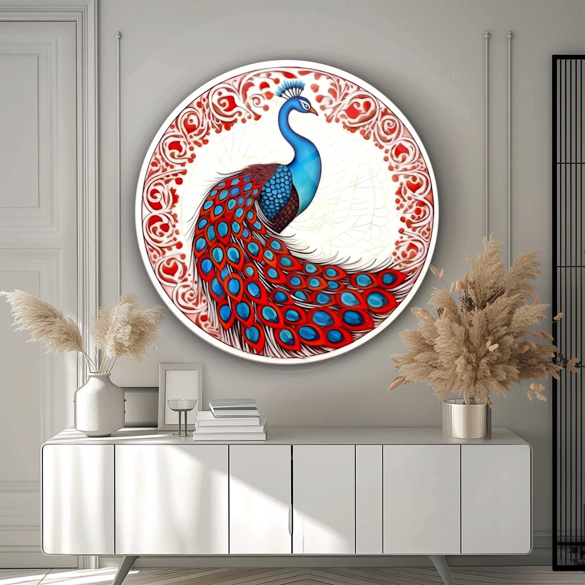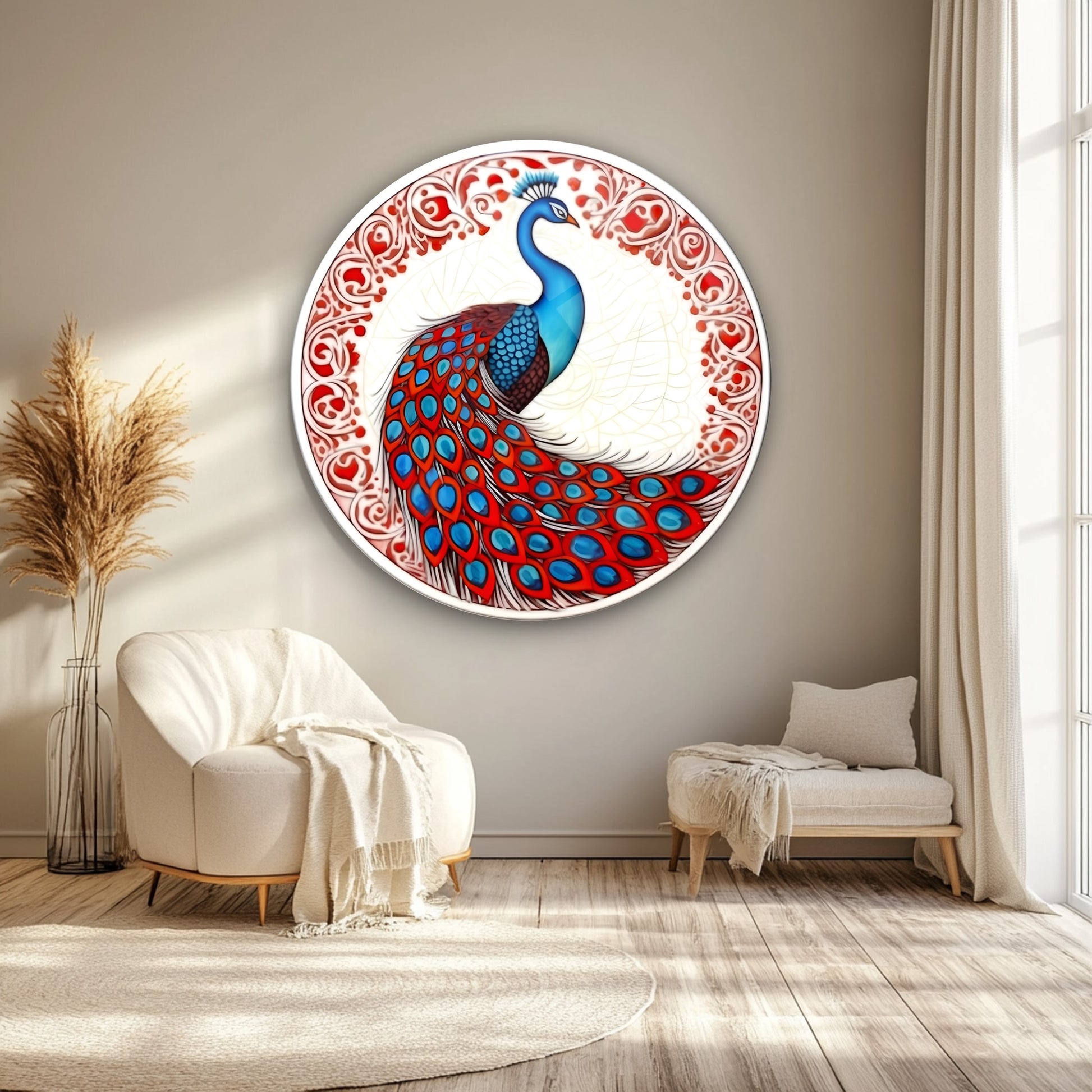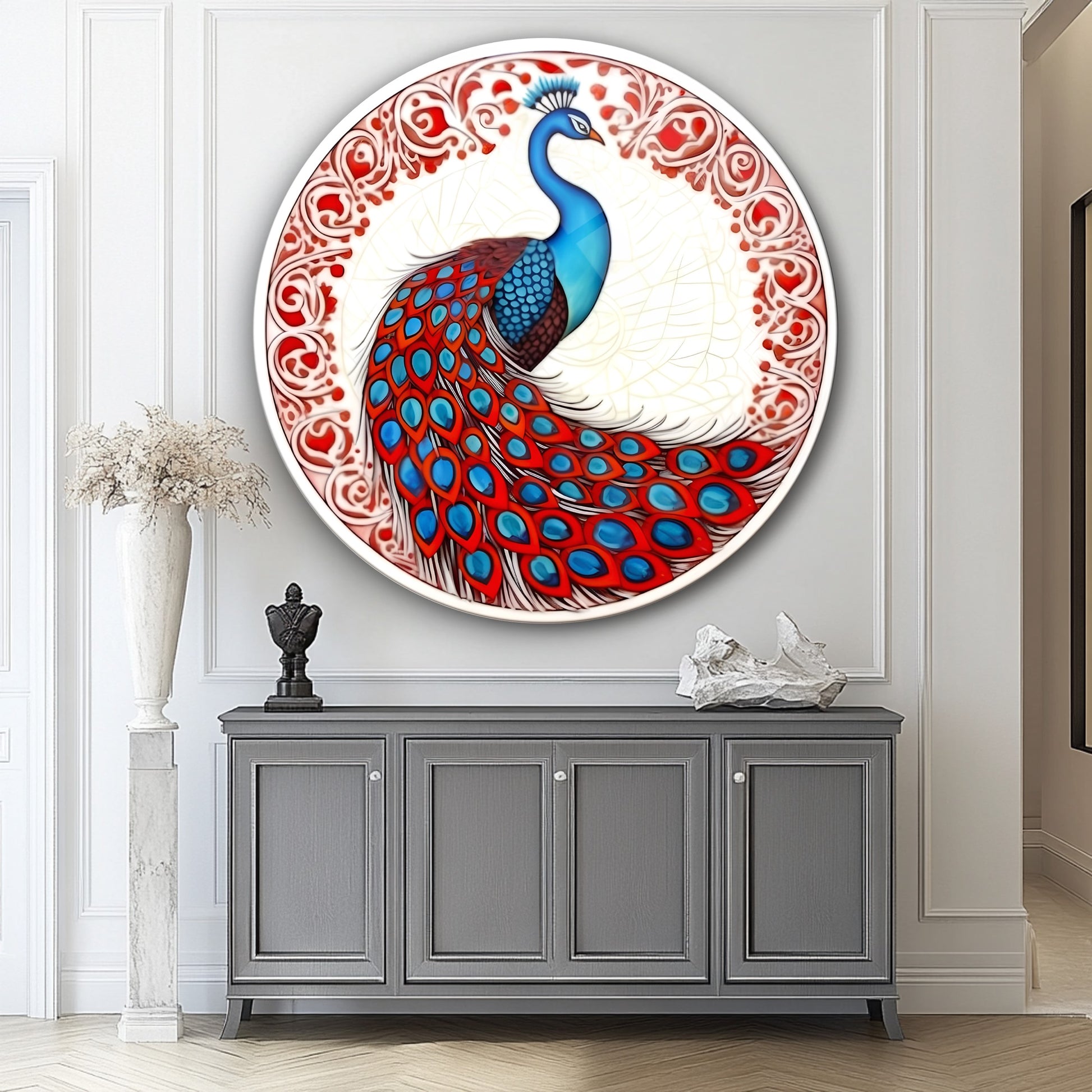 Kırmızı Detaylı Tavus Kuşu Yuvarlak Cam Tablo