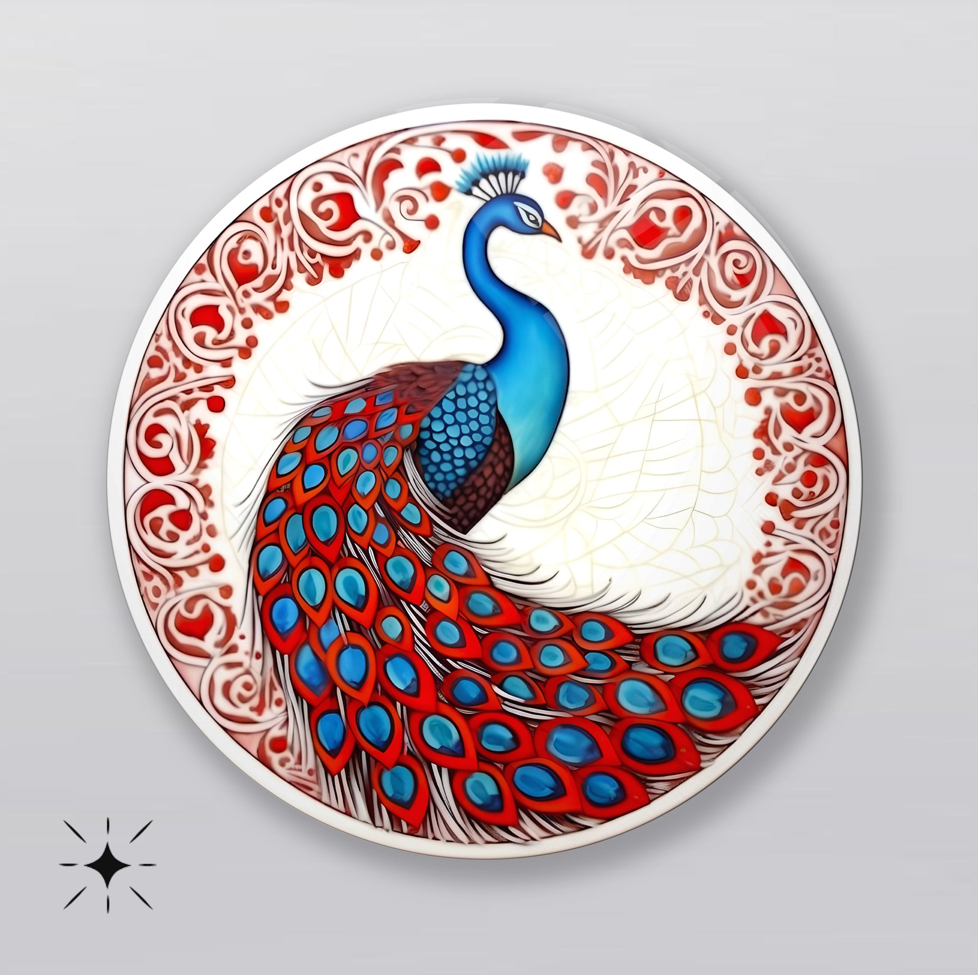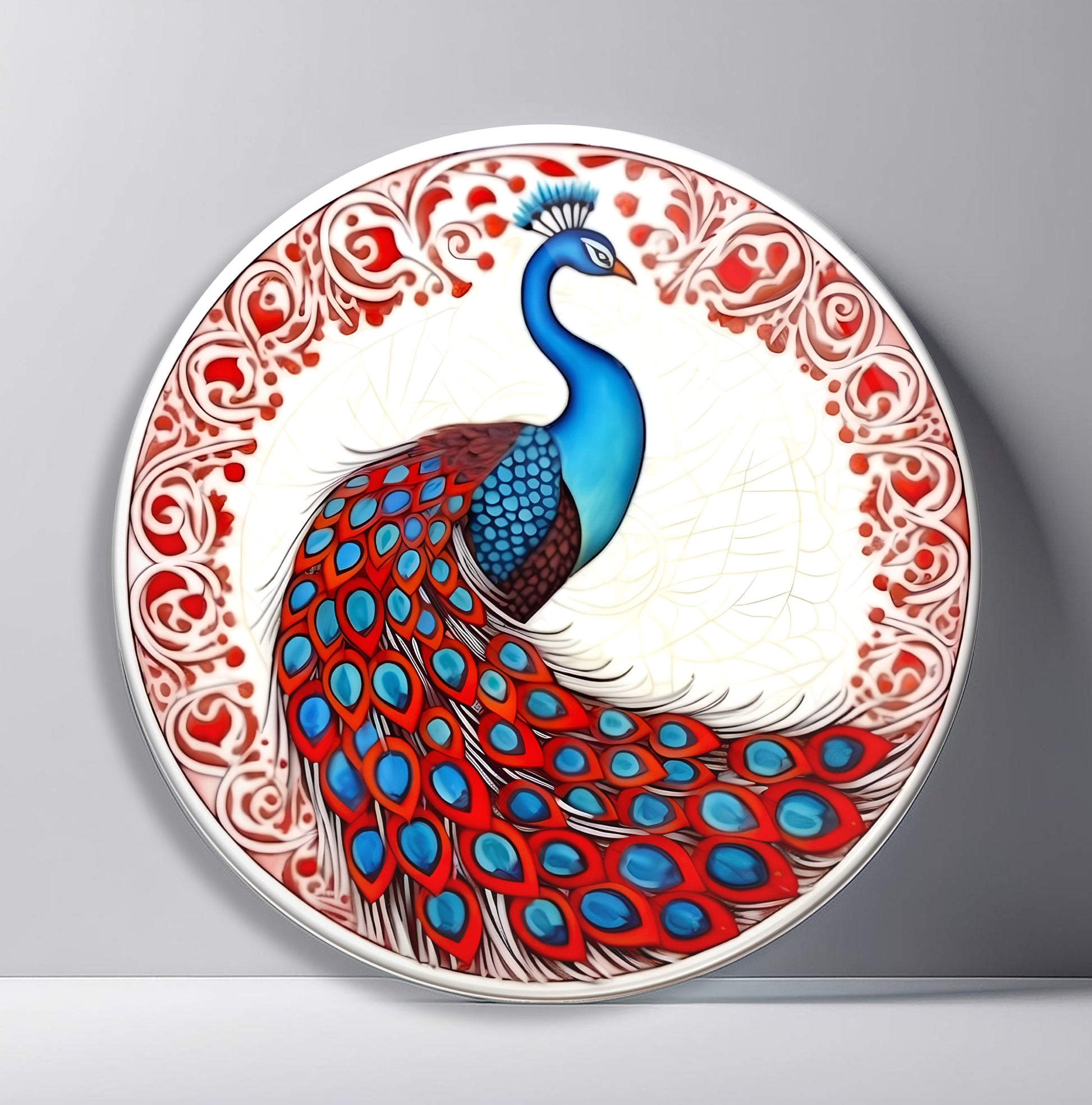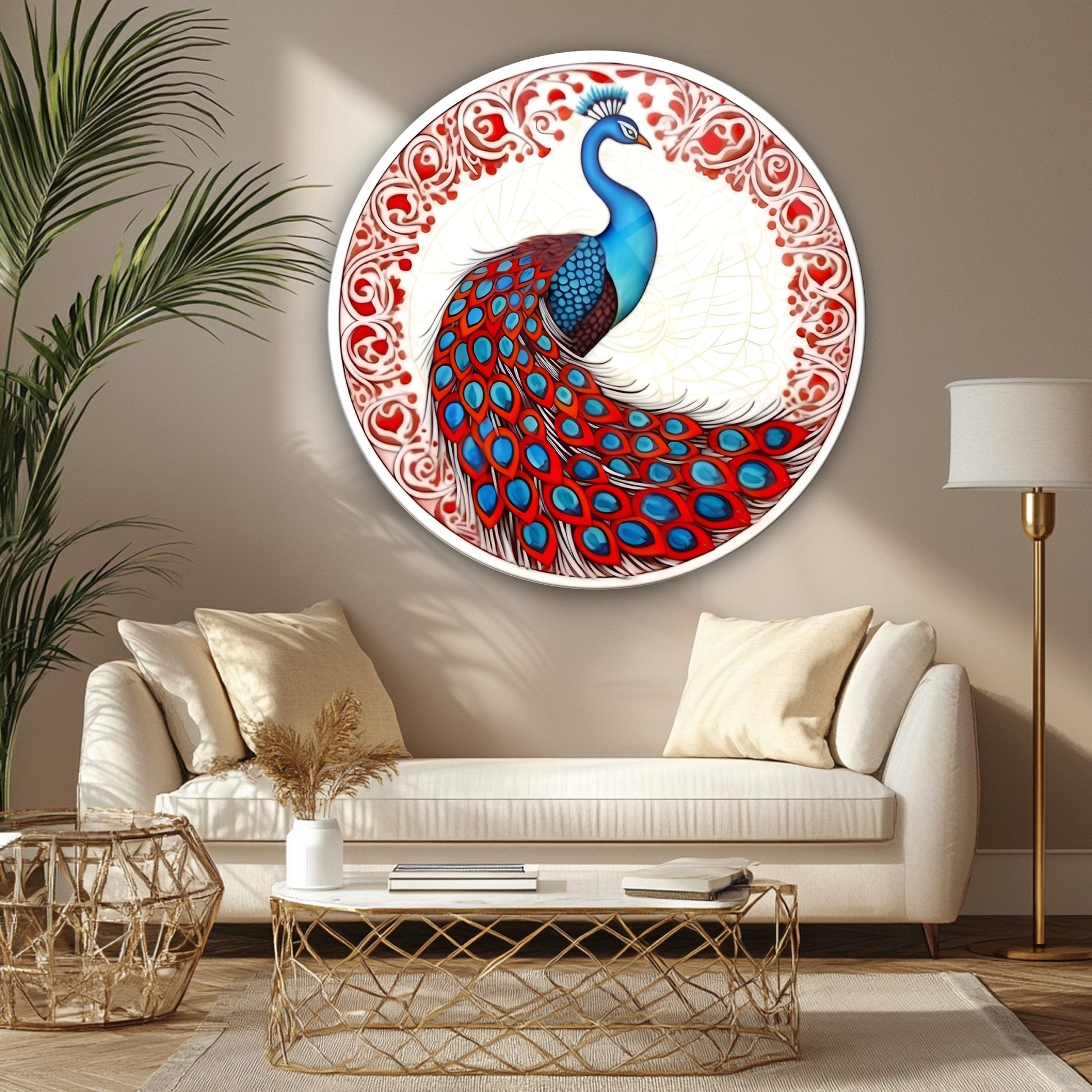 Kırmızı Detaylı Tavus Kuşu Yuvarlak Cam Tablo