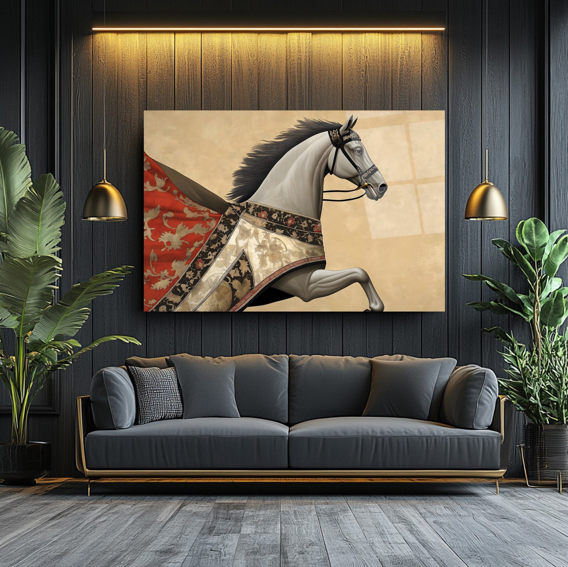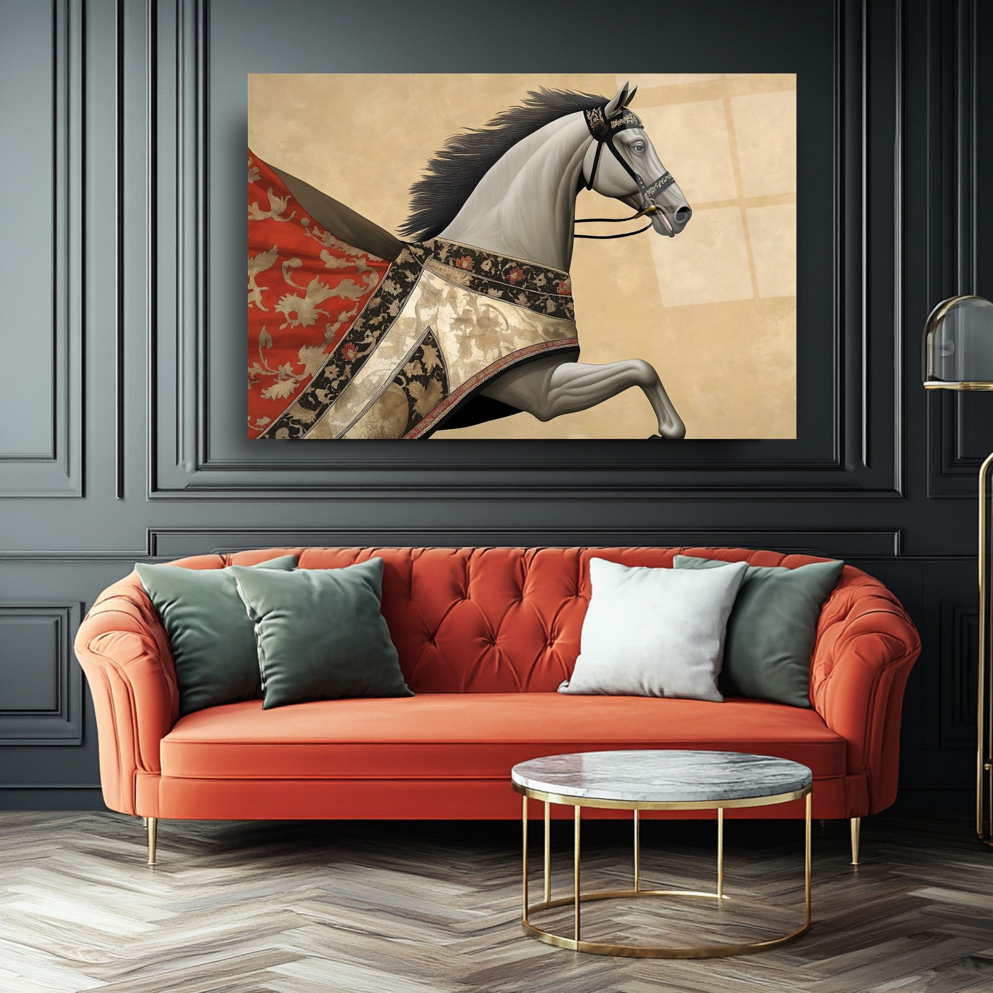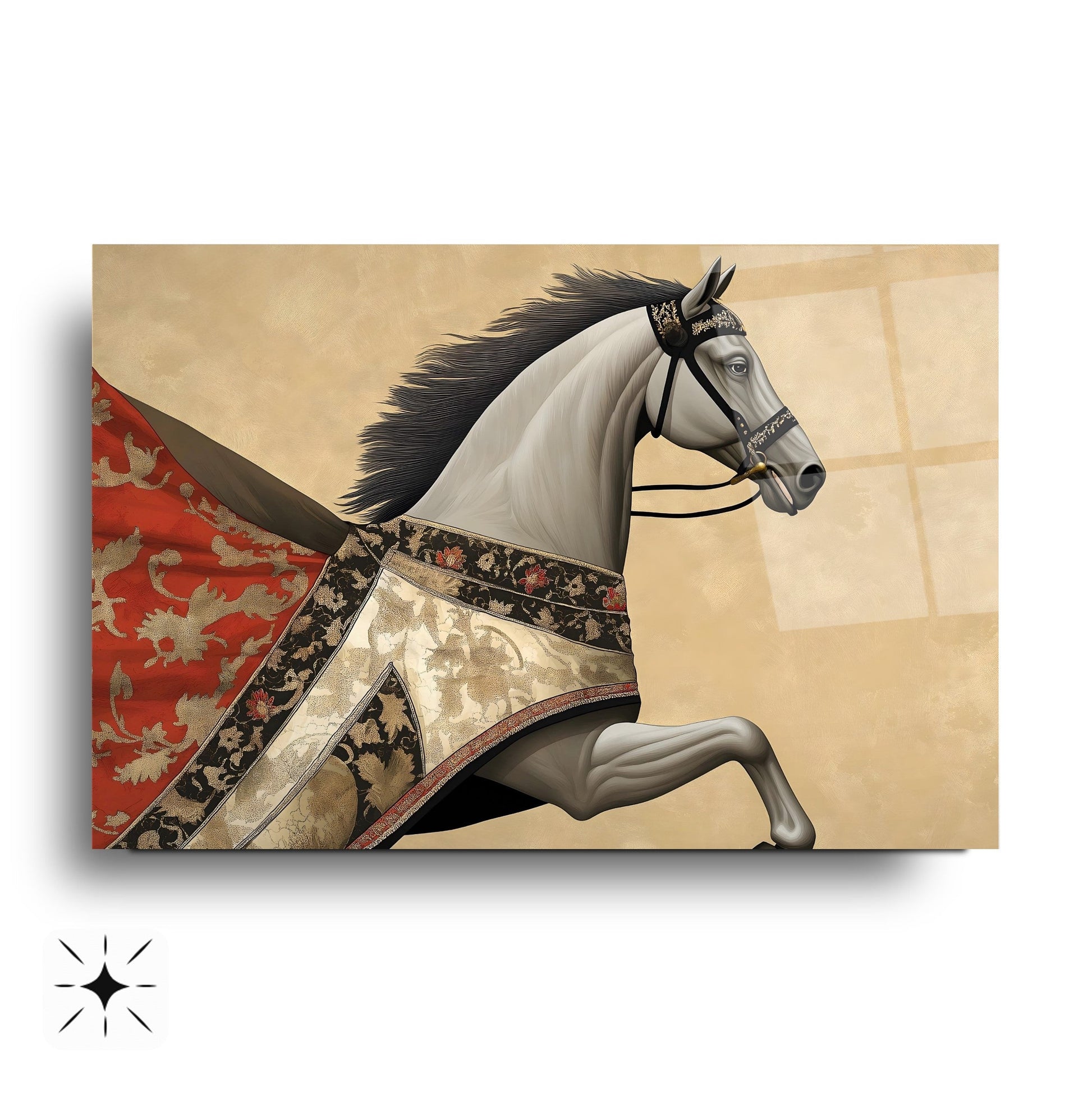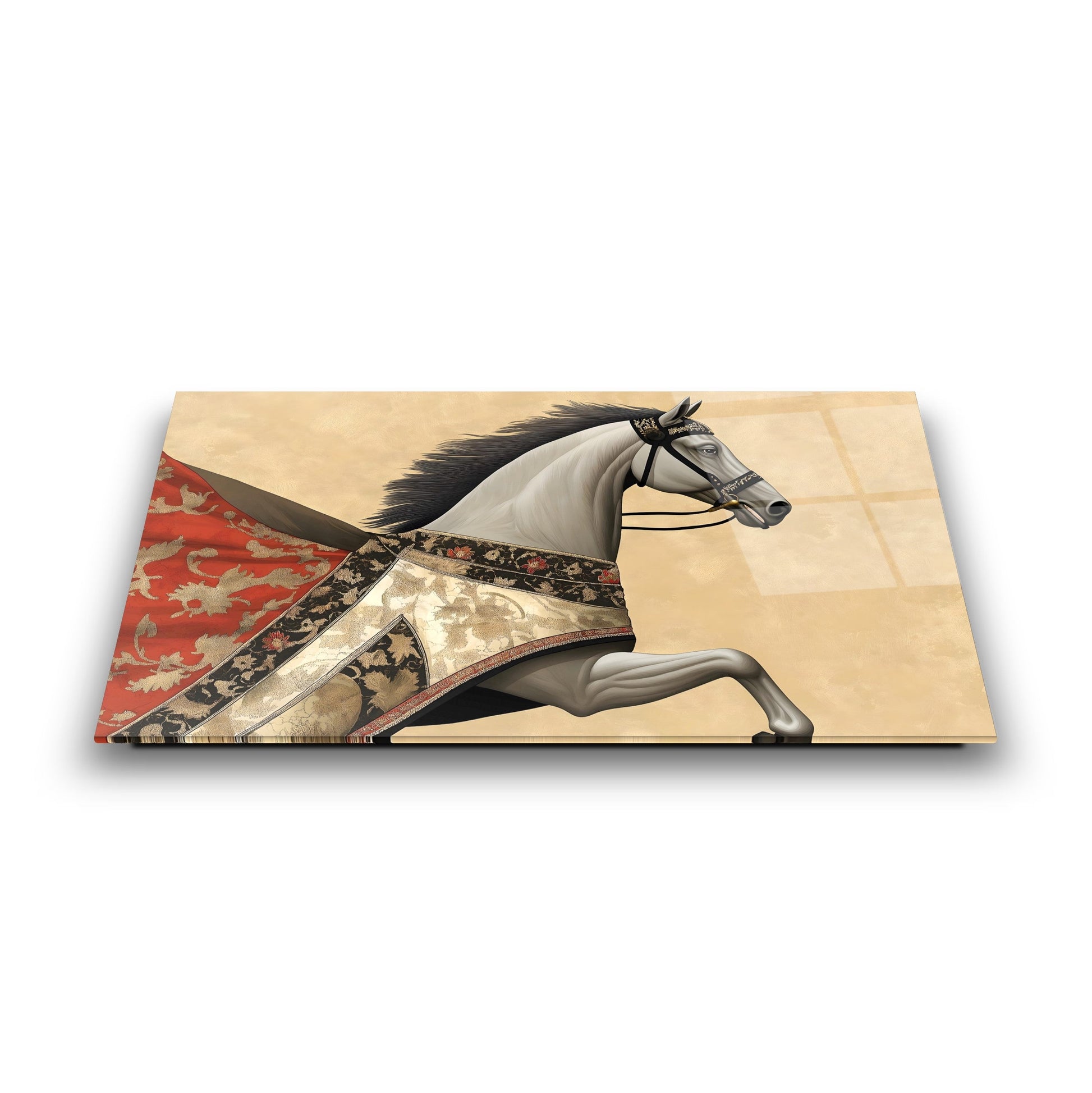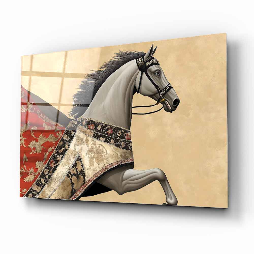 Bu modern cam tablo, kırmızı pelerinli at figürüyle hem hareketi hem de retro şıklığı ifade ediyor. Parlak gold detaylar, koyu arka planla kontrast oluşturarak mekâna derinlik ve ihtişam katıyor. Tamamen çerçevesiz tasarımıyla minimalist dekorasyonlara son derece uyumlu, rodajlı kenarları ise güven ve estetiği bir arada sunuyor. UV baskı tekniği sayesinde kırmızı ve gold tonlar solmadan canlılıklarını koruyor. Kolay montajlı yapısıyla salon, ofis veya antre dekorasyonunuzda çarpıcı bir vurgu yaratmak isteyenler için ideal bir tercih.