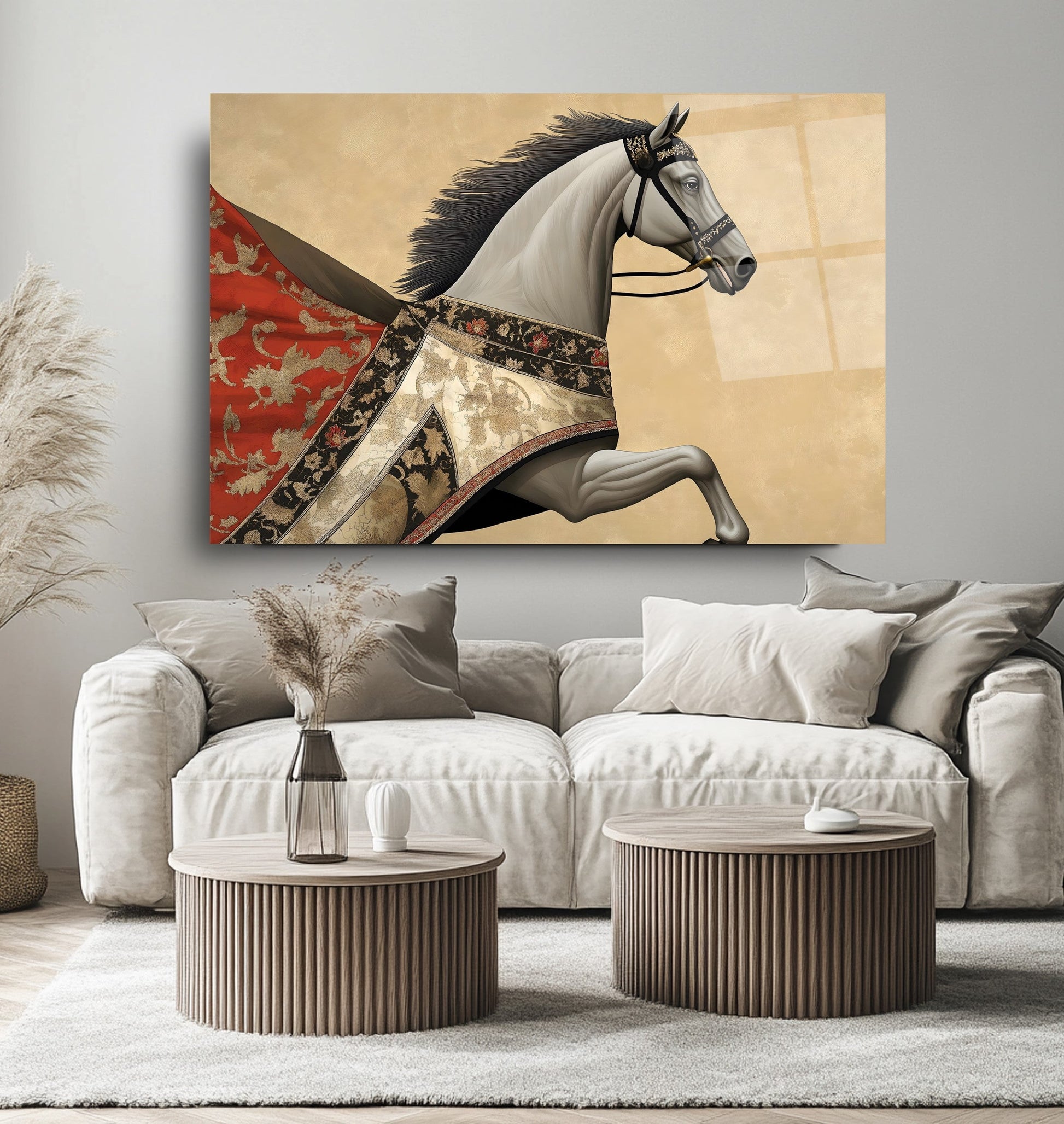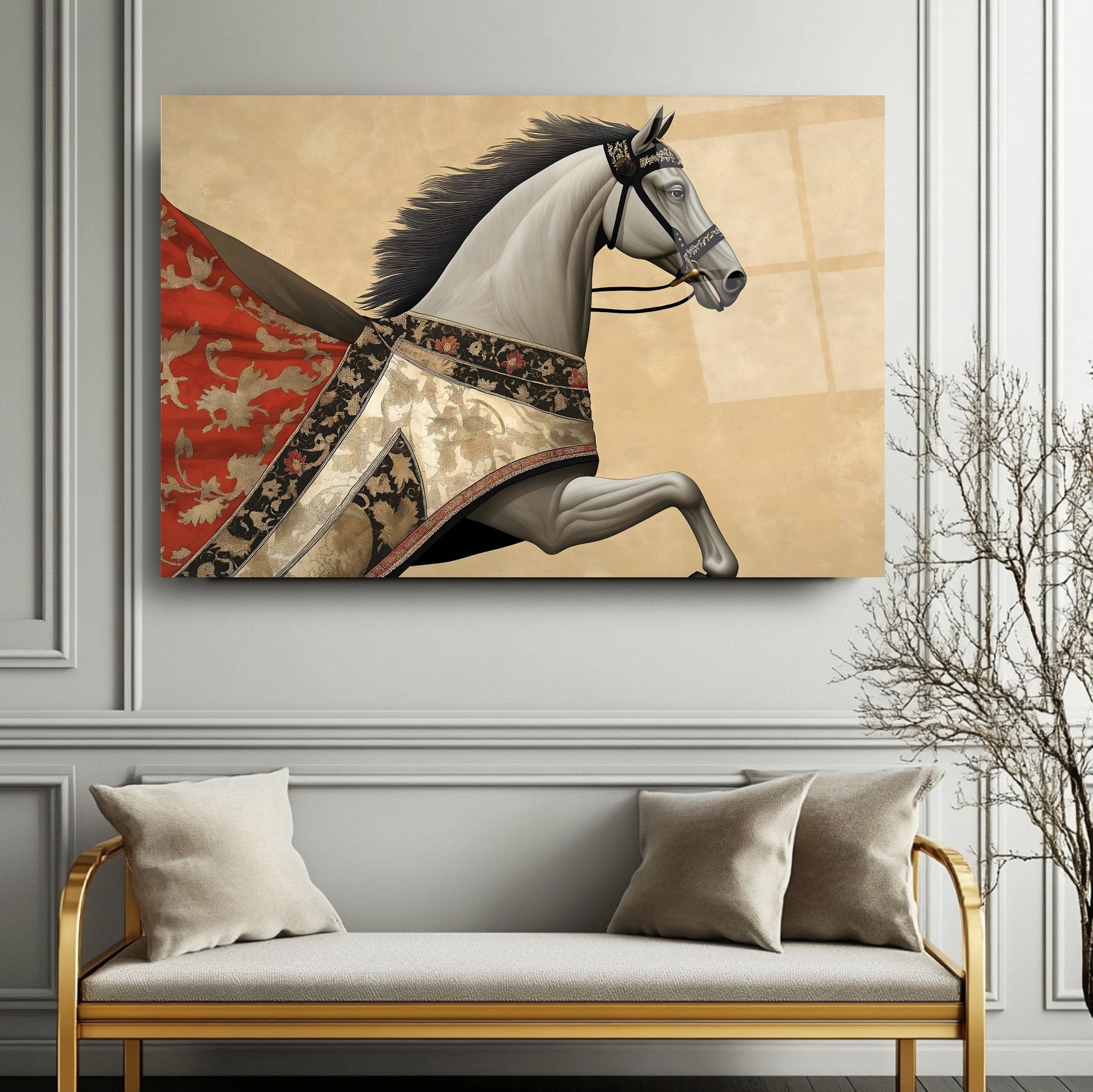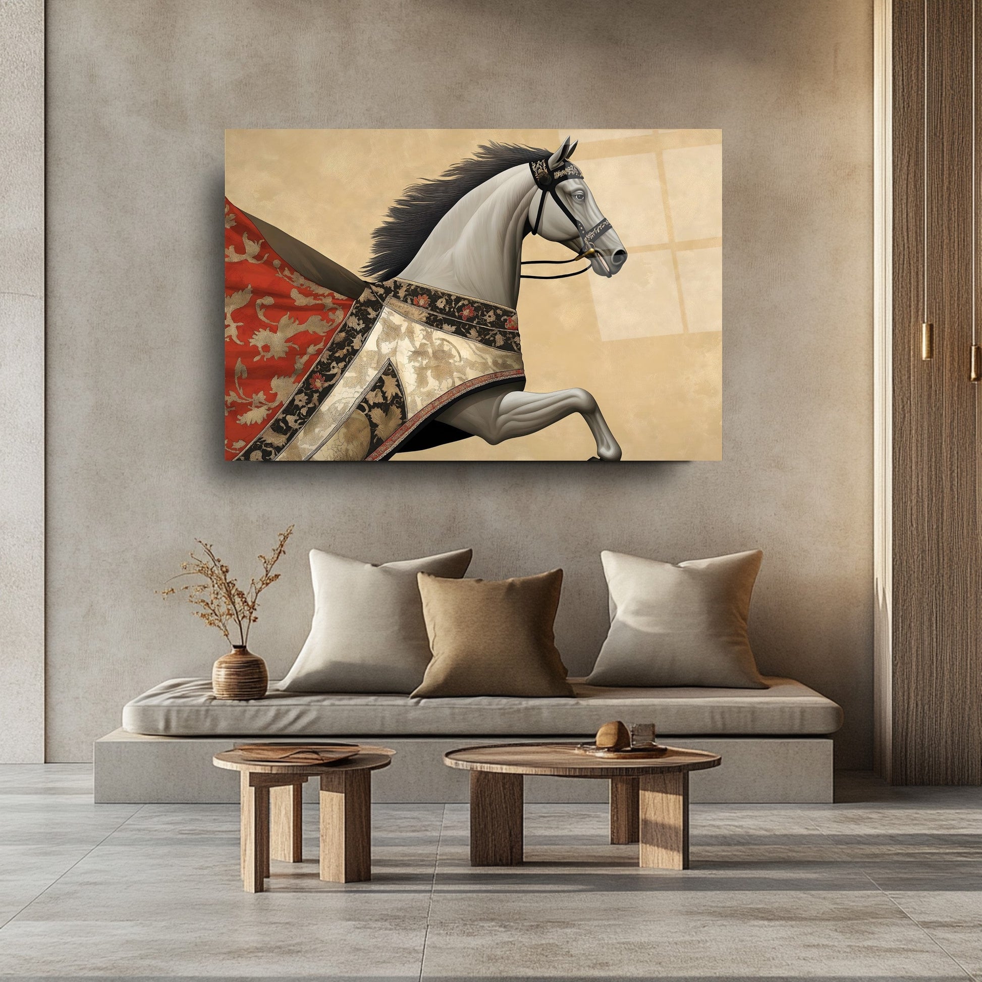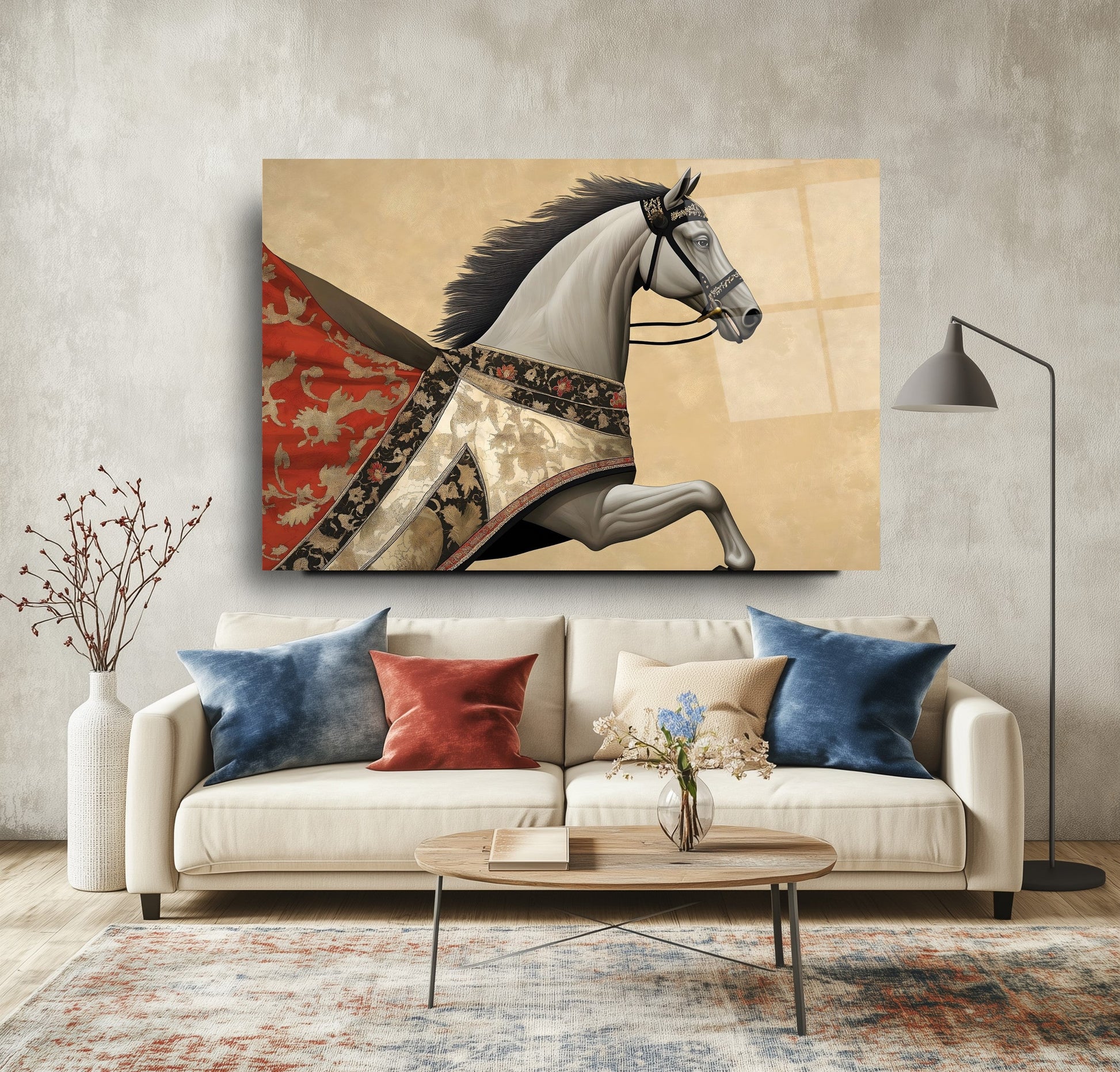 Bu modern cam tablo, kırmızı pelerinli at figürüyle hem hareketi hem de retro şıklığı ifade ediyor. Parlak gold detaylar, koyu arka planla kontrast oluşturarak mekâna derinlik ve ihtişam katıyor. Tamamen çerçevesiz tasarımıyla minimalist dekorasyonlara son derece uyumlu, rodajlı kenarları ise güven ve estetiği bir arada sunuyor. UV baskı tekniği sayesinde kırmızı ve gold tonlar solmadan canlılıklarını koruyor. Kolay montajlı yapısıyla salon, ofis veya antre dekorasyonunuzda çarpıcı bir vurgu yaratmak isteyenler için ideal bir tercih.