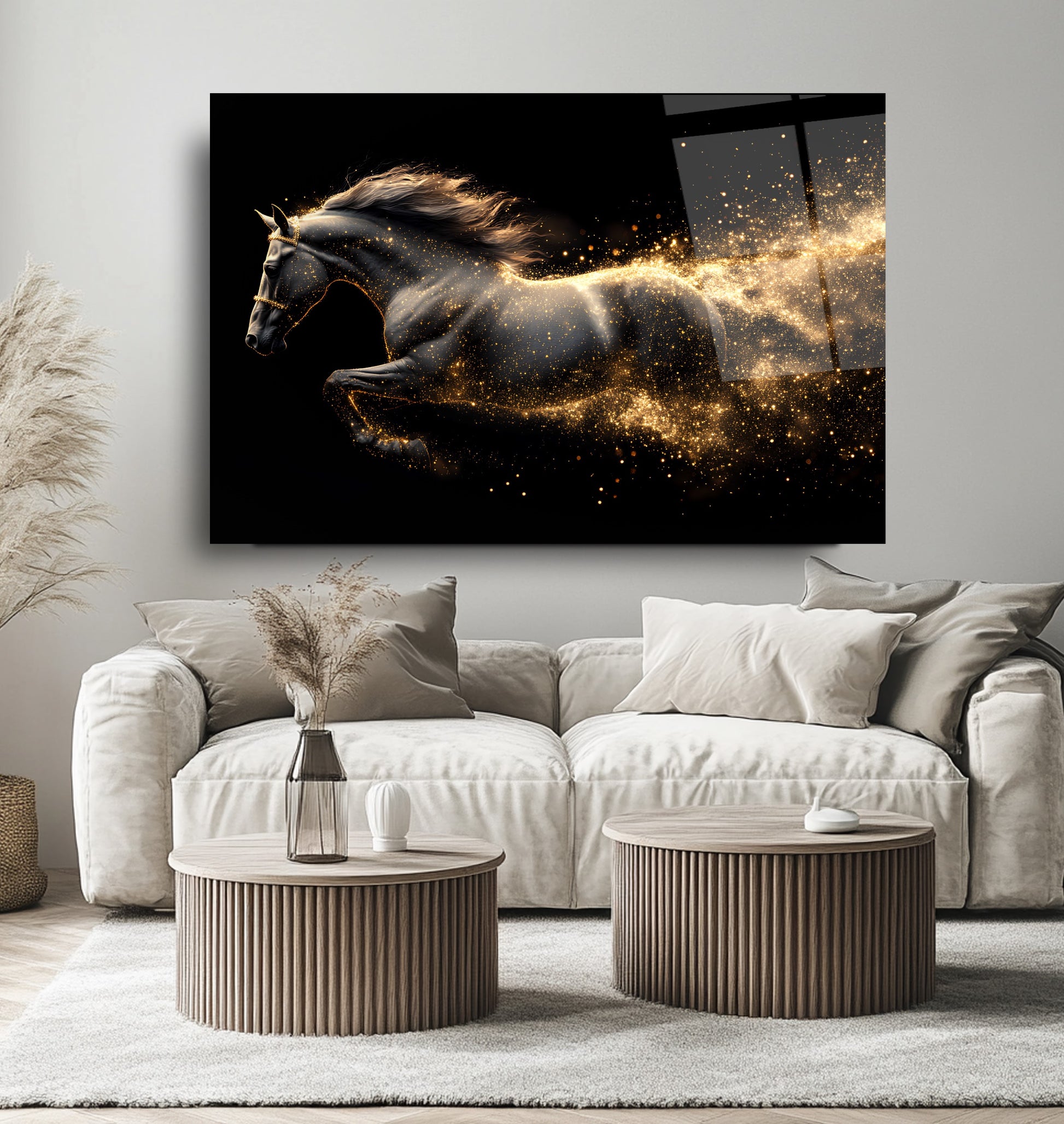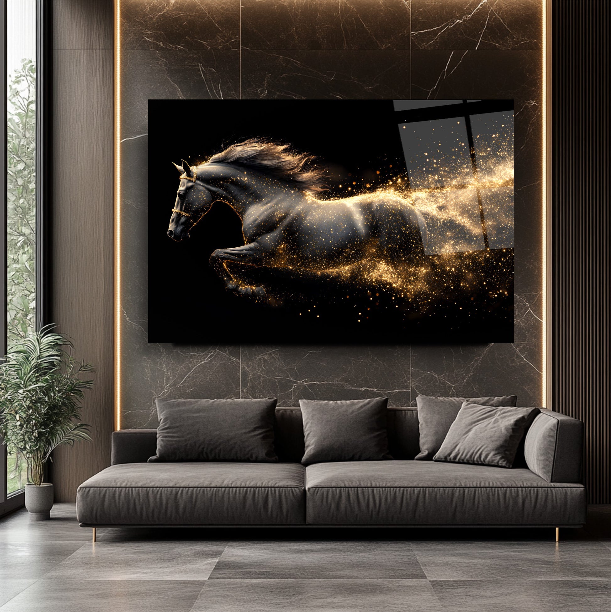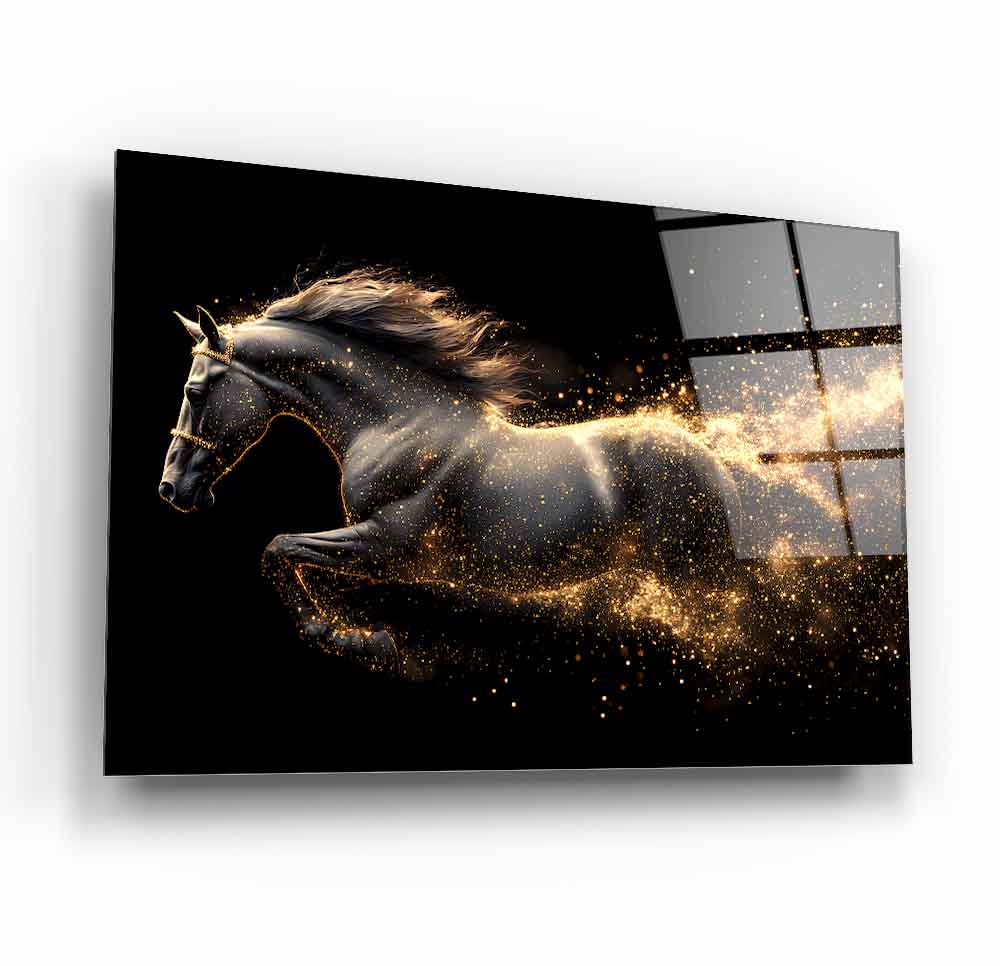 Bu çarpıcı cam tablo, gri zemin üzerinde kıvılcım ve alev efektleriyle canlandırılmış güçlü at figürüyle dikkat çekiyor. Hareketin estetiğini yansıtan kompozisyon, mekânlara sofistike bir dinamizm kazandırıyor. Temperli cam yüzey ve UV baskı teknolojisi sayesinde renkler solmadan uzun süre canlı kalıyor, dayanıklılık ve şıklığı bir arada sunuyor. Çerçevesiz, modern tasarımıyla salon, ofis veya antre gibi alanlarda dramatik bir odak noktası isteyenler için ideal bir tercih.