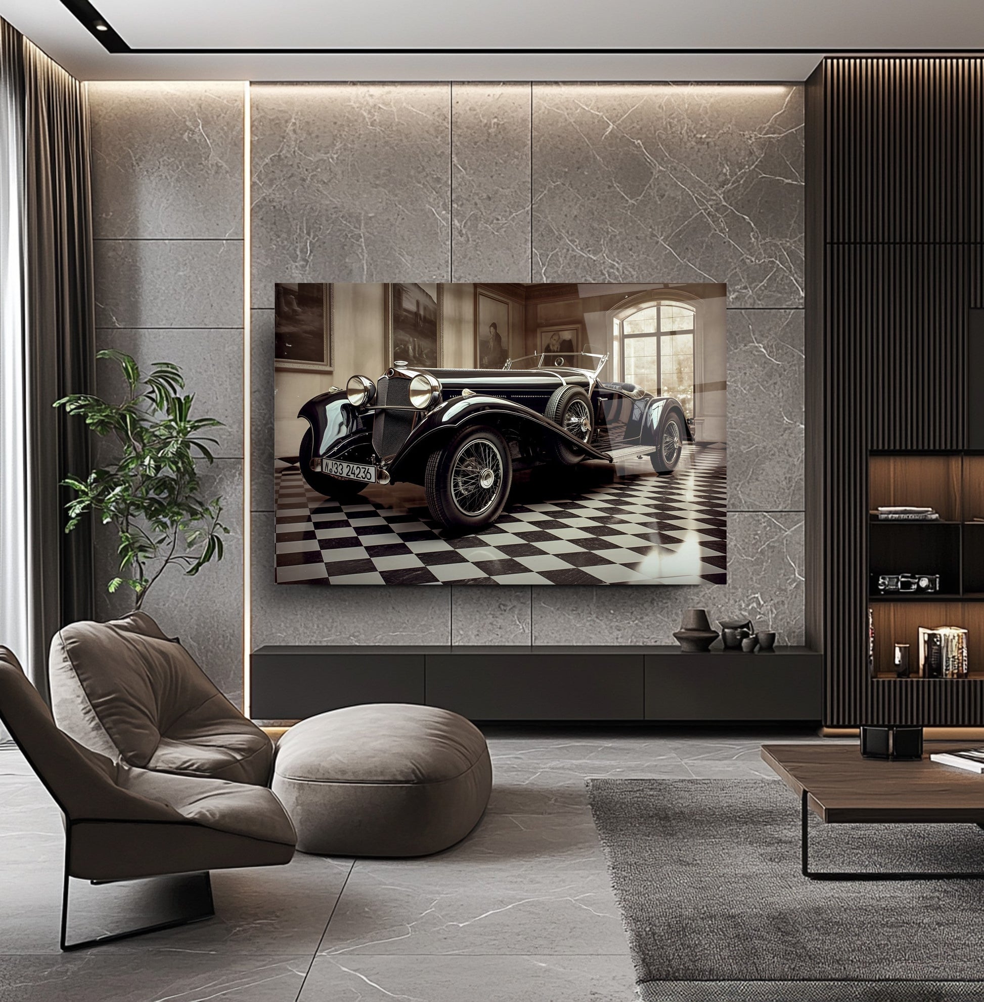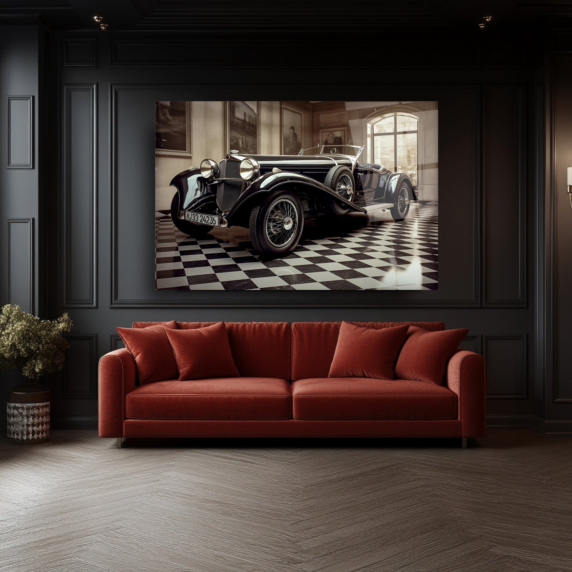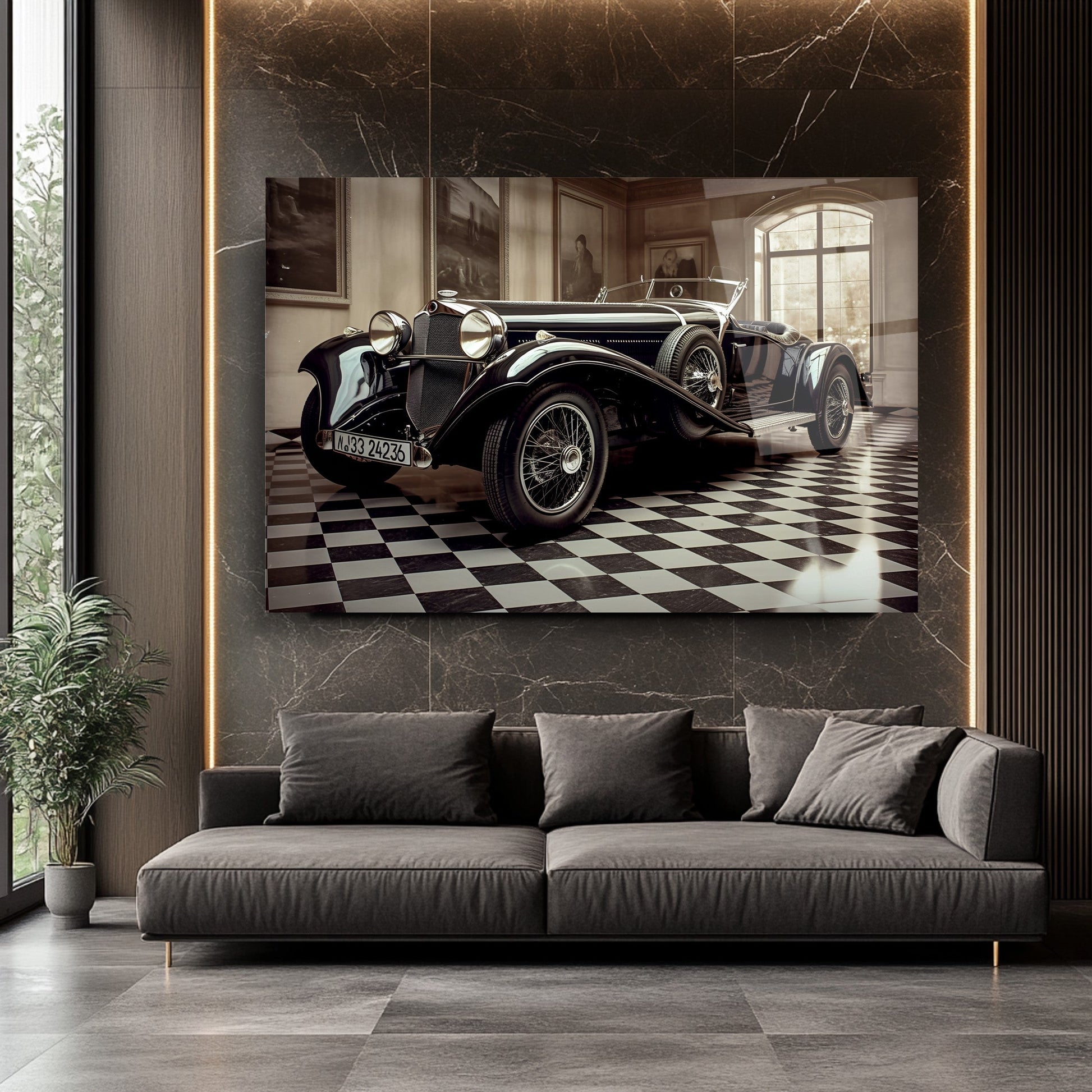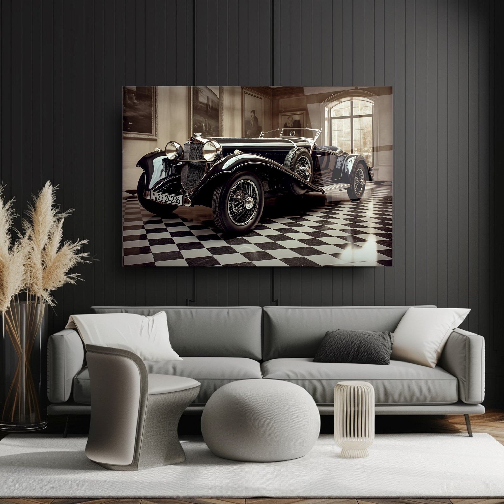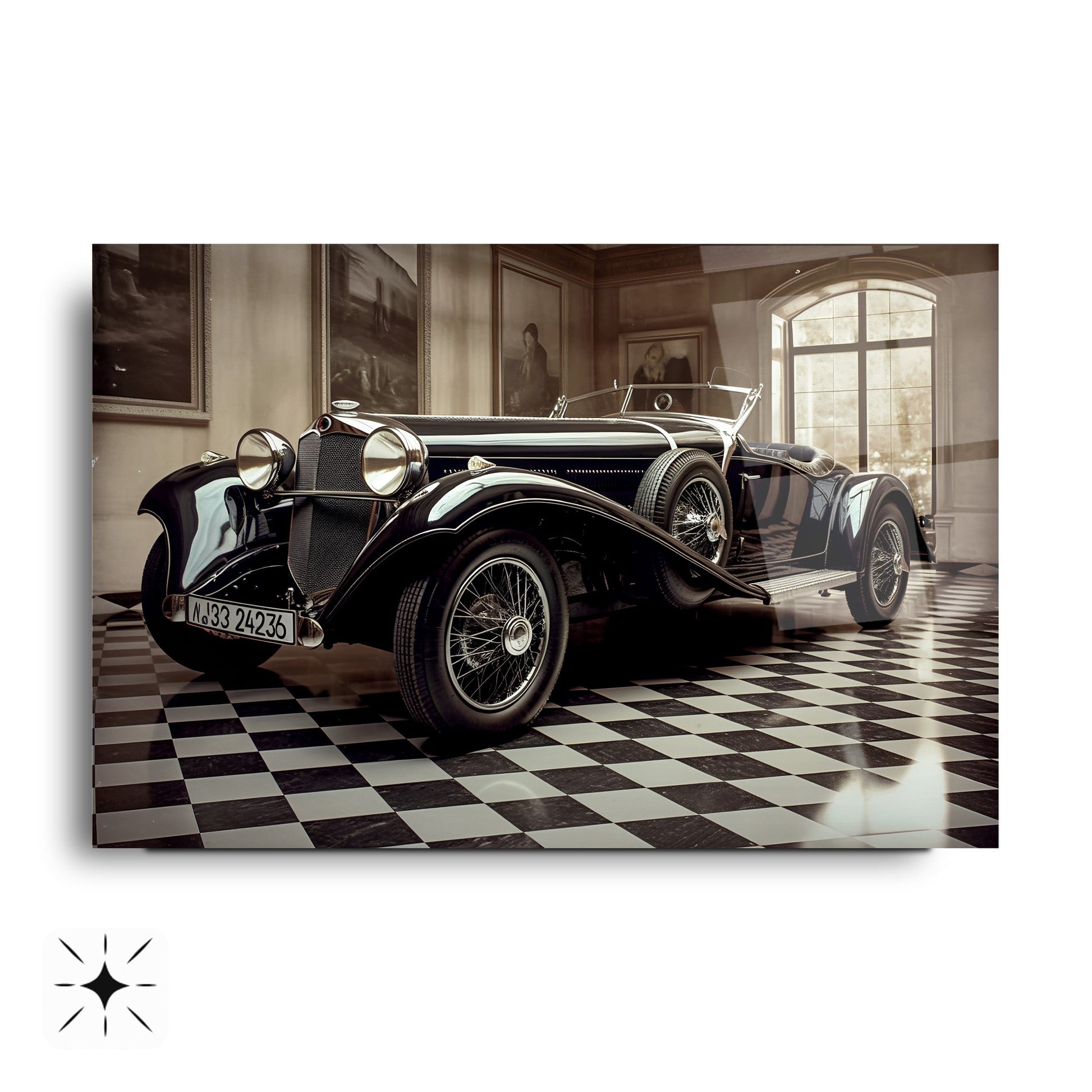 Klasik Mercedes’in zarif ve sportif duruşunu yansıtan bu gerçek cam tablo, siyah fonuyla modern yaşam alanlarına nostaljik bir şıklık katar. Kırılmaz cam tablo yapısıyla dayanıklı ve estetik bir dekorasyon seçeneğidir. Araba tutkunları için güçlü ve stil sahibi mekanlara özel şık bir cam tablo tercihidir.