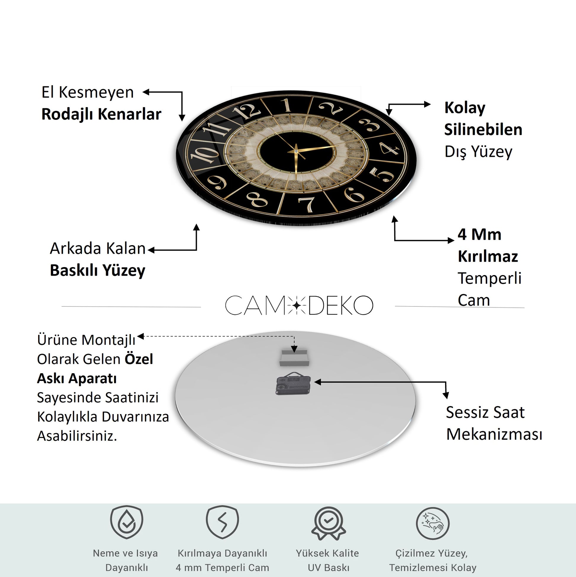 Saatlerimizde 4 mm kalınlığında ultra clear temperli cam kullanılır. Rodajlanmış (el kesmeyen) kenarları, hem güvenli hem de estetik bir görünüm sunar. Zamansız tasarımıyla ev ve ofis dekorasyonuna şıklık katar.