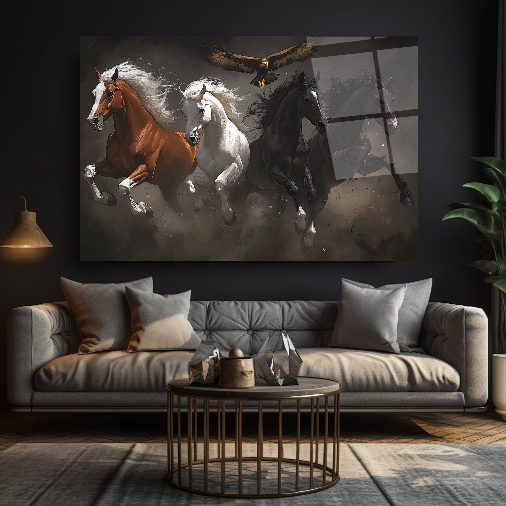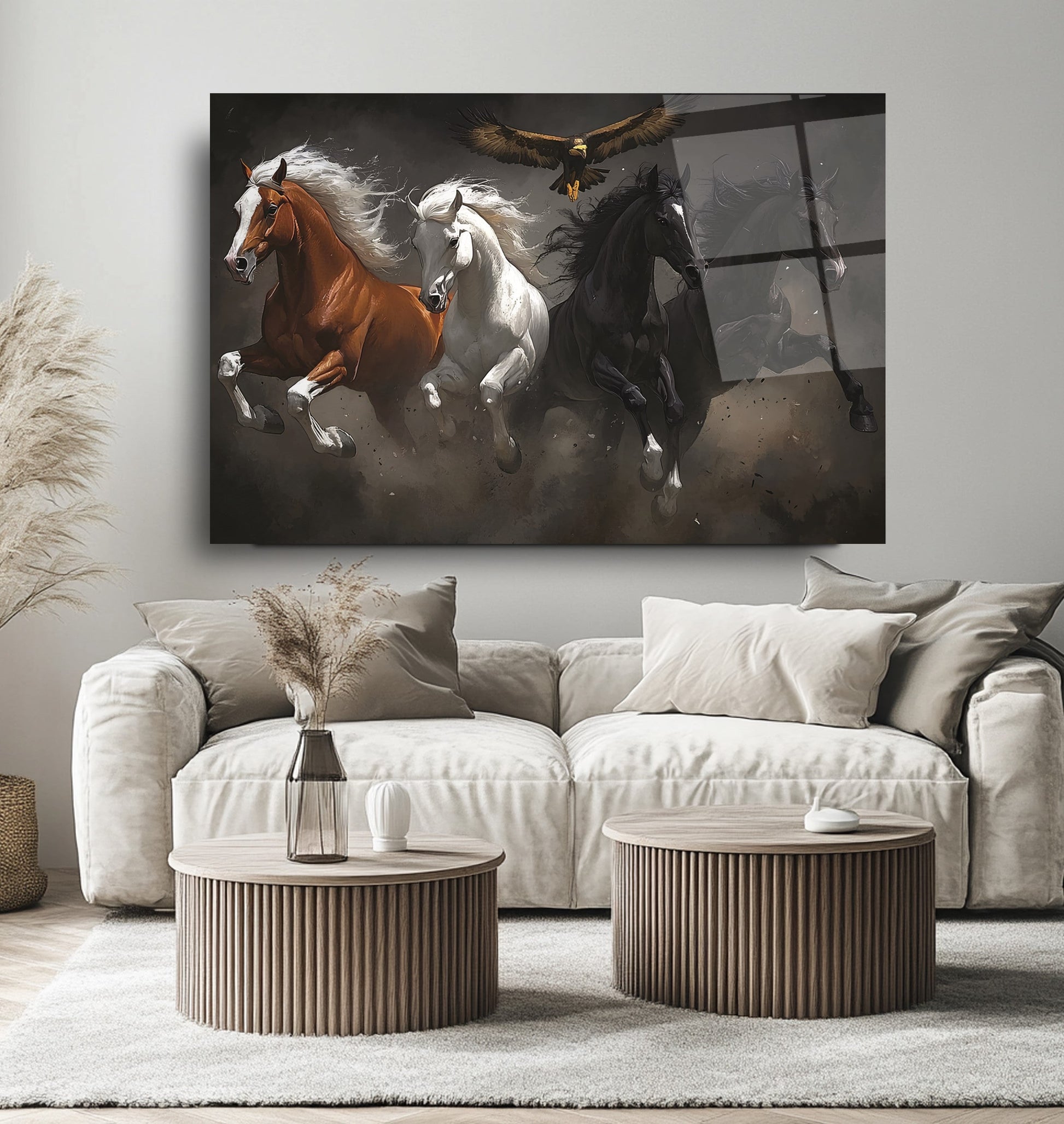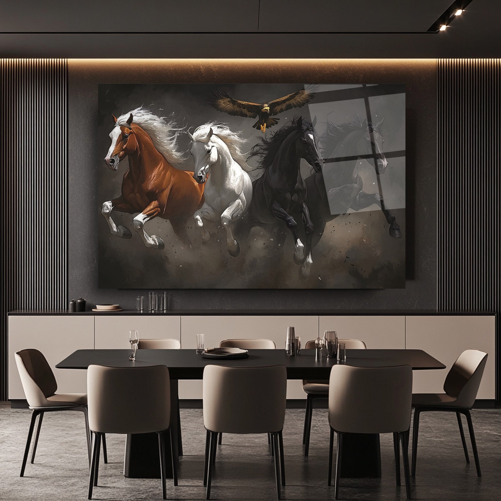 Mekanlarınıza Özgürlüğün ve Gücün Dinamizmini Taşıyın: Koşan Atlar Uçan Kartal Cam Tablo
