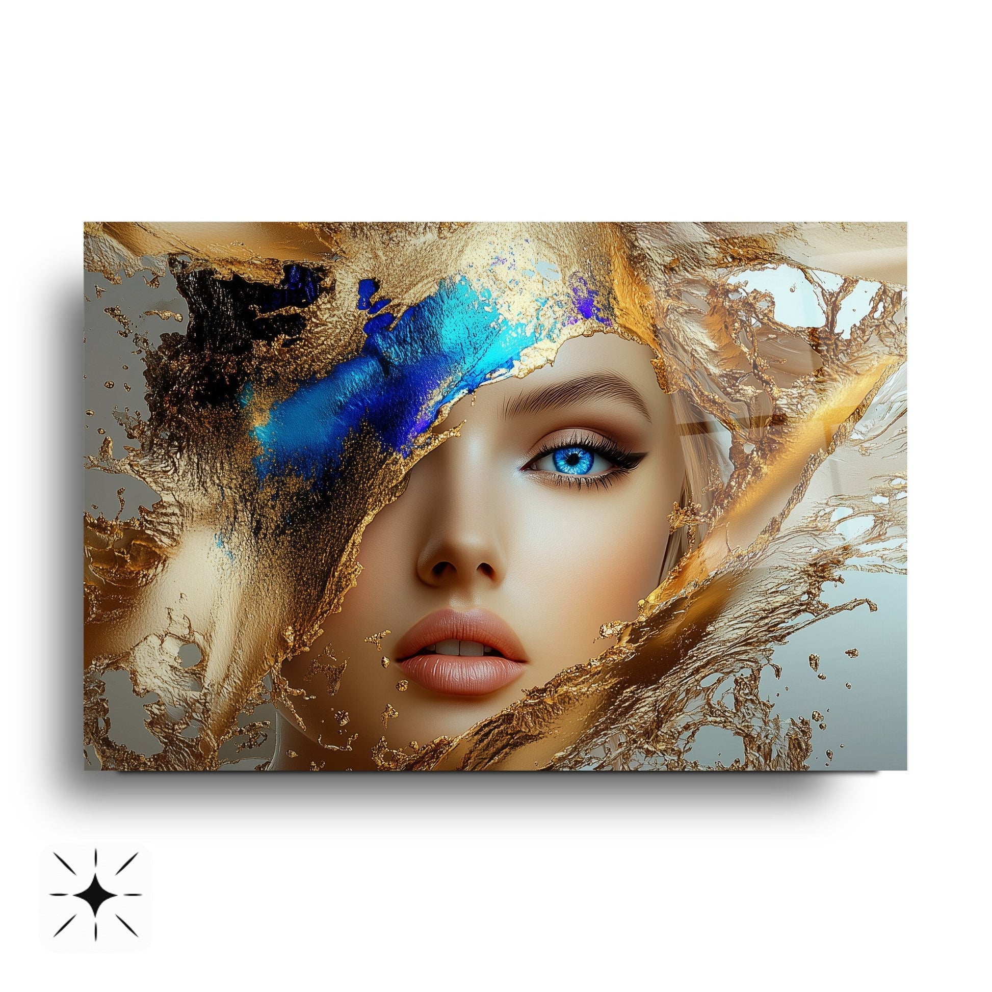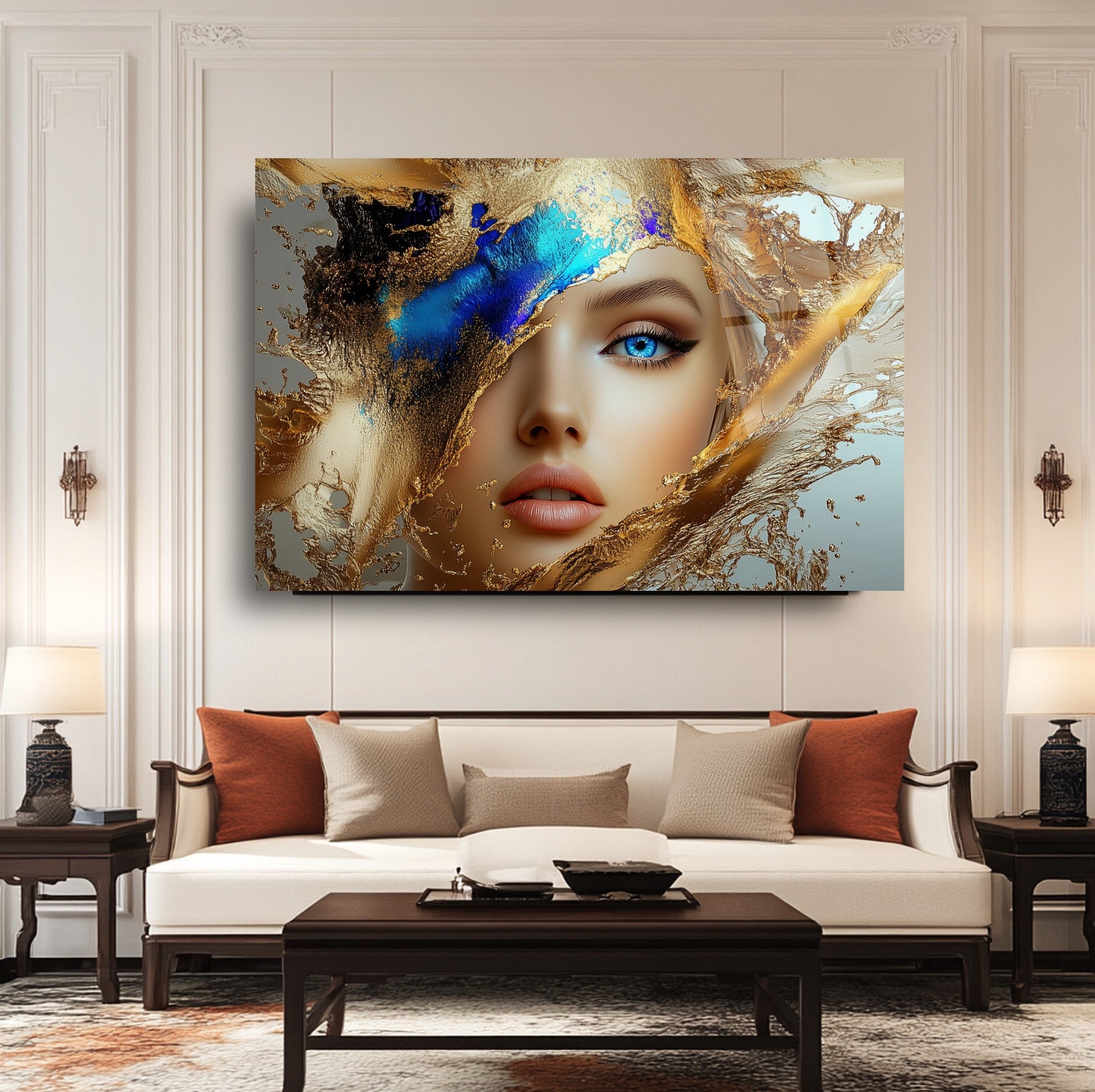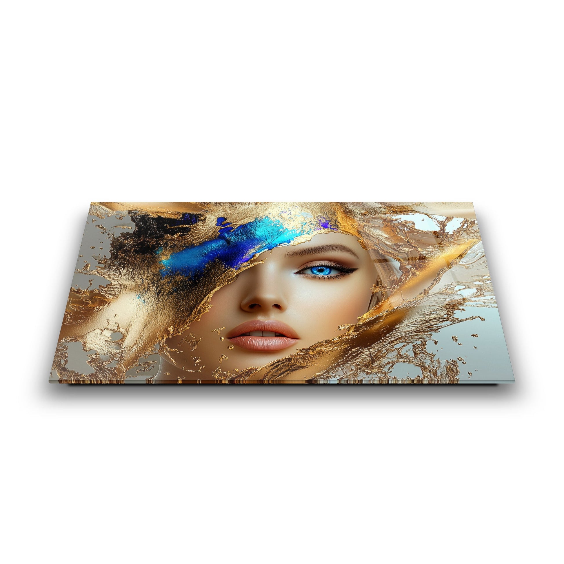 Gold ve mavi detaylarla öne çıkan bu modern cam tablo, güzellik salonları, kuaförler ve estetik kliniklere özel olarak tasarlanmış zarif bir dekoratif parçadır. İnce ışık oyunlarıyla aydınlatılan kadın yüzü, mekânınıza sofistike bir hava katarken, temperli cam ve UV baskı teknolojisi sayesinde renkler solmadan uzun süre canlı kalır. Çerçevesiz minimal tasarım, hem modern hem şık alanlarda kolaylıkla uyum sağlar. Dayanıklı yapısı ve estetik görünümüyle bu cam tablo, profesyonel alanlarda dikkat çekici ve lüks bir vurgu isteyenler için ideal bir tercih.