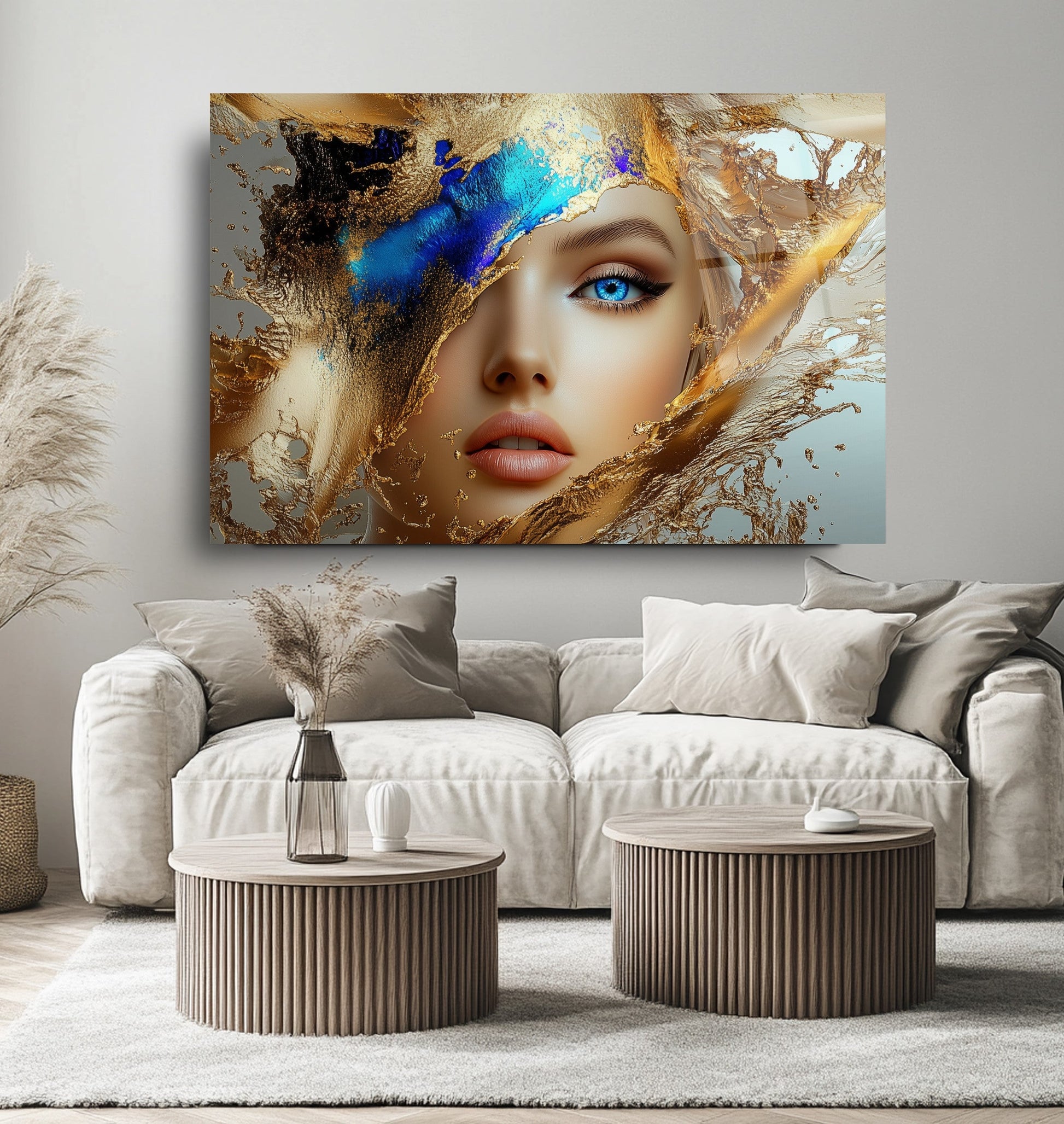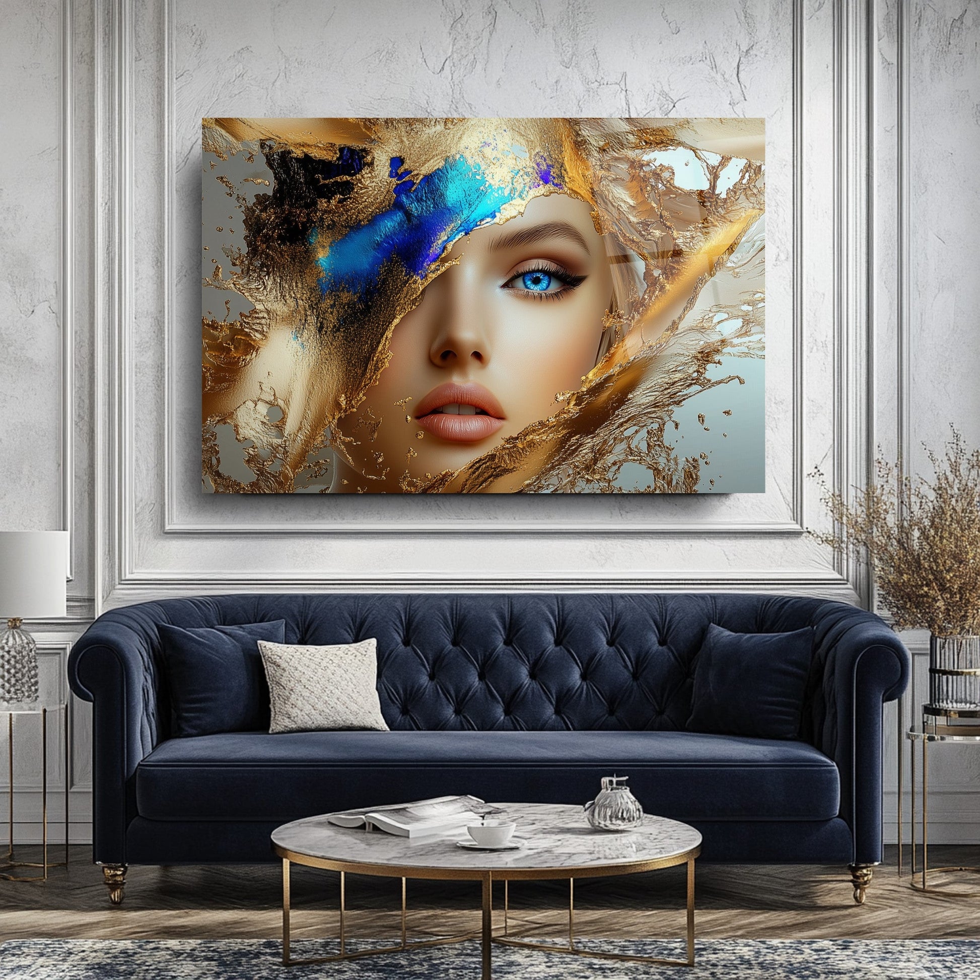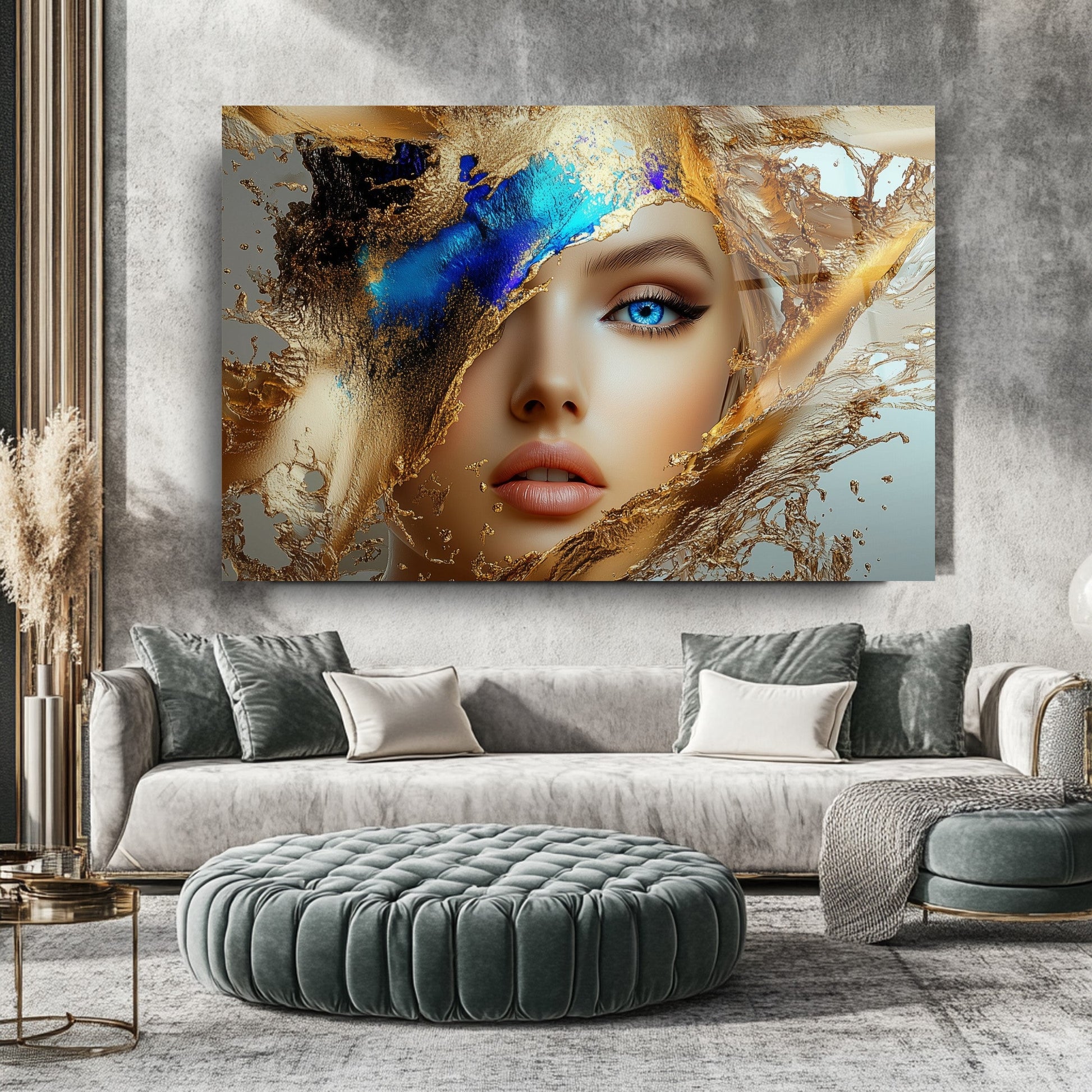 Gold ve mavi detaylarla öne çıkan bu modern cam tablo, güzellik salonları, kuaförler ve estetik kliniklere özel olarak tasarlanmış zarif bir dekoratif parçadır. İnce ışık oyunlarıyla aydınlatılan kadın yüzü, mekânınıza sofistike bir hava katarken, temperli cam ve UV baskı teknolojisi sayesinde renkler solmadan uzun süre canlı kalır. Çerçevesiz minimal tasarım, hem modern hem şık alanlarda kolaylıkla uyum sağlar. Dayanıklı yapısı ve estetik görünümüyle bu cam tablo, profesyonel alanlarda dikkat çekici ve lüks bir vurgu isteyenler için ideal bir tercih.