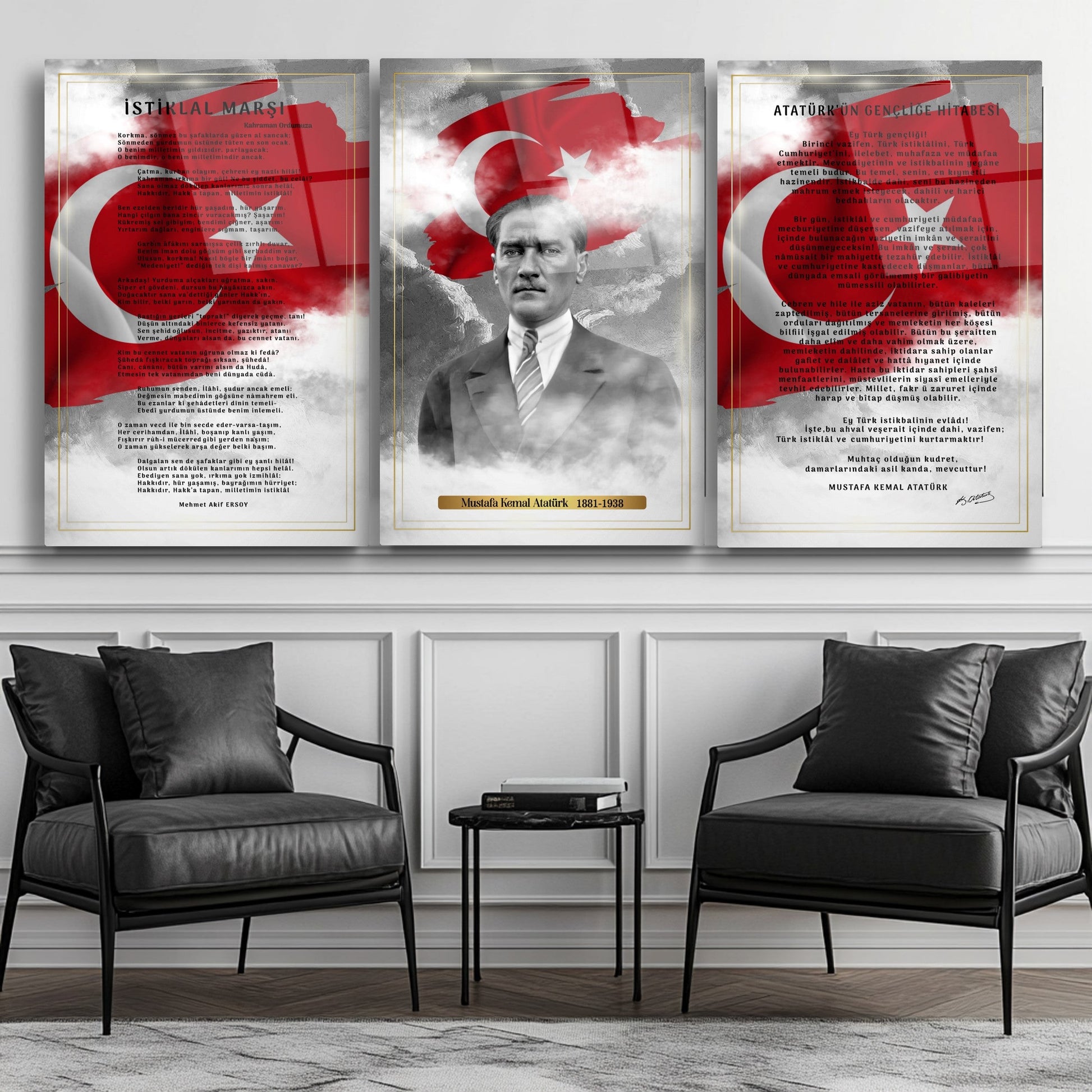 Bu tablo seti, ofisinizin veya okulunuzun duvarlarında sergilenerek, çalışanlarınıza, öğrencilerinize ve ziyaretçilerinize her gün ilham verecek bir atmosfer yaratır. Ulu Önder'in evrensel ilkelerini ve ileri görüşlülüğünü modern bir sanat eseriyle ifade edin. Bu set, çalışma ortamınızın ciddiyetini ve saygınlığını artırırken, eğitim kurumlarında genç nesillere milli değerleri benimsetmede önemli bir rol oynar.