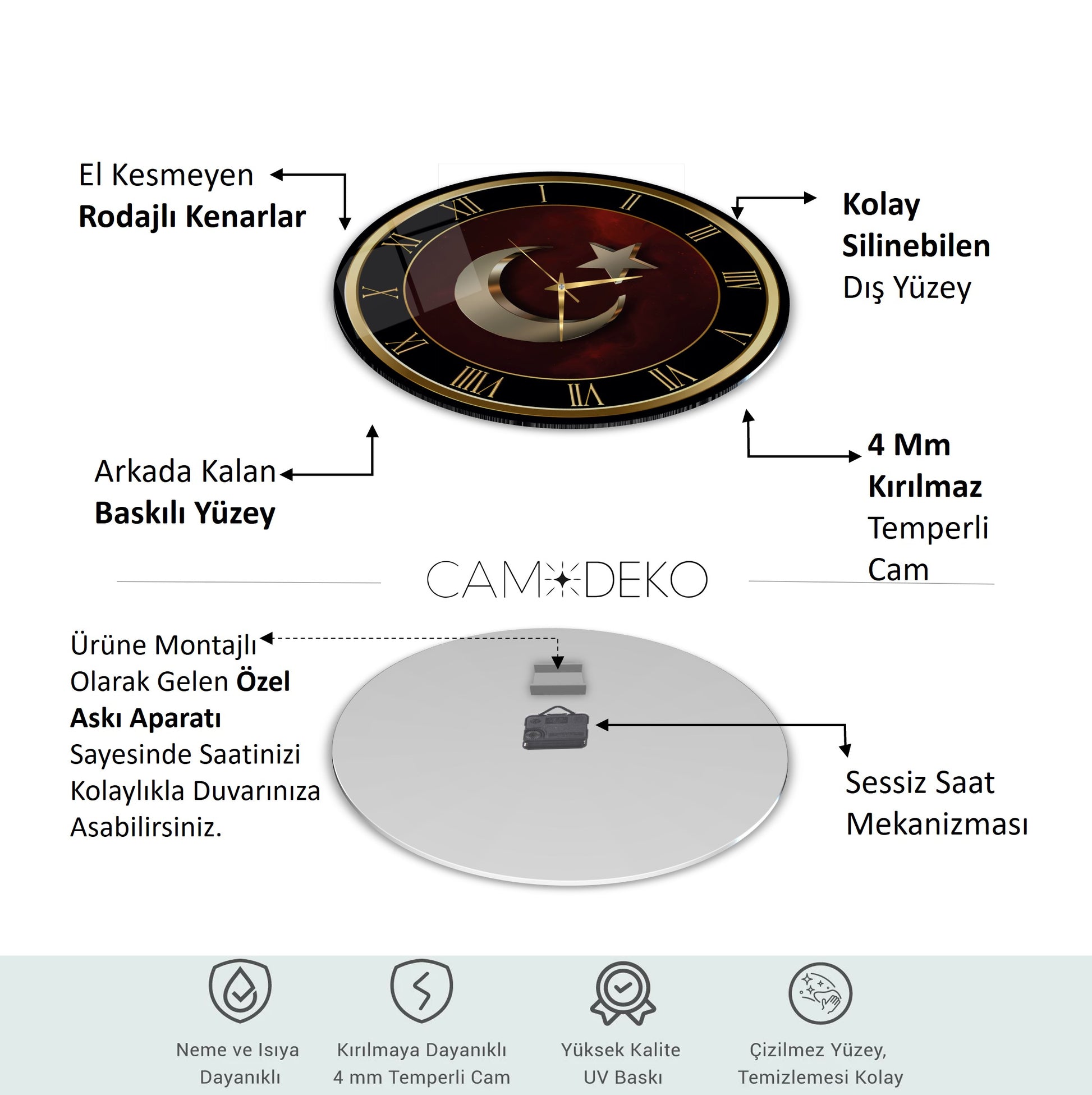 Saatlerimizde 4 mm kalınlığında ultra clear temperli cam kullanılır. Rodajlanmış (el kesmeyen) kenarları, hem güvenli hem de estetik bir görünüm sunar. Zamansız tasarımıyla ev ve ofis dekorasyonuna şıklık katar.