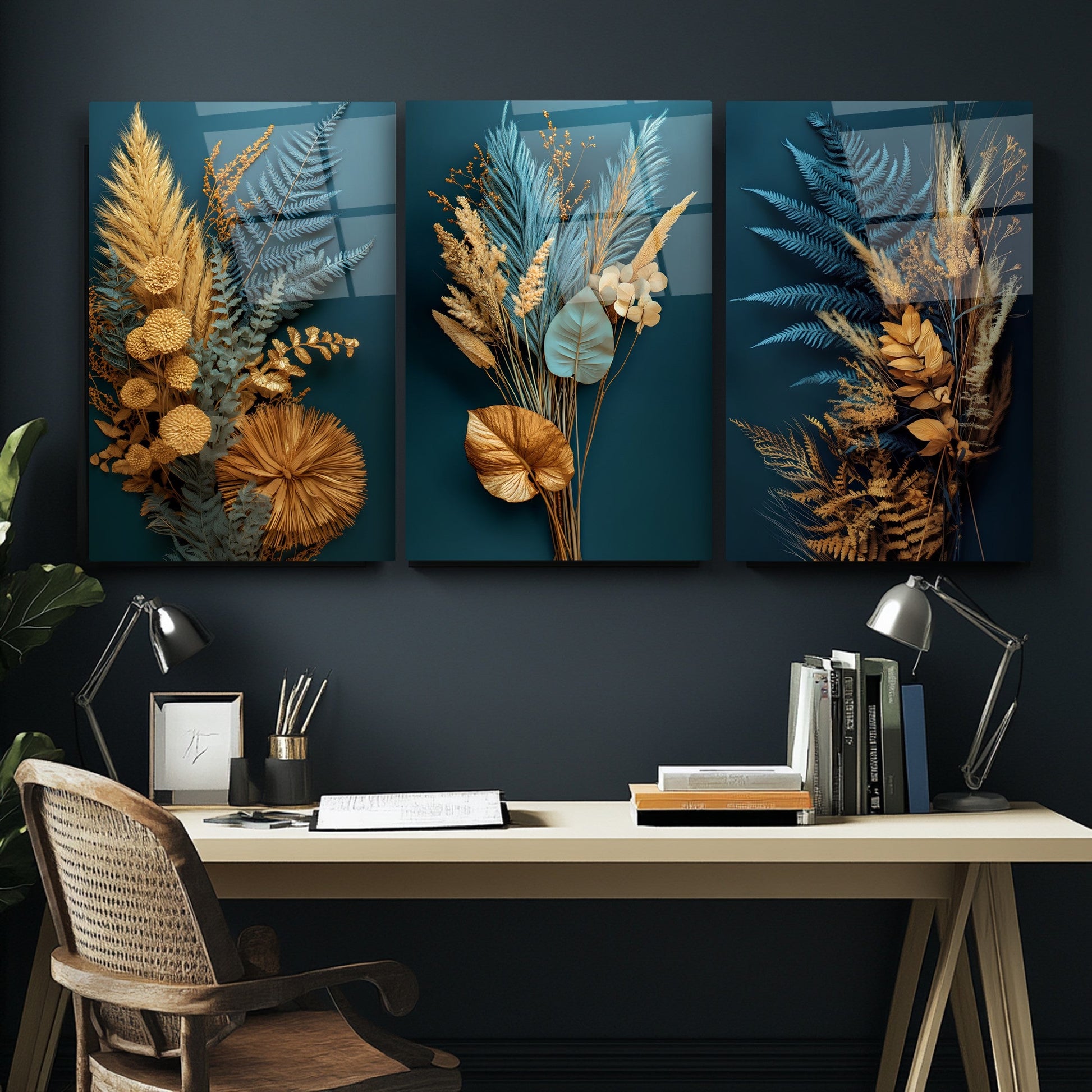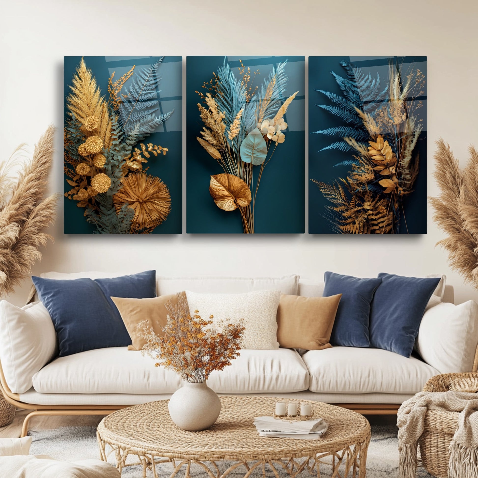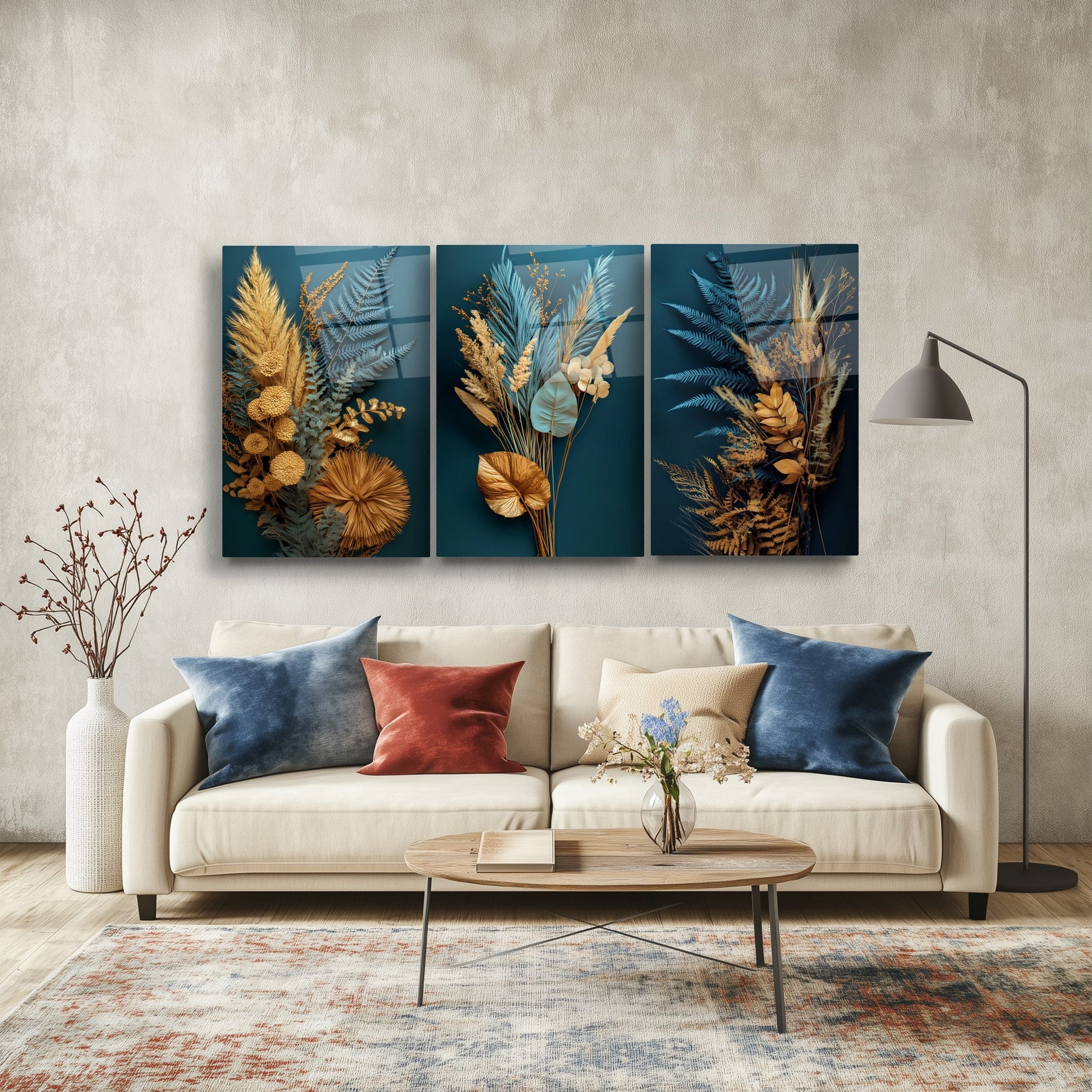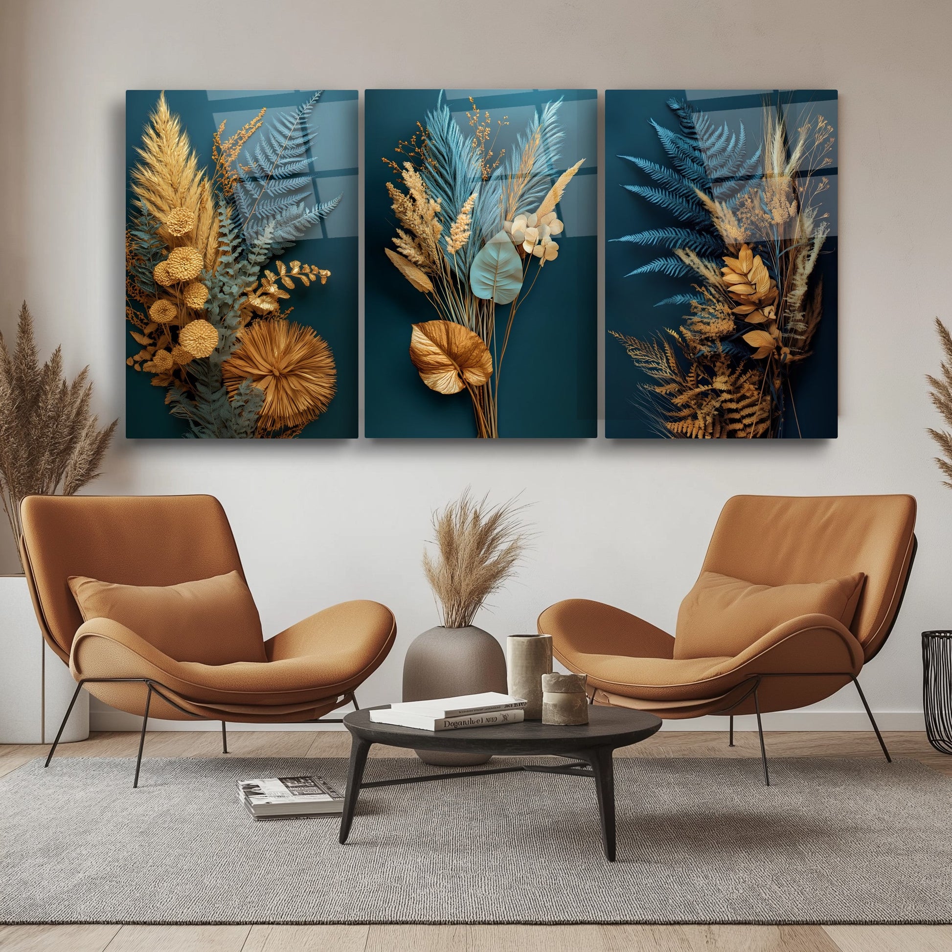 Lacivert ve kahverengi tonlarının öne çıktığı, kurumuş çiçek aranjmanı temalı bu üçlü cam tablo seti, boho ve minimal tarzları sevenler için ideal. Modern ve doğal dokunuşları bir araya getiren tasarımıyla salon, oturma odası veya çalışma alanlarına sıcaklık katar. Kırılmaz temperli cam ve UV baskı sayesinde uzun ömürlü ve canlı renklere sahiptir. Cam tablo, hem estetik hem de dayanıklı yapısıyla dekorasyonunuzu tamamlar, mekânınıza zarif bir hava kazandırır.