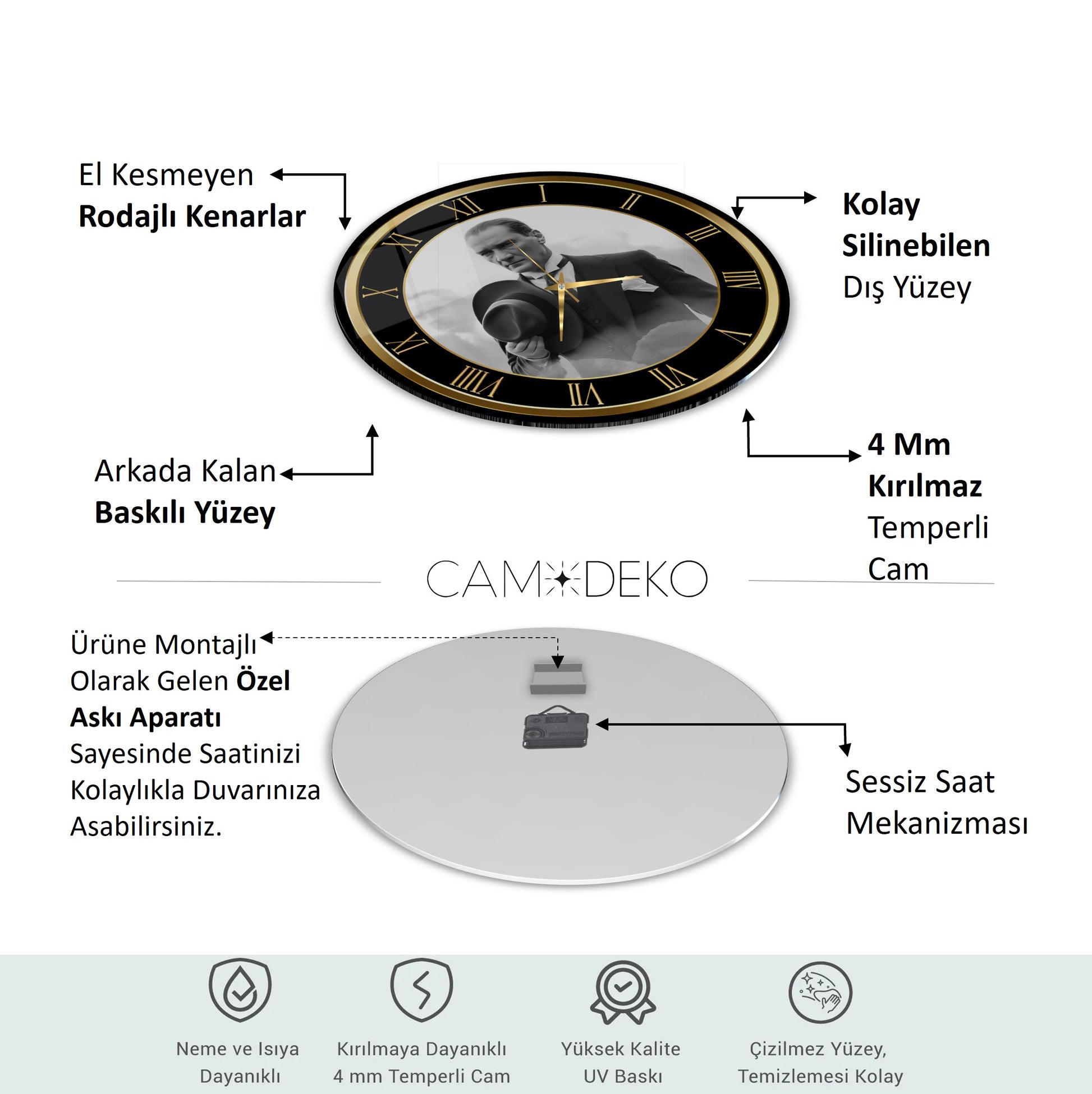 Cam saatlerimiz, son teknoloji UV baskı makineleriyle doğrudan cama uygulanır. Kağıt veya folyo yapıştırma kullanılmaz; baskılar camın arka yüzeyine işlenerek uzun ömürlü ve dayanıklı hale getirilir. Ek olarak, fırınlama boya işlemi ile güçlendirilerek solmaya ve deformasyona karşı ekstra koruma sağlanır.