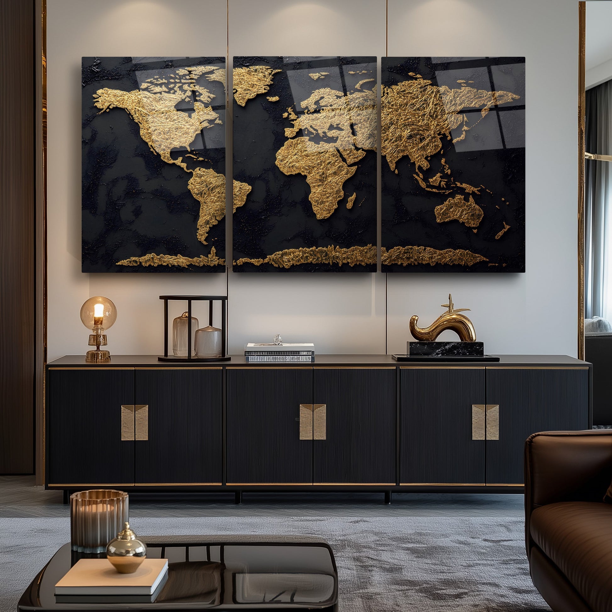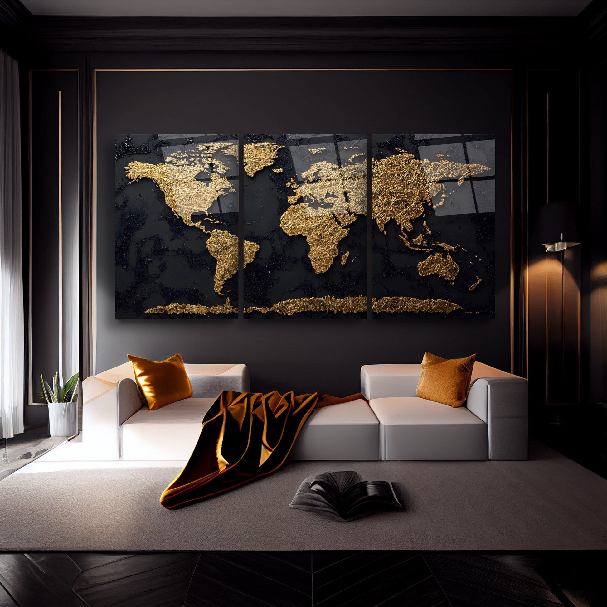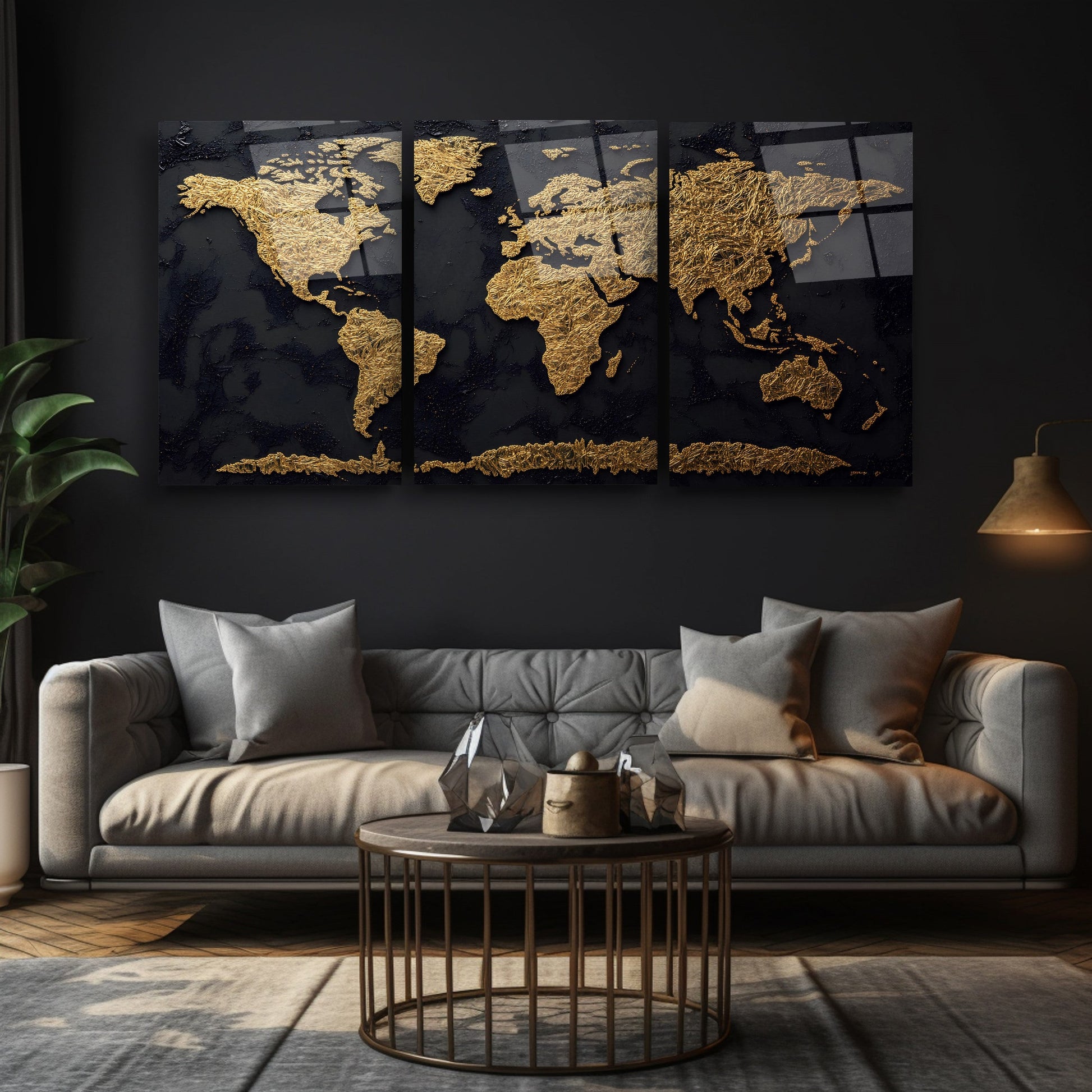 Gold Siyah Dünya Haritası Üçlü Set Cam Tablo