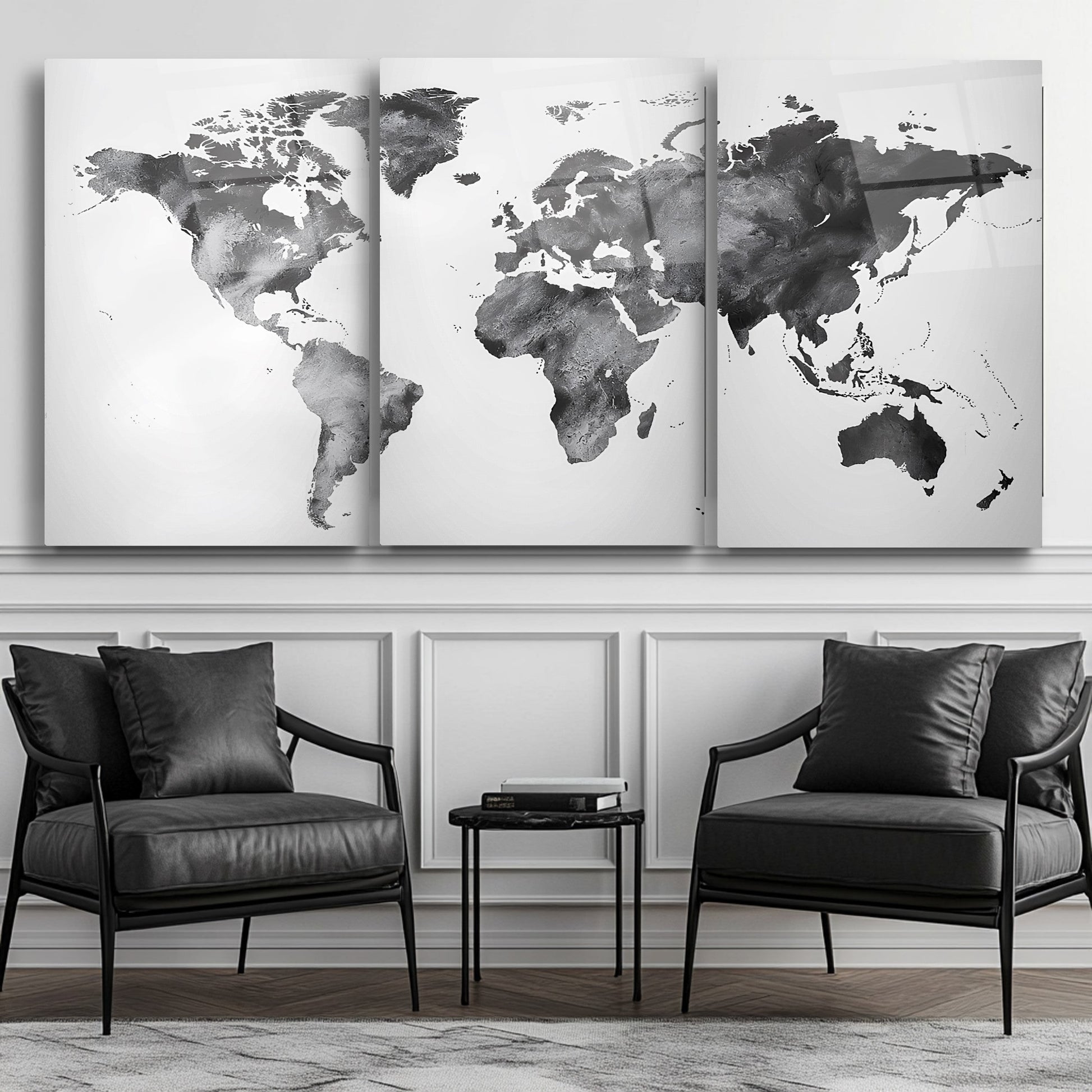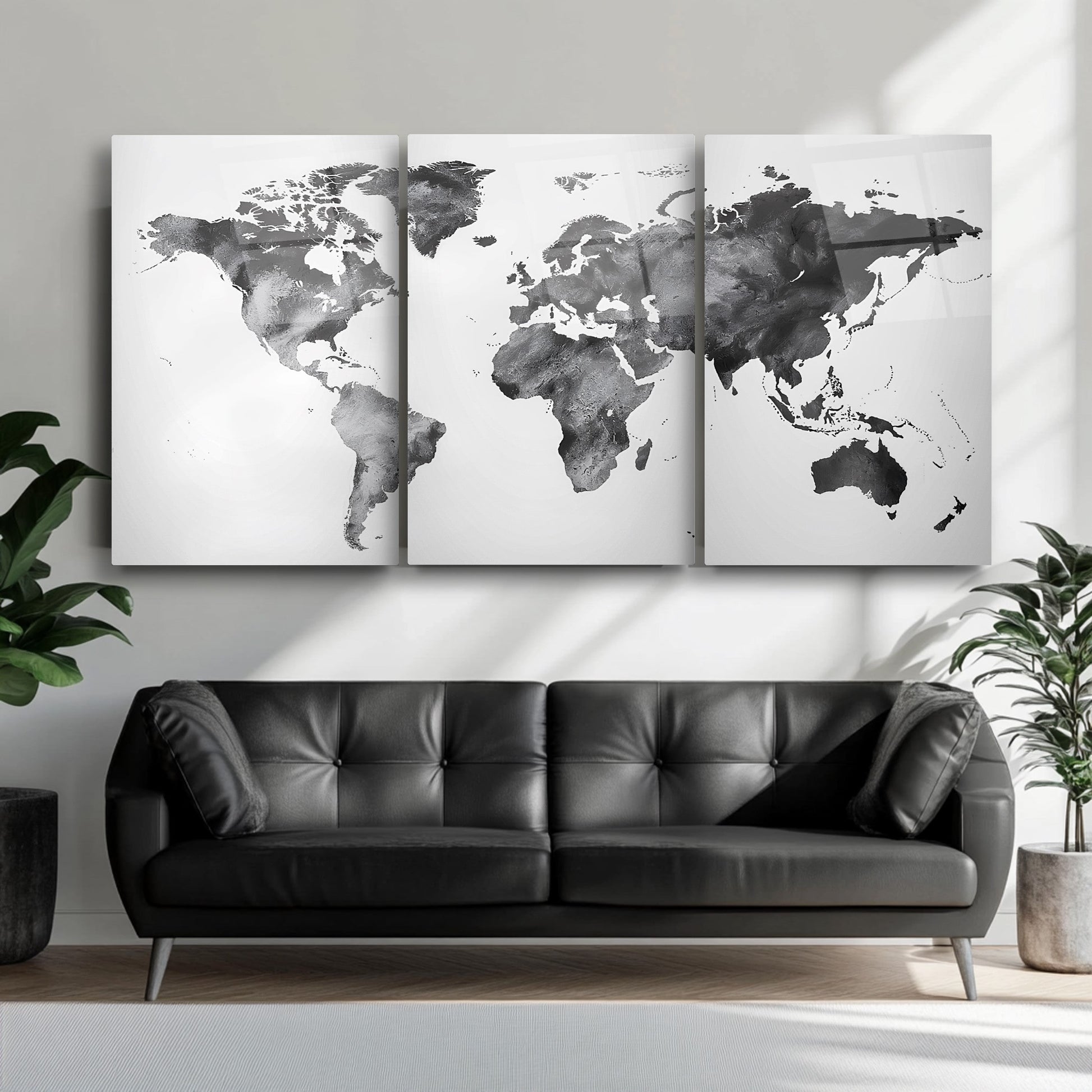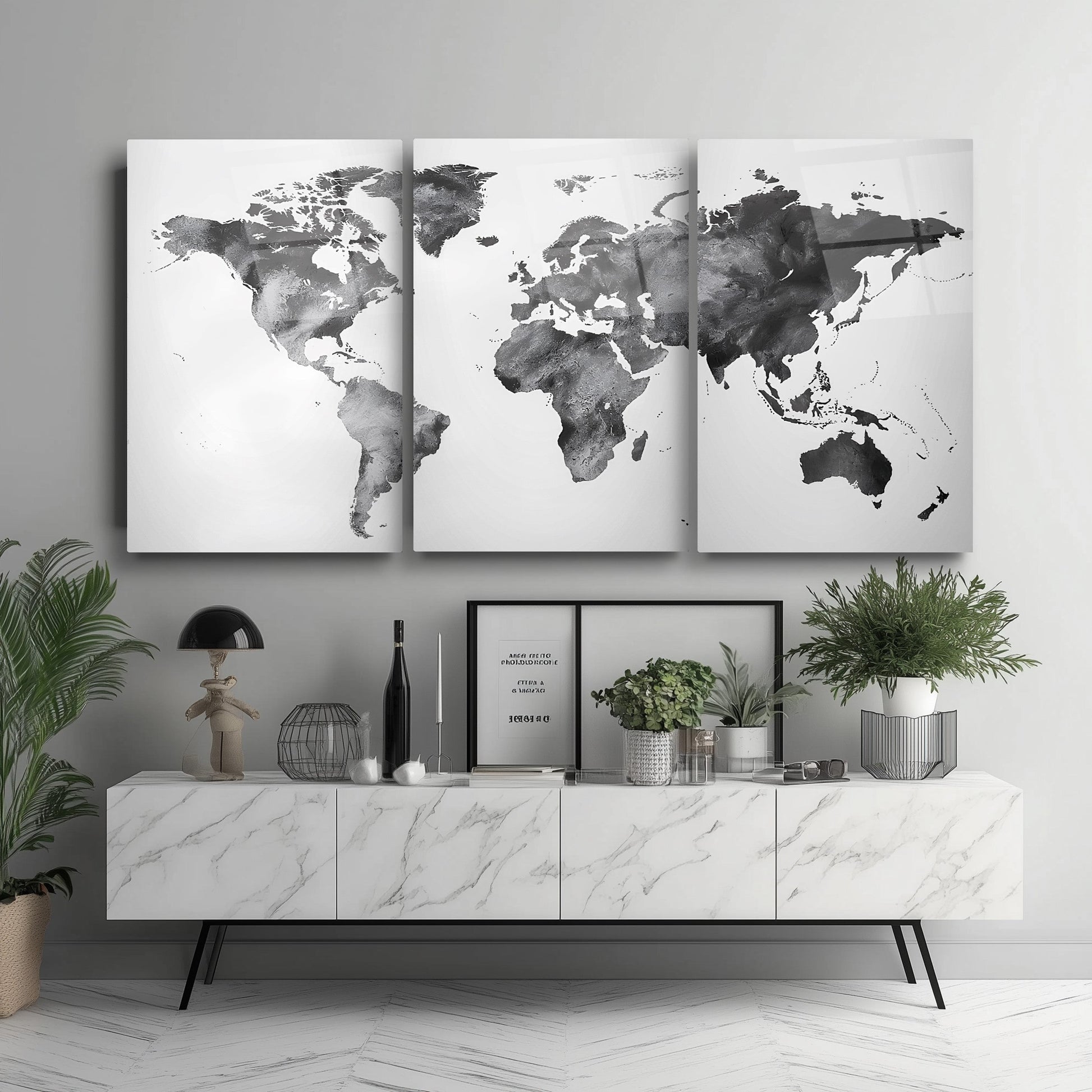 Siyah Beyaz Dünya Haritası Üçlü Set Cam Tablo
