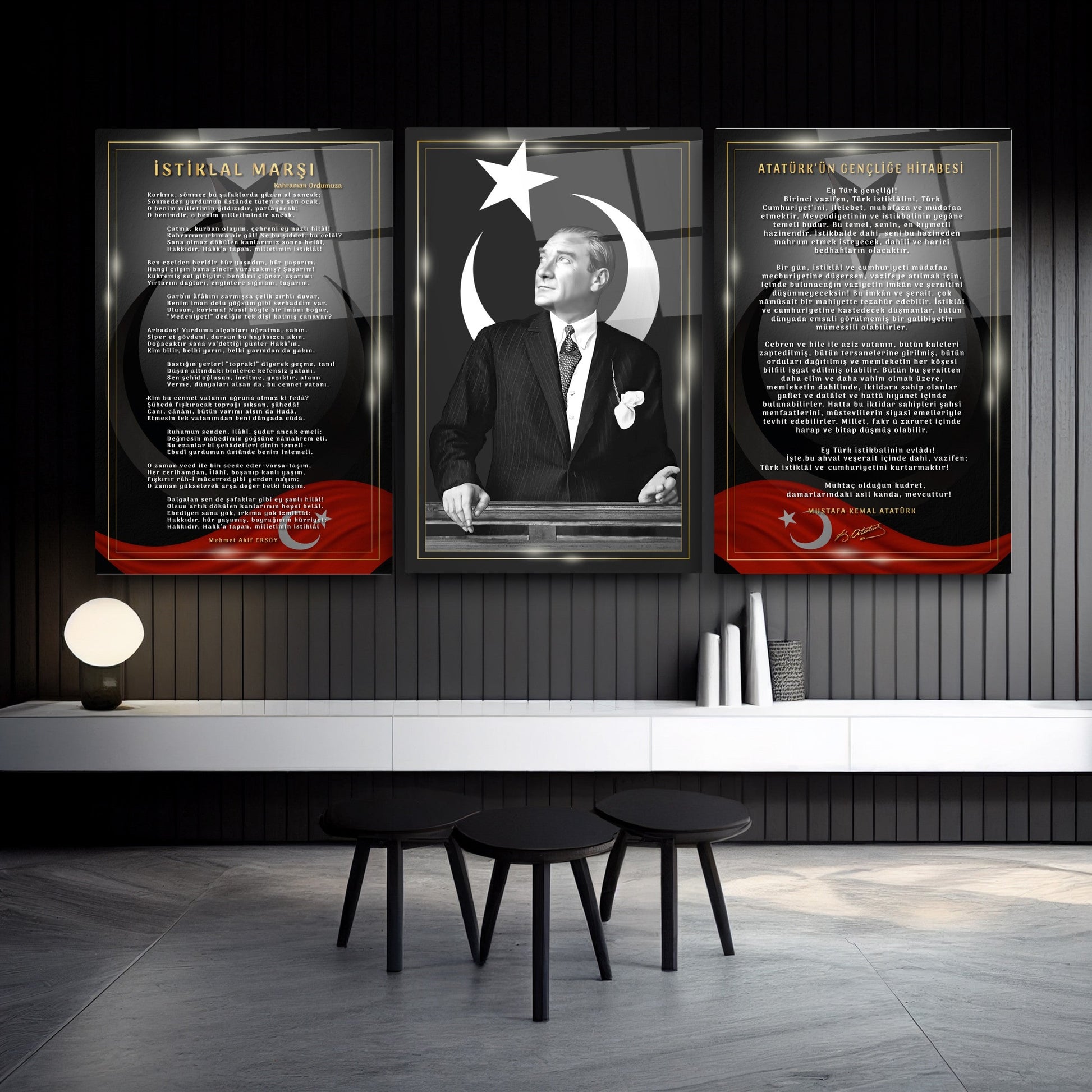 Okullar, ofisler ve makam odaları için özel olarak tasarlanmış bu üçlü set cam tablo, milli kimliğimizi ve değerlerimizi en şık şekilde duvarlarınıza yansıtır. Makam odası dekorasyonu ve Atatürk köşesi oluşturmak isteyenler için ideal bir çözüm sunan bu set, İstiklal Marşı'mızın coşkusunu, Ay yıldızlı Bayrağımızın asaletini ve Atatürk'ün ilham veren duruşunu bir araya getiriyor.