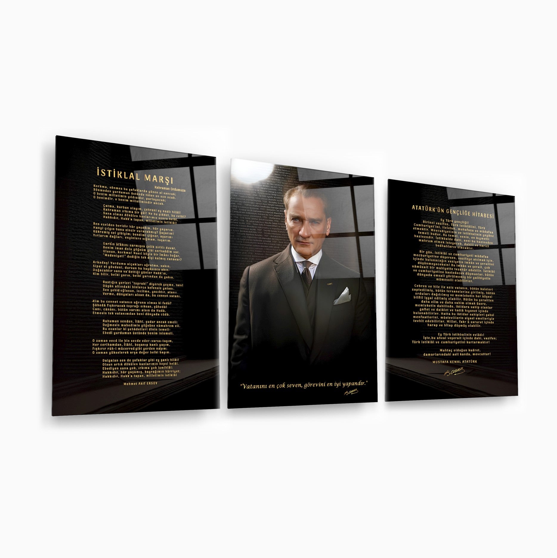 Kurumsal Alanların İhtişamlı Tamamlayıcısı: Bayrak Gençliğe Hitabe Atatürk Köşesi Modern Üçlü Set Cam Tablo