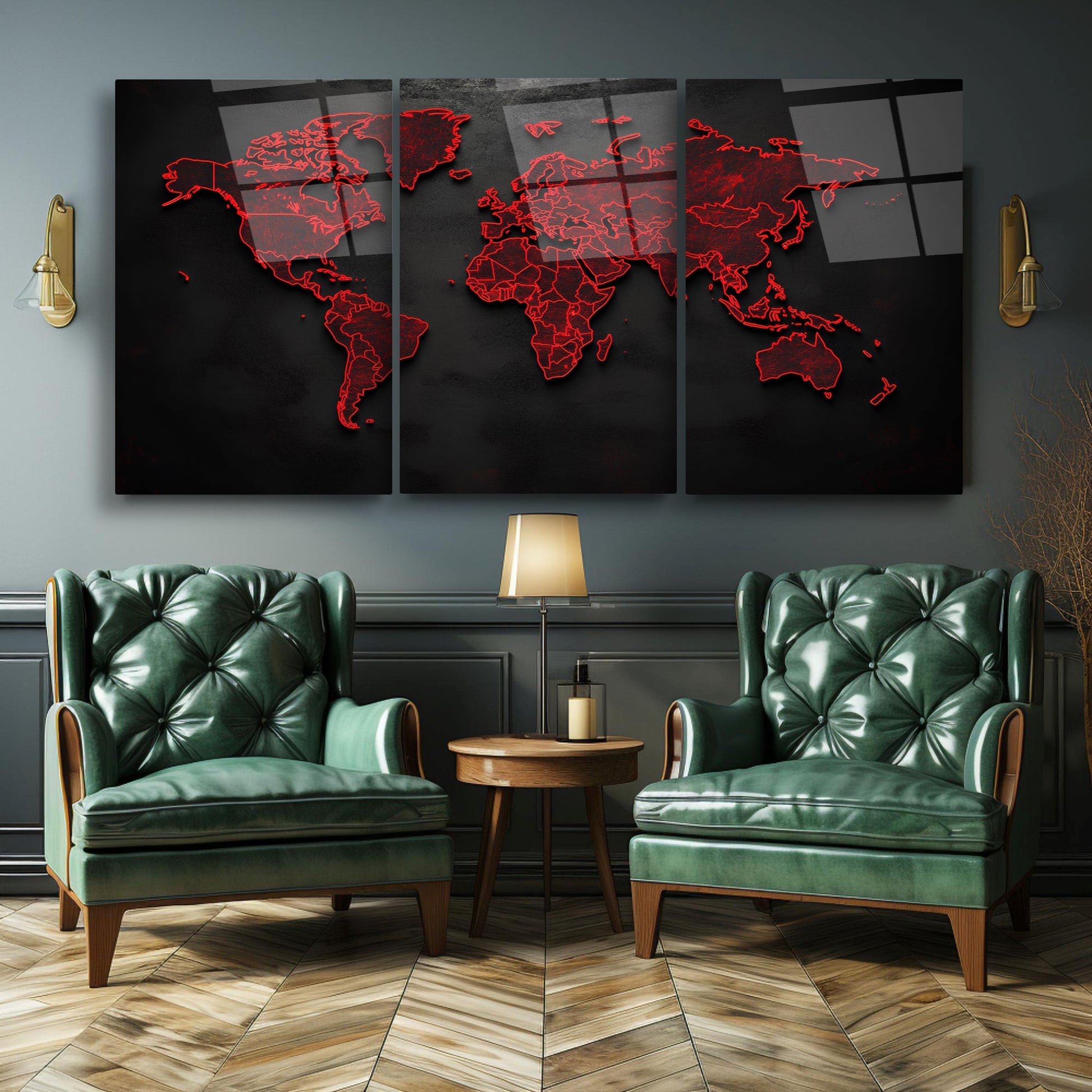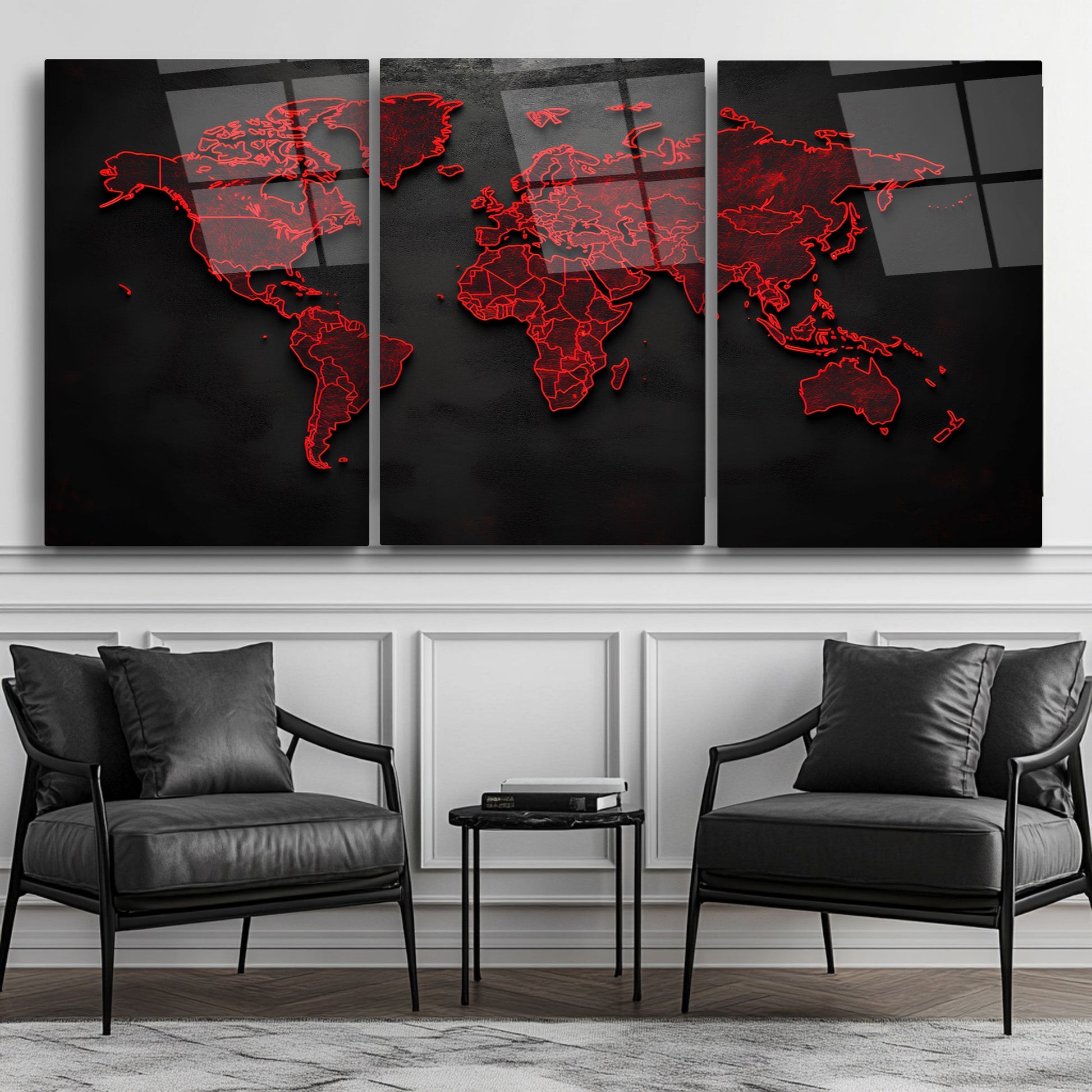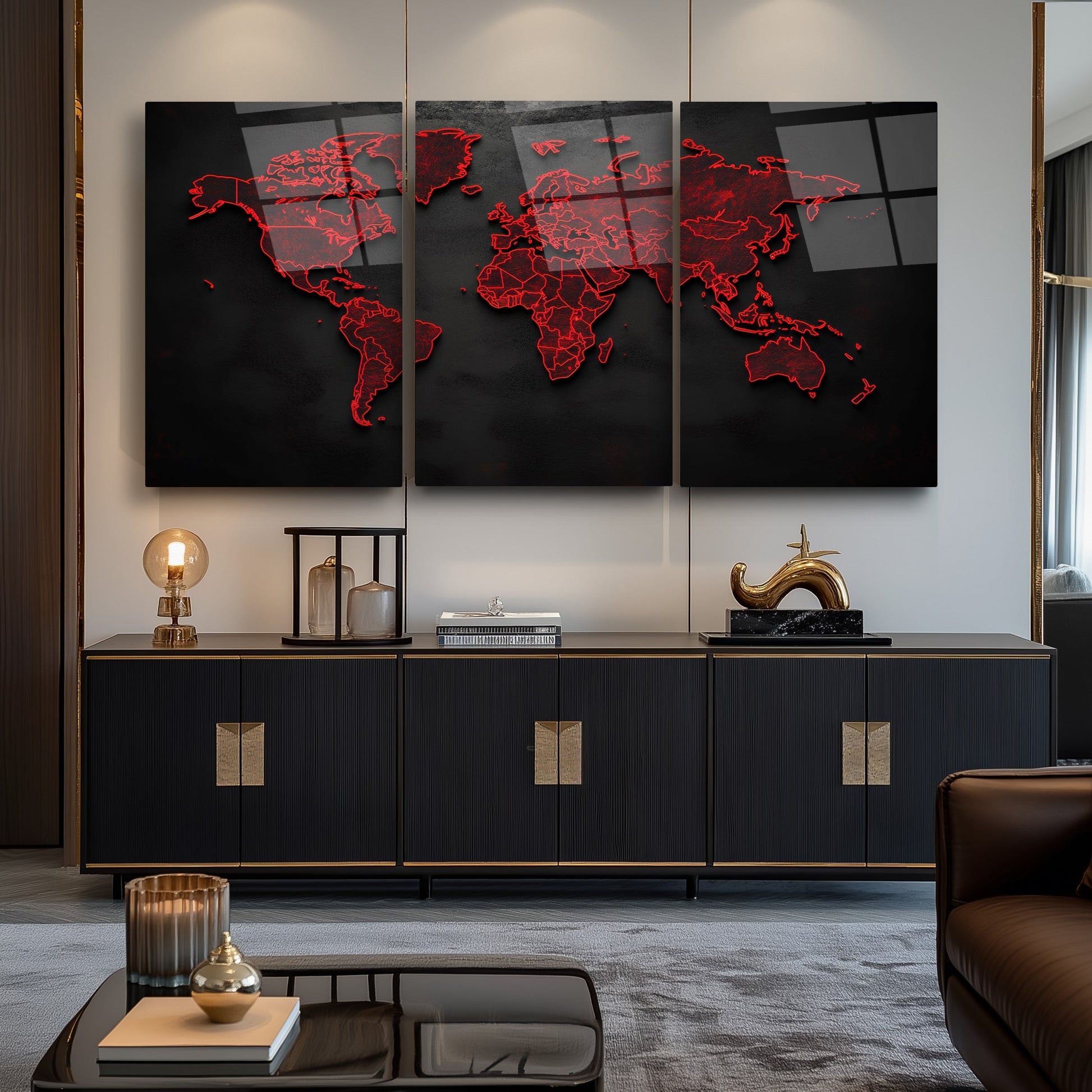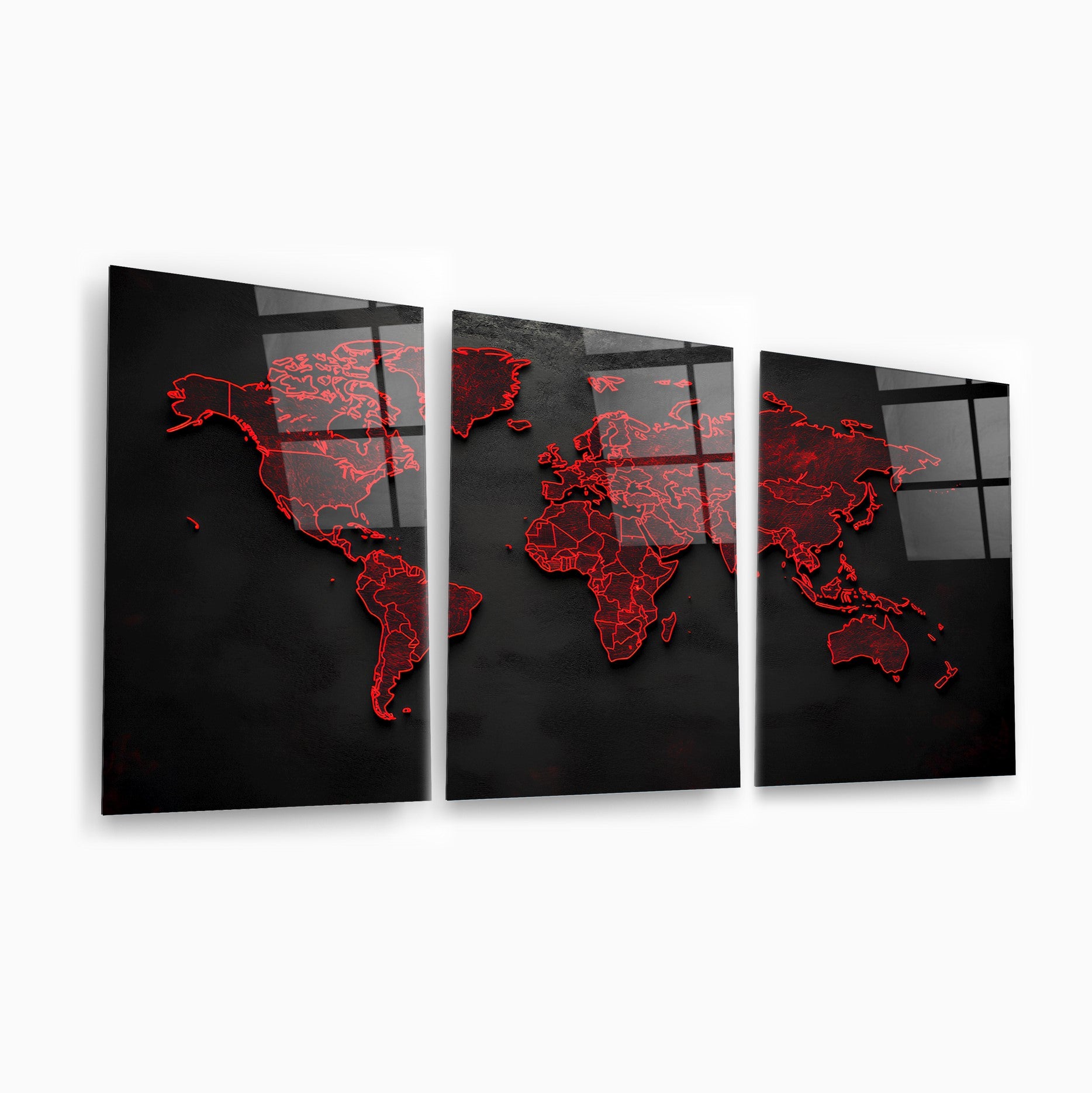 Kırmızı Detay Dünya Haritası Üçlü Set Cam Tablo