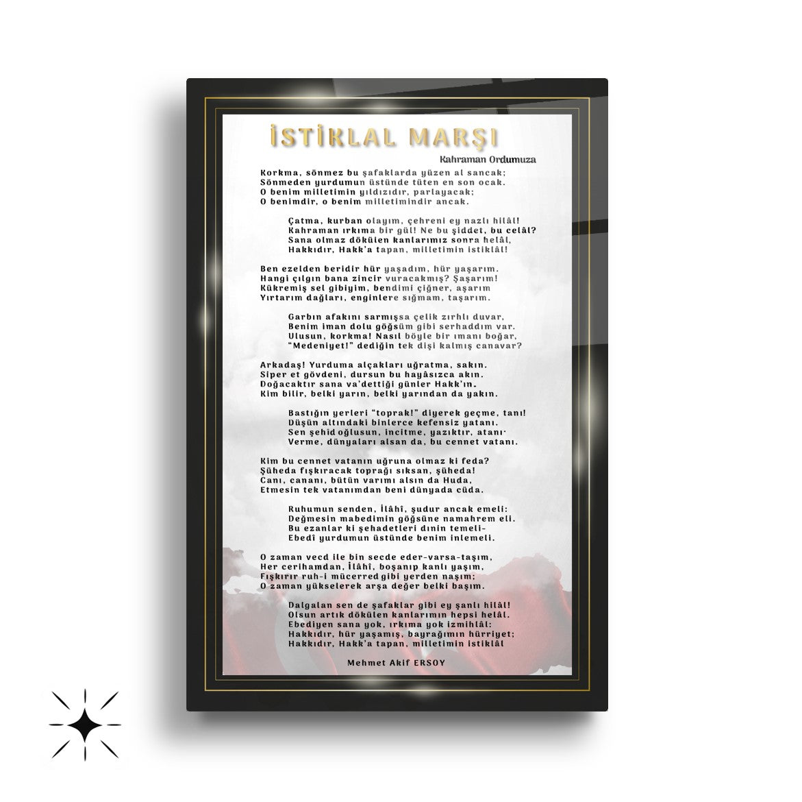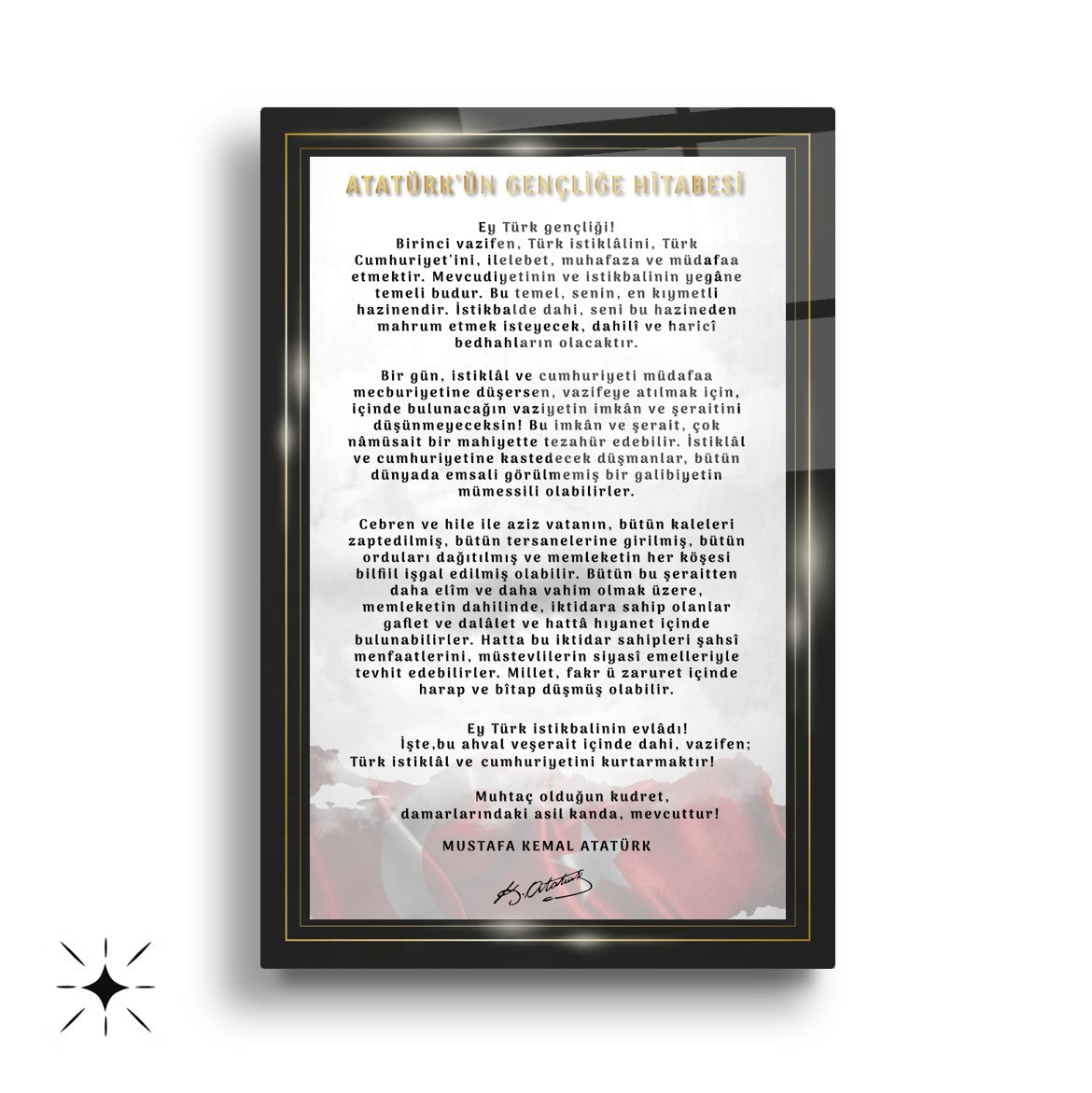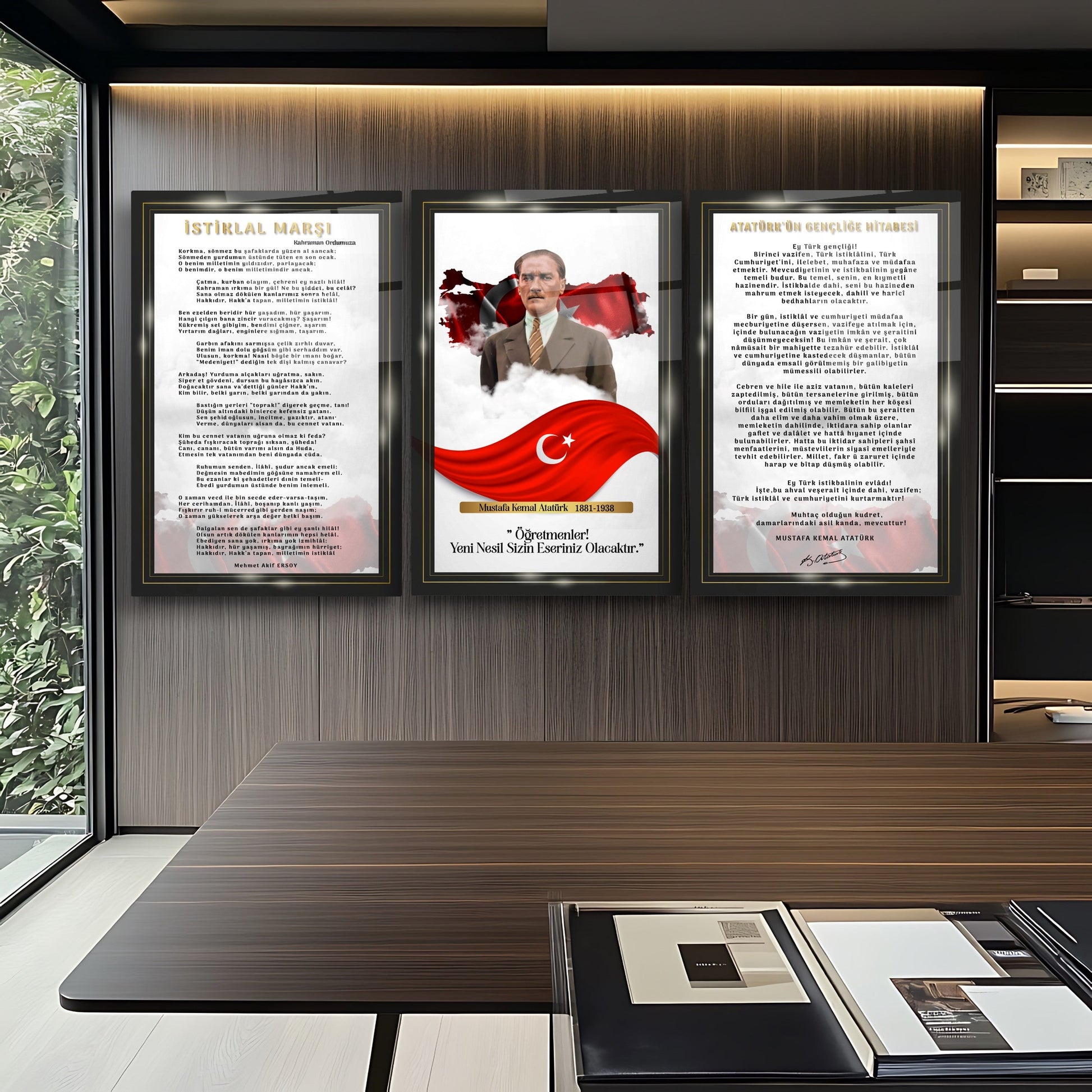Makam odaları, okullar ve ofisler için tasarlanmış bu modern üçlü set cam tablo ile mekanlarınıza milli bir kimlik kazandırın. Okul Atatürk köşesi ve makam odası dekorasyonu oluşturmak isteyenler için mükemmel bir seçim olan bu set, İstiklal Marşı'mızın coşkusunu, Atatürk'ün Gençliğe Hitabesi'nin yol gösteren sözlerini ve modern bir estetiği bir araya getiriyor.