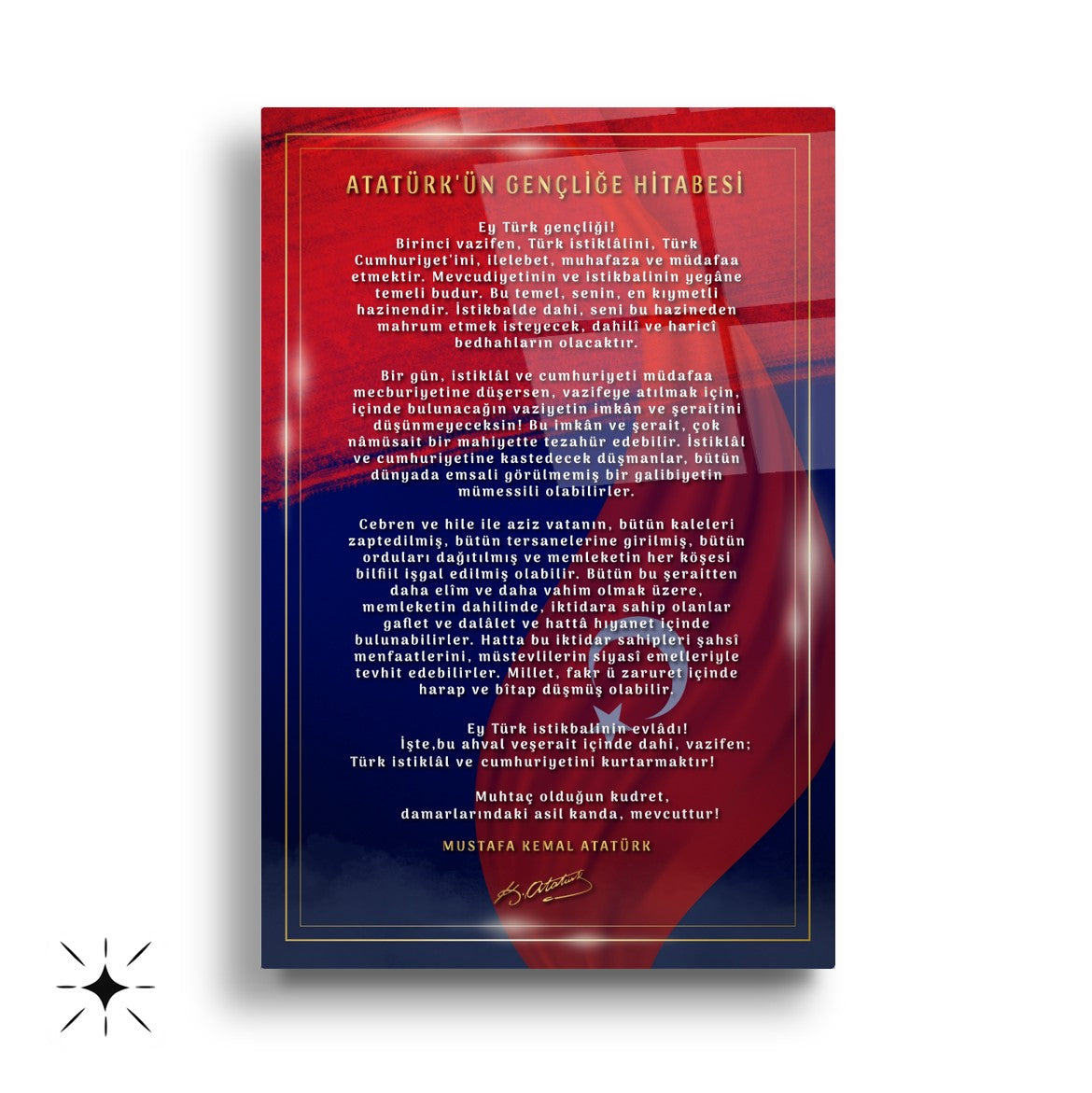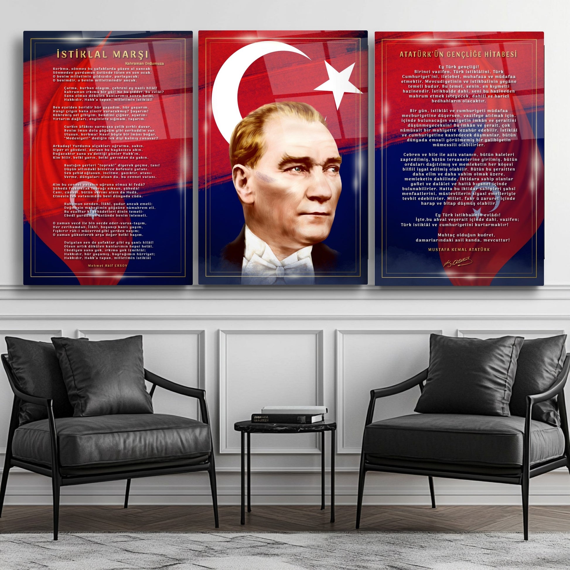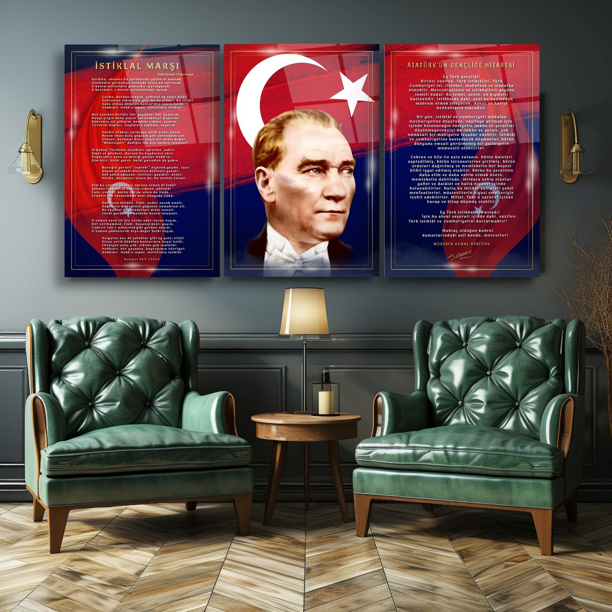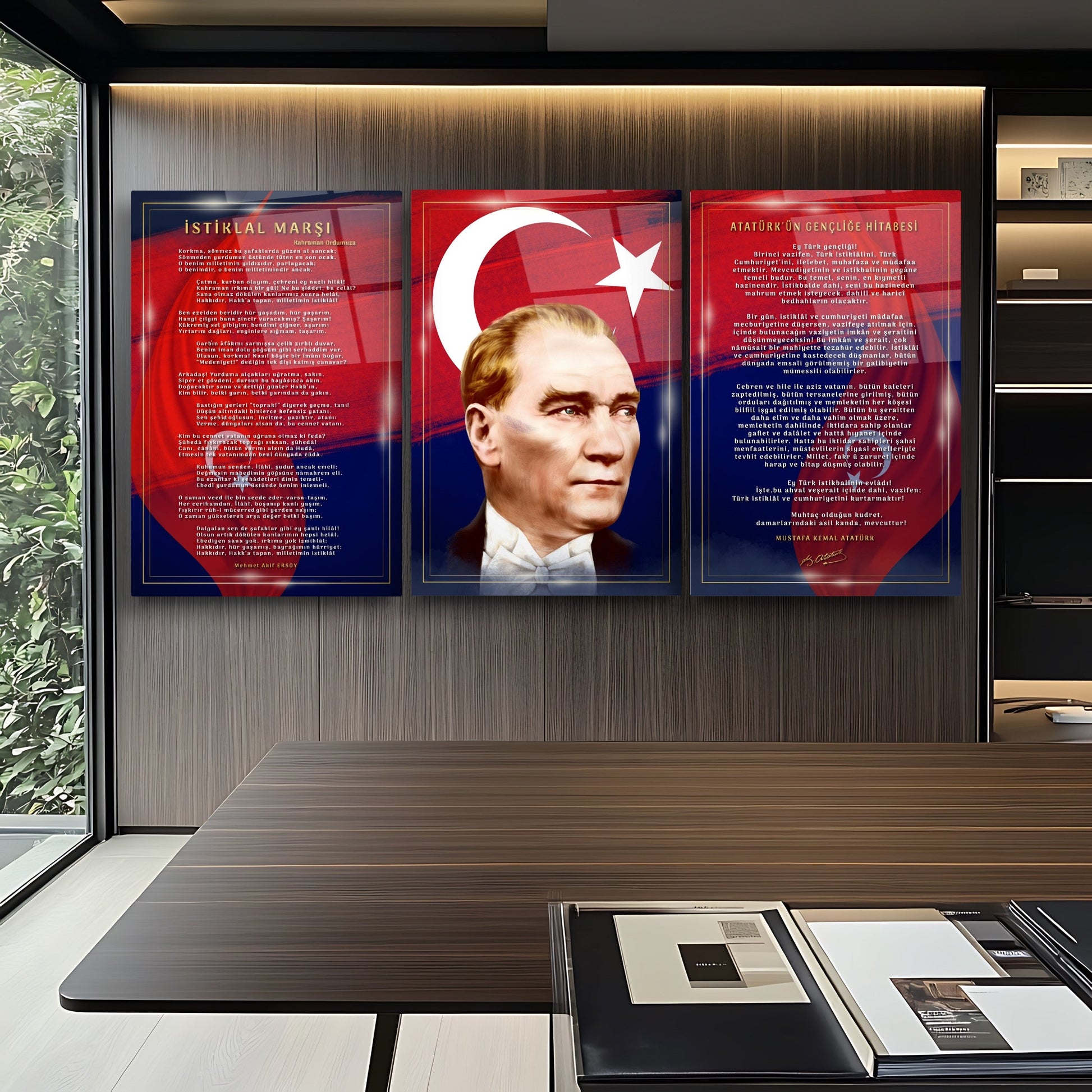 Bu tablo seti, makam odanızın veya okulunuzun duvarlarında sergilenerek, çalışanlarınıza, öğrencilerinize ve ziyaretçilerinize her gün ilham verecek bir atmosfer yaratır. Ulu Önder'in evrensel ilkelerini ve ileri görüşlülüğünü modern bir sanat eseriyle ifade edin. Bu set, çalışma ortamınızın ciddiyetini ve saygınlığını artırırken, eğitim kurumlarında genç nesillere milli değerleri benimsetmede önemli bir rol oynar.