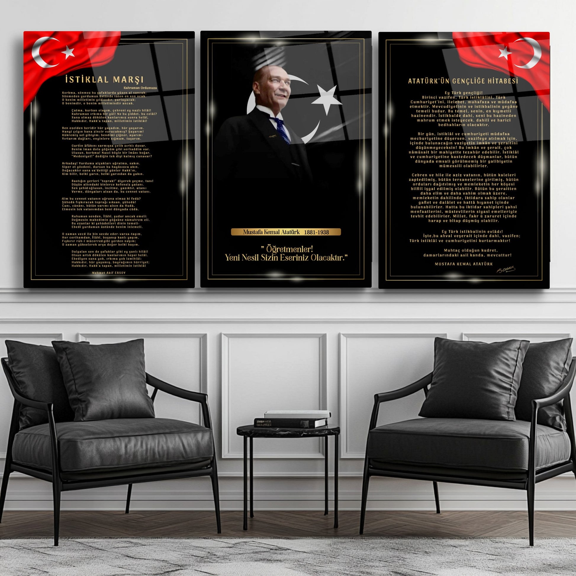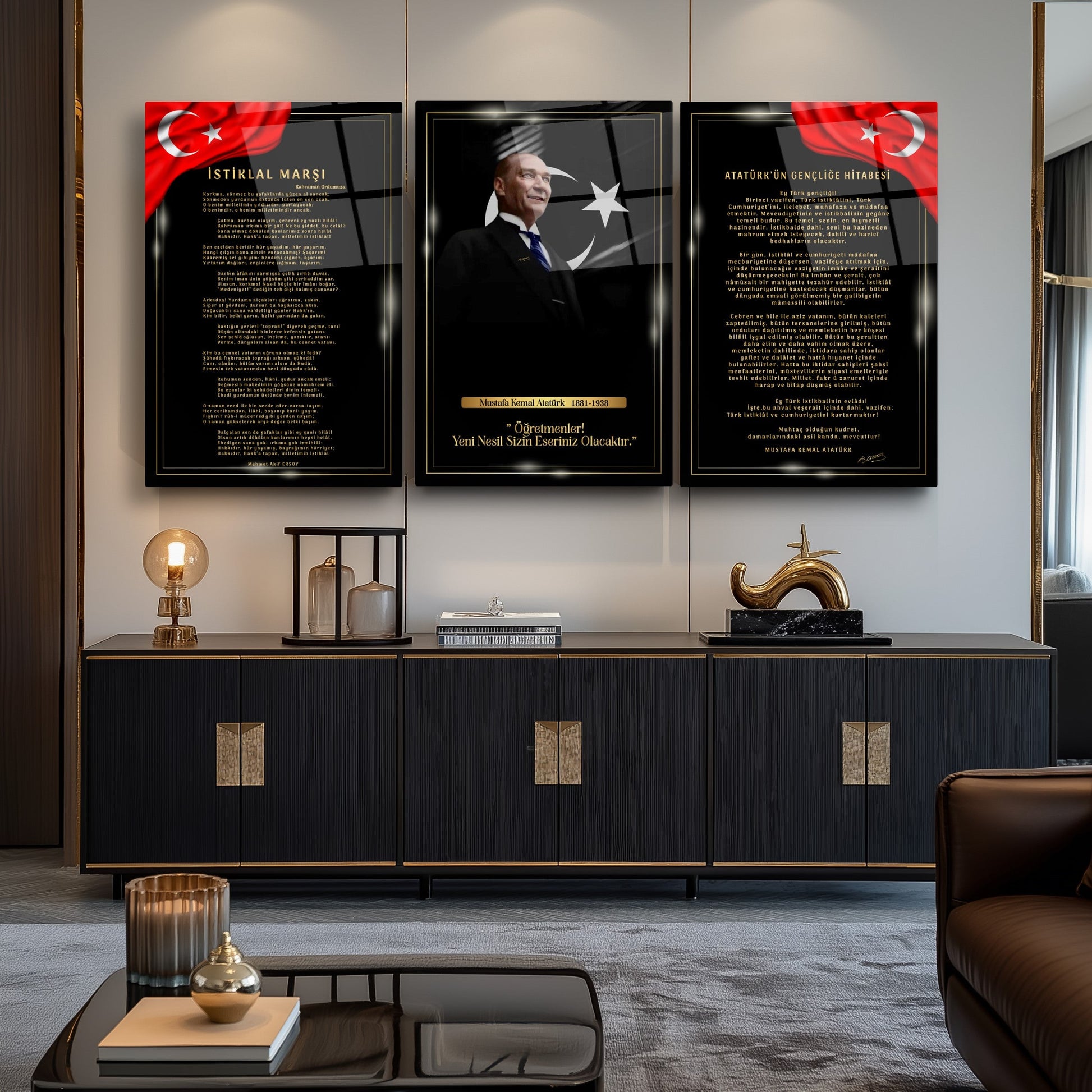Bu set, sadece bir dekorasyon parçası değil, aynı zamanda bulunduğunuz ortama derin bir anlam katar. Her baktığınızda milli marşımızın coşkusunu, Gençliğe Hitabe'nin emanetini ve Atatürk'ün vizyonunu hissedersiniz. Okul duvar dekorunuzu veya makam odası dekorasyonunuzu bu anlamlı setle zenginleştirerek, çalışanlarınıza, ziyaretçilerinize ve öğrencilerinize milli bilinç aşılayın.