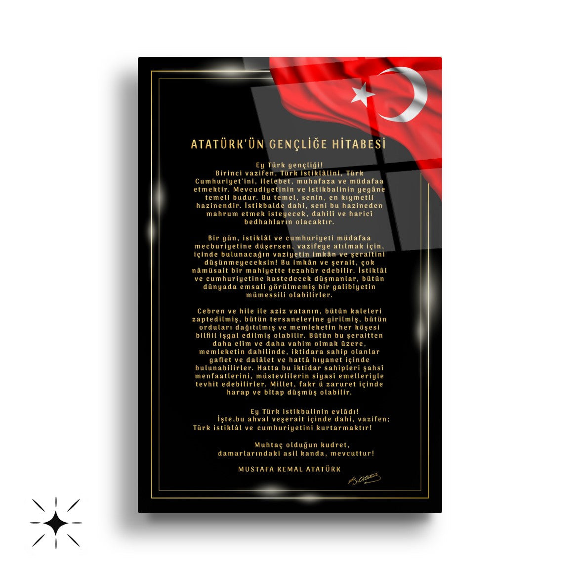 Makam odaları, ofisler ve eğitim kurumları için özel olarak tasarlanmış bu üçlü set cam tablo, milli değerlerimizi duvarlarınıza taşıyor. Atatürk köşesi oluşturmak isteyenler için ideal bir çözüm sunan bu set, İstiklal Marşı'mızın anlam dolu dizelerini, Atatürk'ün Gençliğe Hitabesi'nin yol gösteren sözlerini ve Büyük Önder'in ilham veren duruşunu bir araya getiriyor.