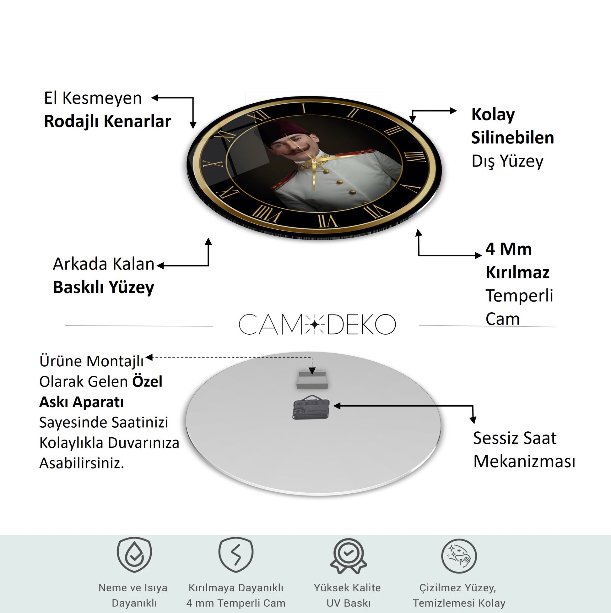 Cam saatlerimiz, son teknoloji UV baskı makineleriyle doğrudan cama uygulanır. Kağıt veya folyo yapıştırma kullanılmaz; baskılar camın arka yüzeyine işlenerek uzun ömürlü ve dayanıklı hale getirilir. Ek olarak, fırınlama boya işlemi ile güçlendirilerek solmaya ve deformasyona karşı ekstra koruma sağlanır.
