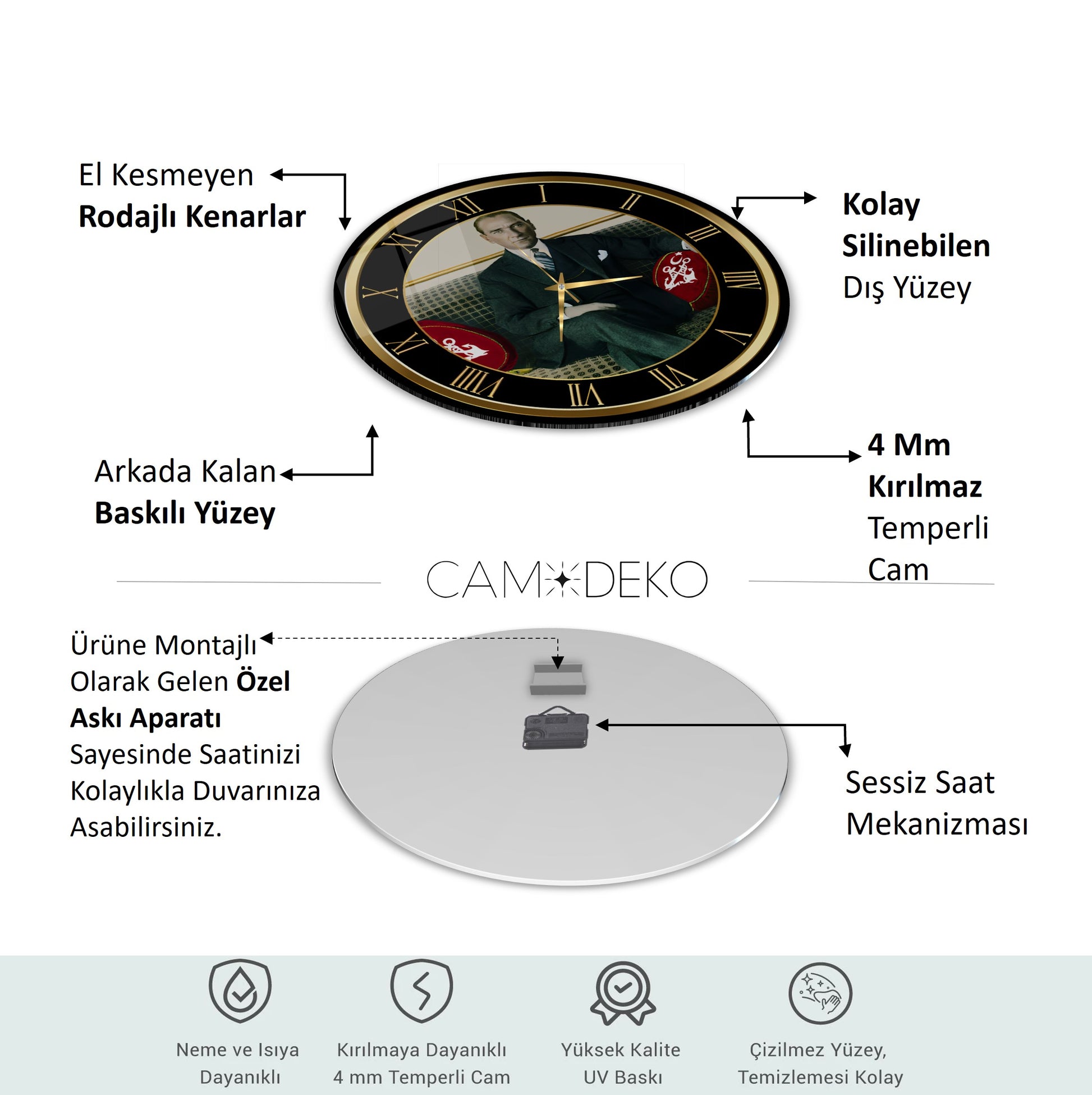 Saatlerimizde 4 mm kalınlığında ultra clear temperli cam kullanılır. Rodajlanmış (el kesmeyen) kenarları, hem güvenli hem de estetik bir görünüm sunar. Zamansız tasarımıyla ev ve ofis dekorasyonuna şıklık katar.