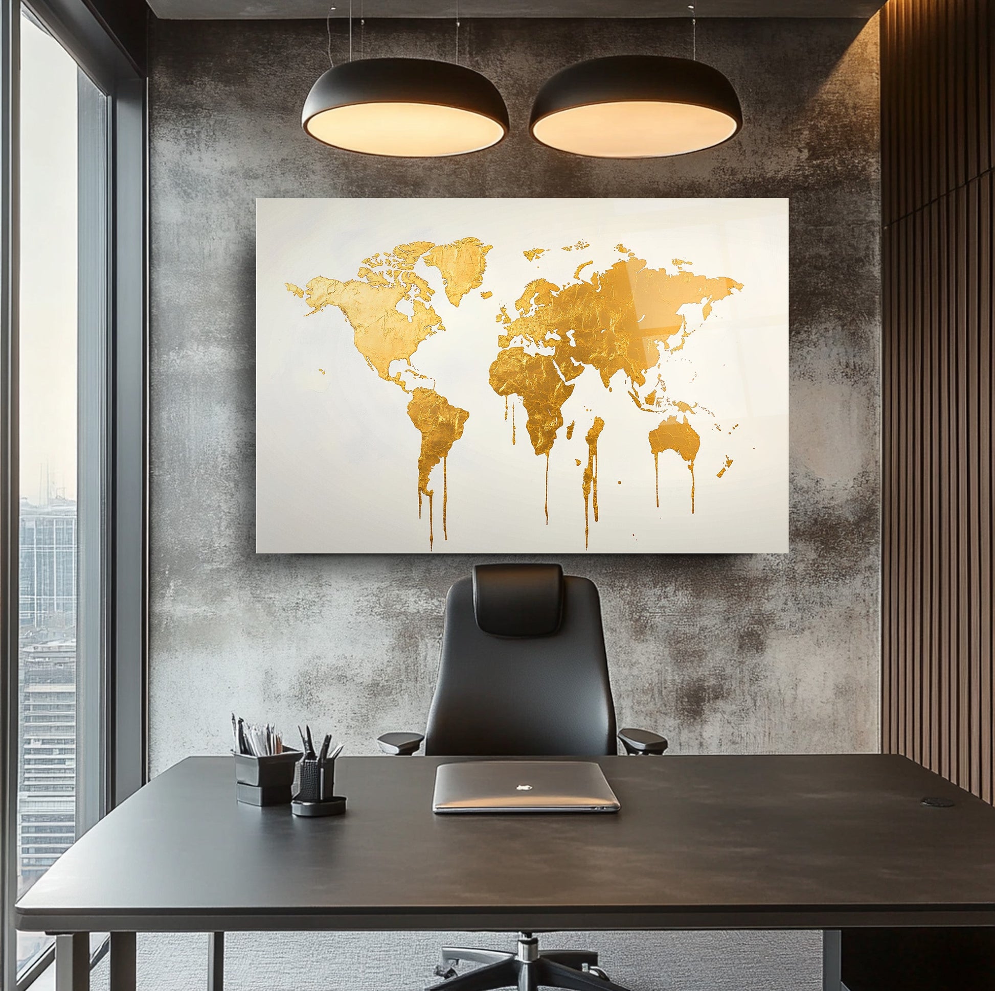 CamDeko'dan iş ve yaşam alanlarınıza modern bir prestij katan özel bir eser: Makam Odası Toplantı Salonu Beyaz Gold Dünya Haritası Kırılmaz Modern Gerçek Cam Tablo! Küresel düşüncenin ve başarının sembolü Dünya Haritası, saf beyaz ve lüks gold detaylarıyla toplantı odanıza, makam odanıza, ofisinize veya evinize ilham veren bir atmosfer katıyor.