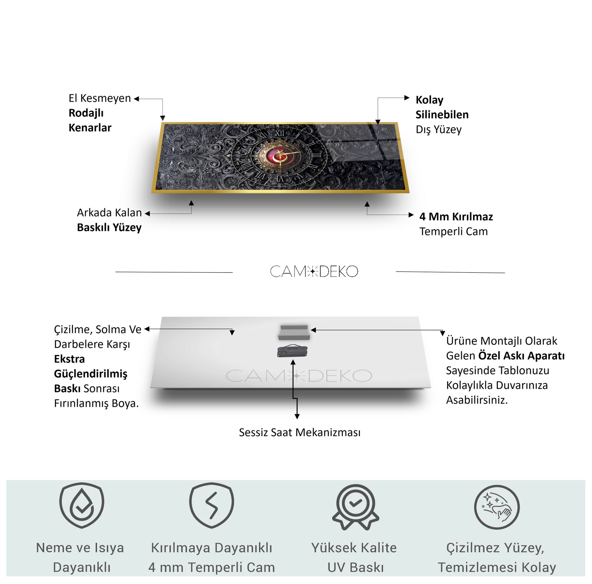 Cam saatlerimiz, son teknoloji UV baskı makineleriyle doğrudan cama uygulanır. Kağıt veya folyo yapıştırma kullanılmaz; baskılar camın arka yüzeyine işlenerek uzun ömürlü ve dayanıklı hale getirilir. Ek olarak, fırınlama boya işlemi ile güçlendirilerek solmaya ve deformasyona karşı ekstra koruma sağlanır.