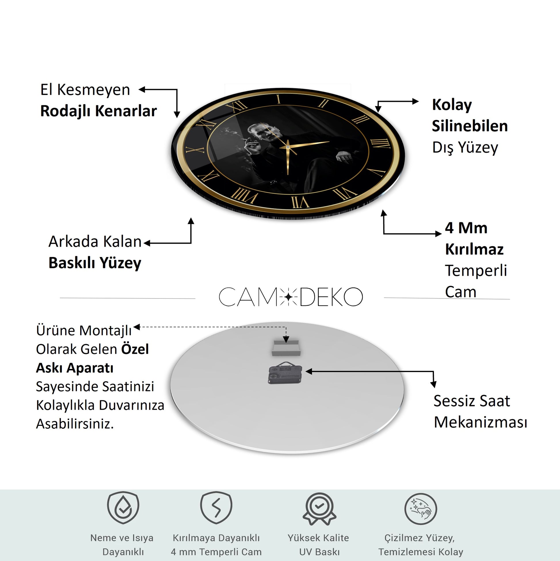 Cam saatlerimiz, son teknoloji UV baskı makineleriyle doğrudan cama uygulanır. Kağıt veya folyo yapıştırma kullanılmaz; baskılar camın arka yüzeyine işlenerek uzun ömürlü ve dayanıklı hale getirilir. Ek olarak, fırınlama boya işlemi ile güçlendirilerek solmaya ve deformasyona karşı ekstra koruma sağlanır.