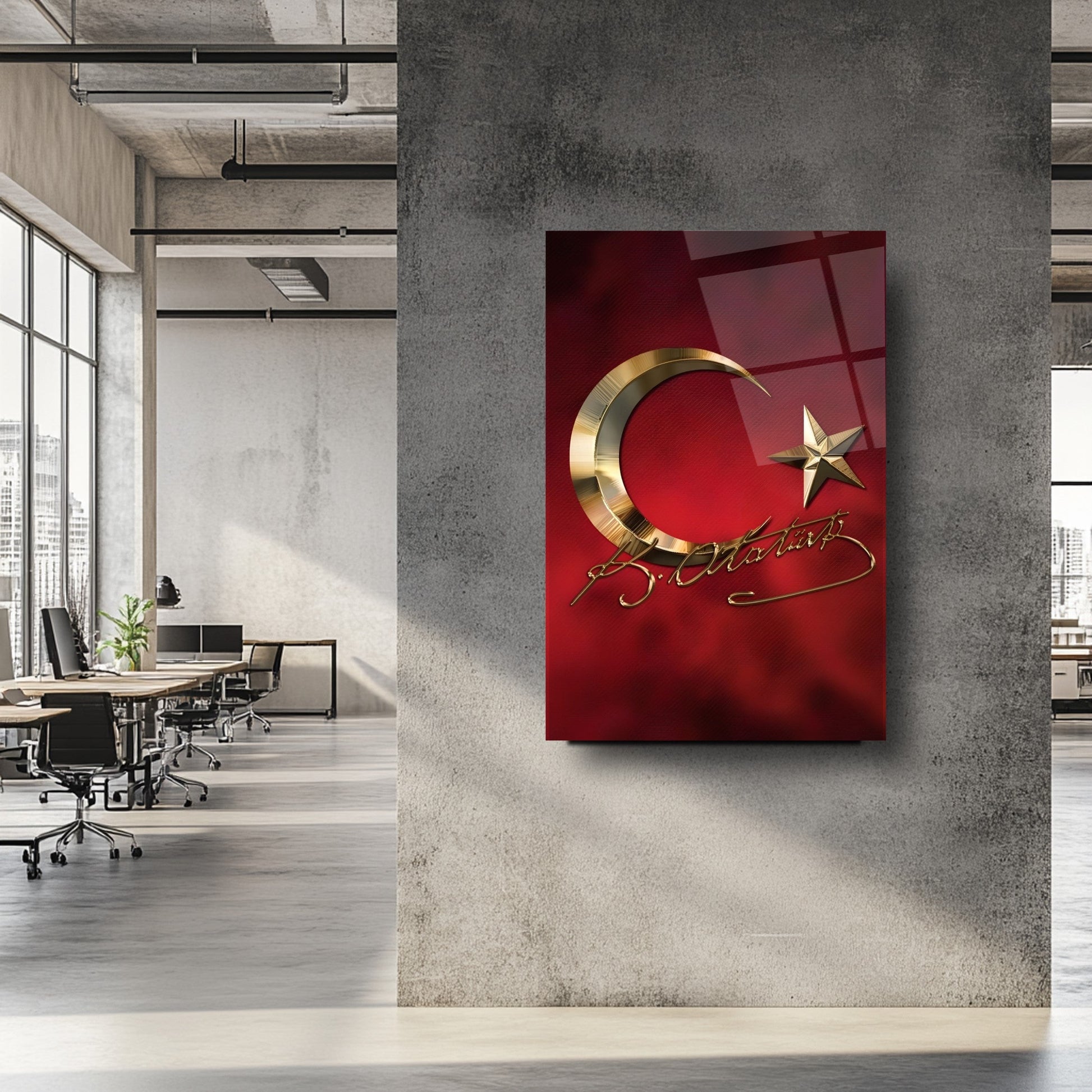 CamDeko'dan resmi ve kurumsal alanlarınıza milli bir gurur katan özel bir eser: Makam Odası Toplantı Salonu Okul Gold Atatürk İmzalı Türk Bayrak Kırılmaz Modern UV Baskı Cam Tablo! Şanlı Türk Bayrağımızın asaleti, Ulu Önder Mustafa Kemal Atatürk'ün şahsi imzası ve göz alıcı gold detaylarıyla makam odanıza, okulunuza, toplantı salonunuza, ofis veya evinize derin bir anlam ve estetik katın.