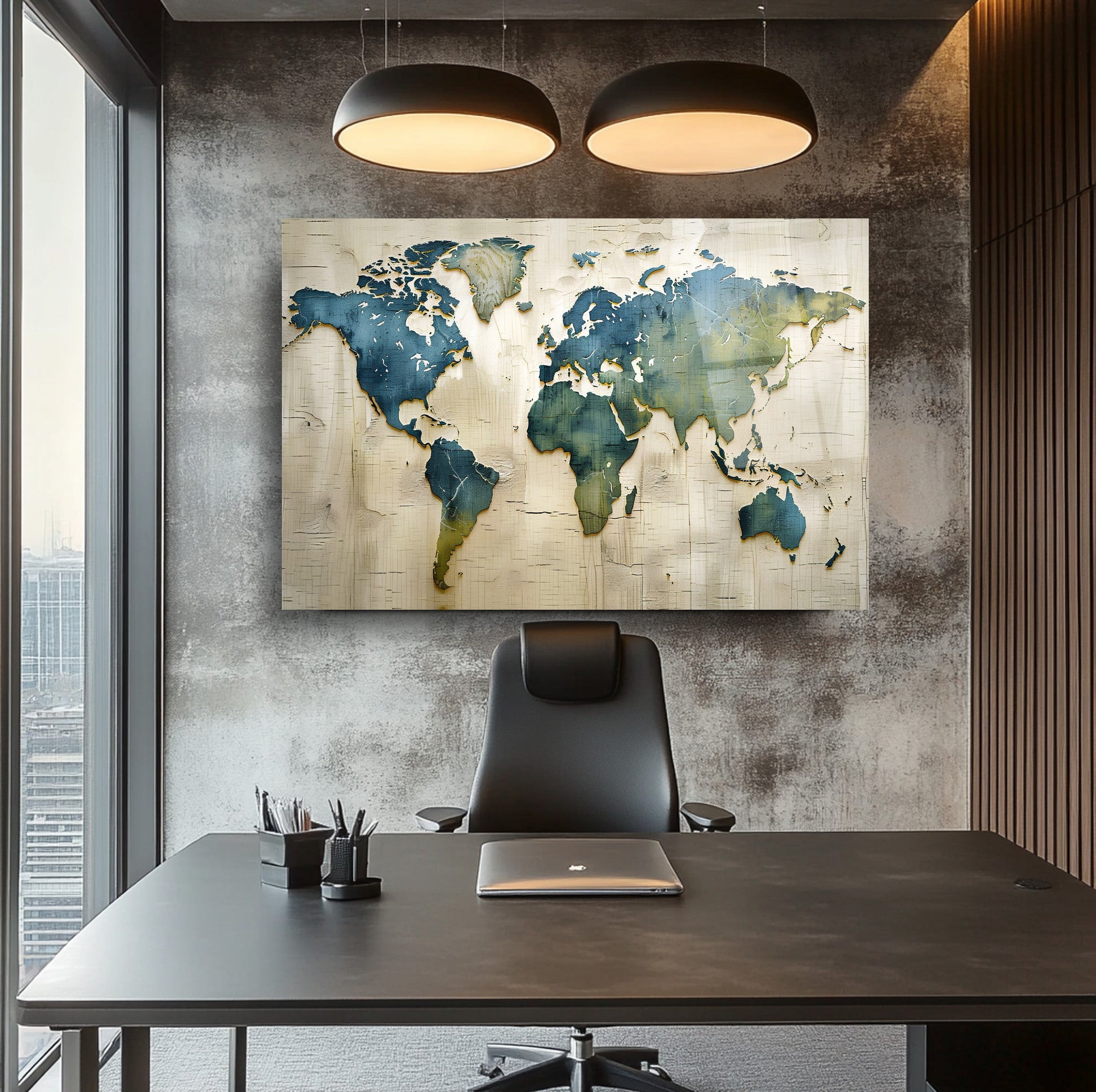 CamDeko'dan iş ve yaşam alanlarınıza modern bir prestij katan özel bir eser: Makam Odası Toplantı Salonu Renkli Retro Dünya Haritası Gerçek Temperli Cam Tablo! Küresel düşüncenin ve başarının sembolü Dünya Haritası, canlı retro renkleri ve modern tasarımıyla toplantı odanıza, makam odanıza, ofisinize veya evinize ilham veren bir atmosfer katıyor.