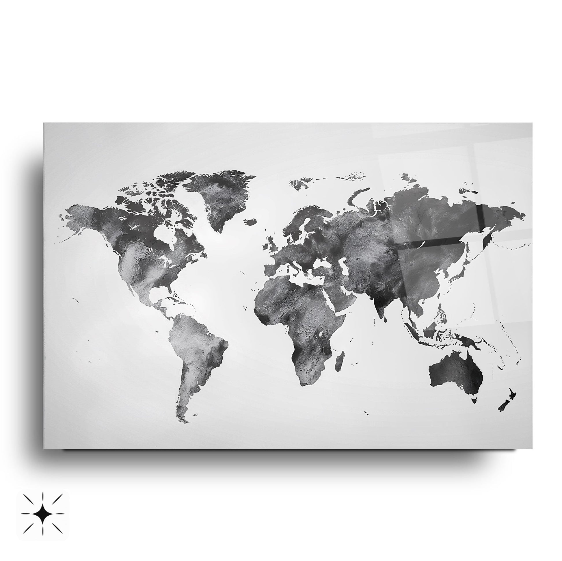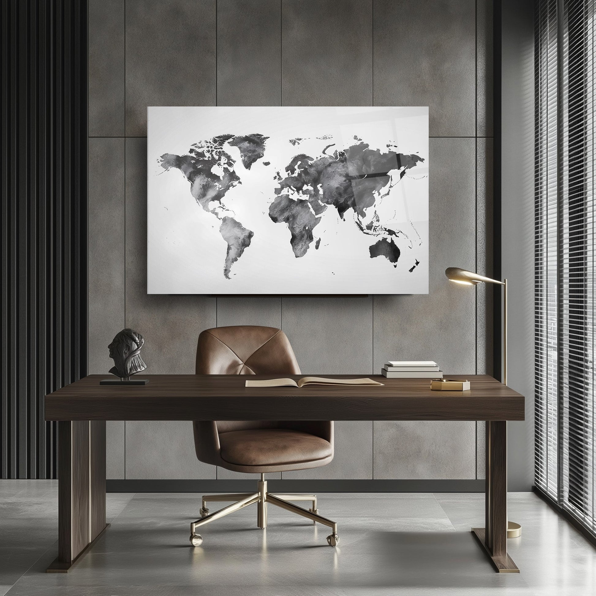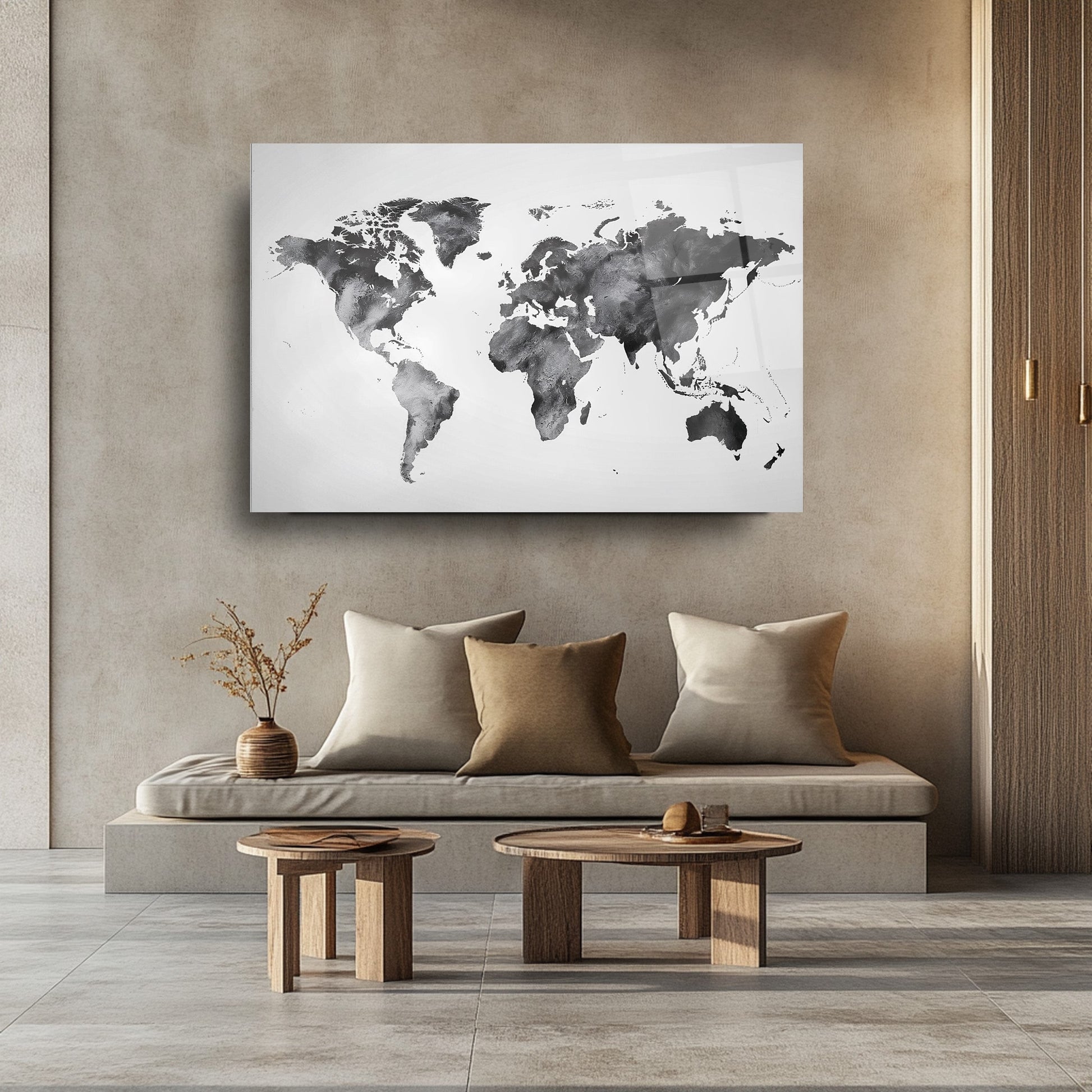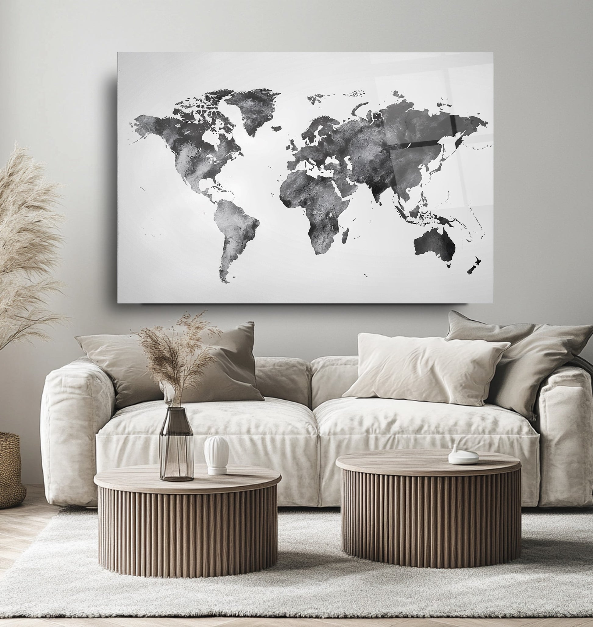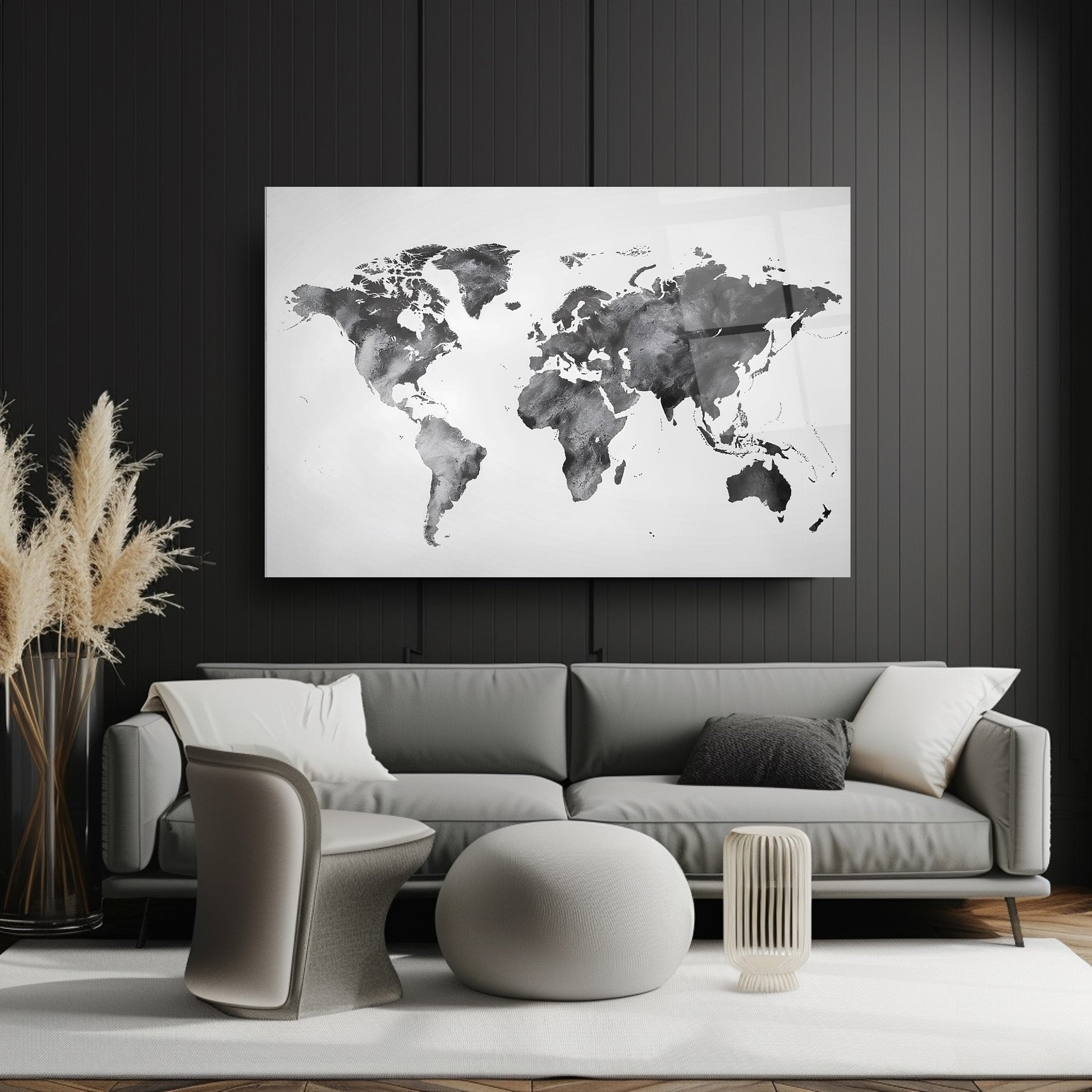 Mekanlarınıza Küresel Bir Vizyon Katın: Siyah Beyaz Dünya Haritası Cam Tablo