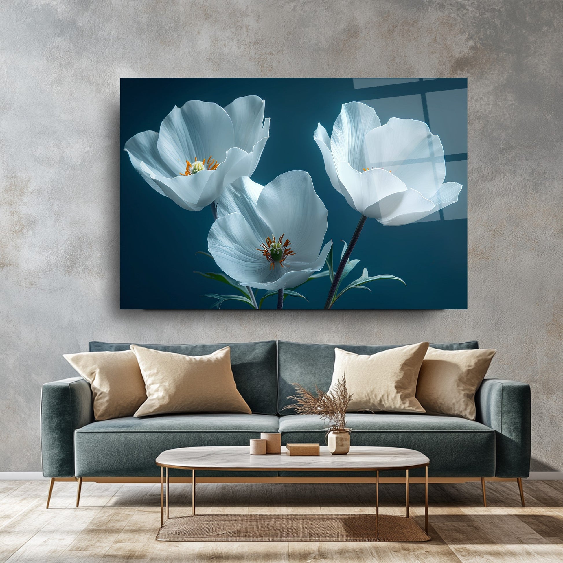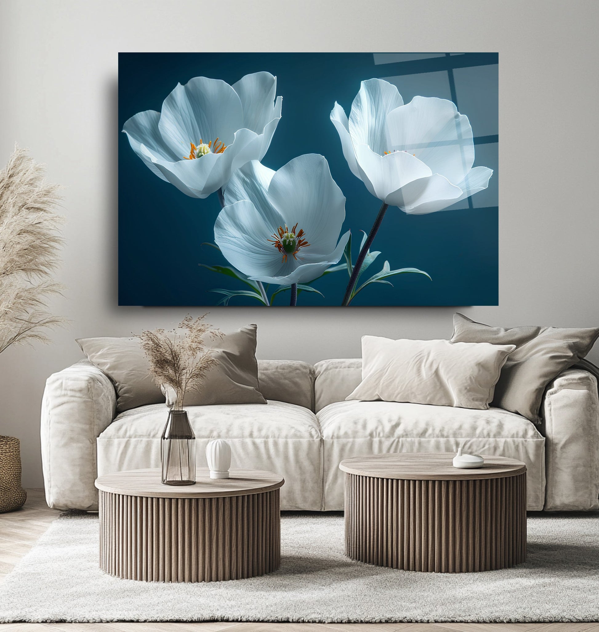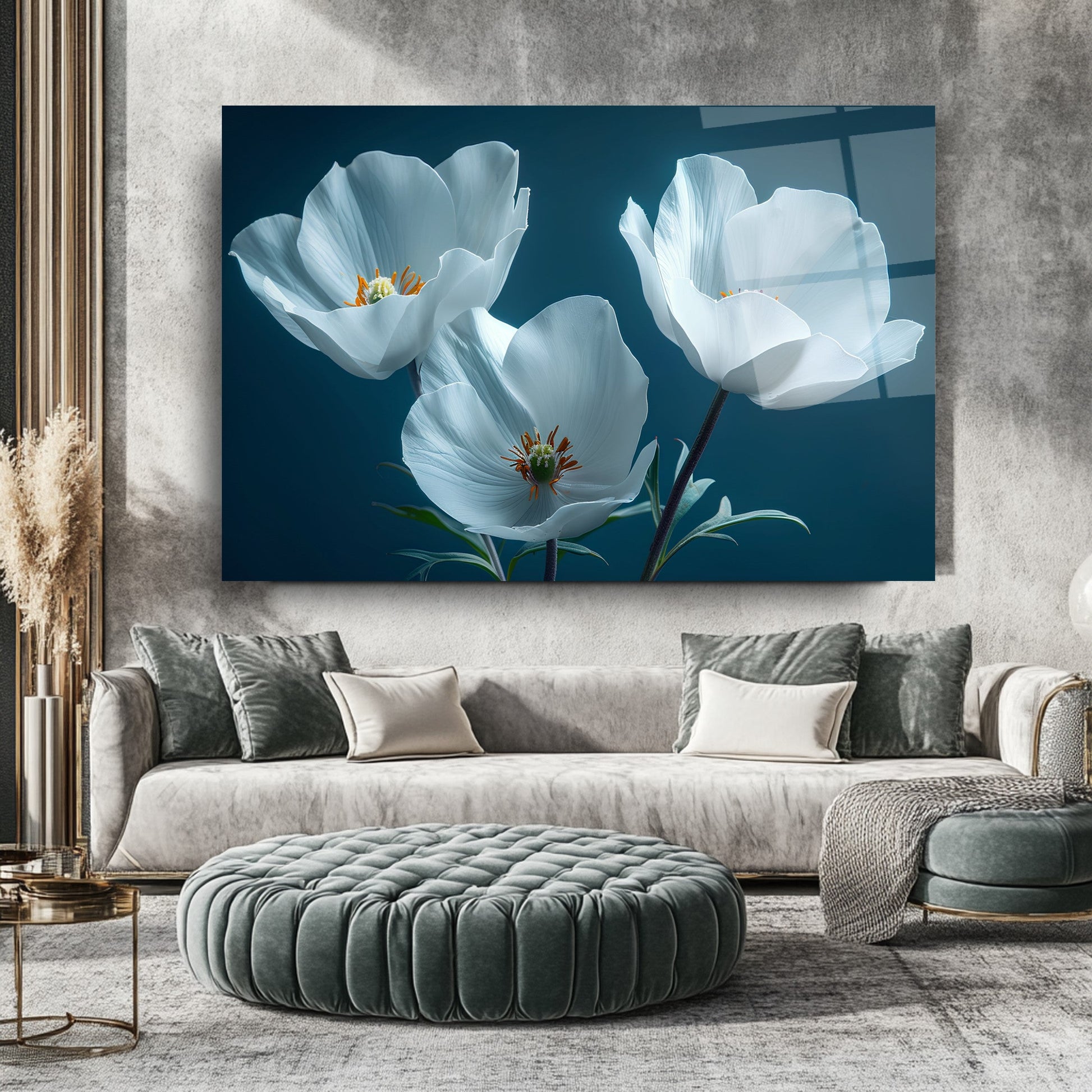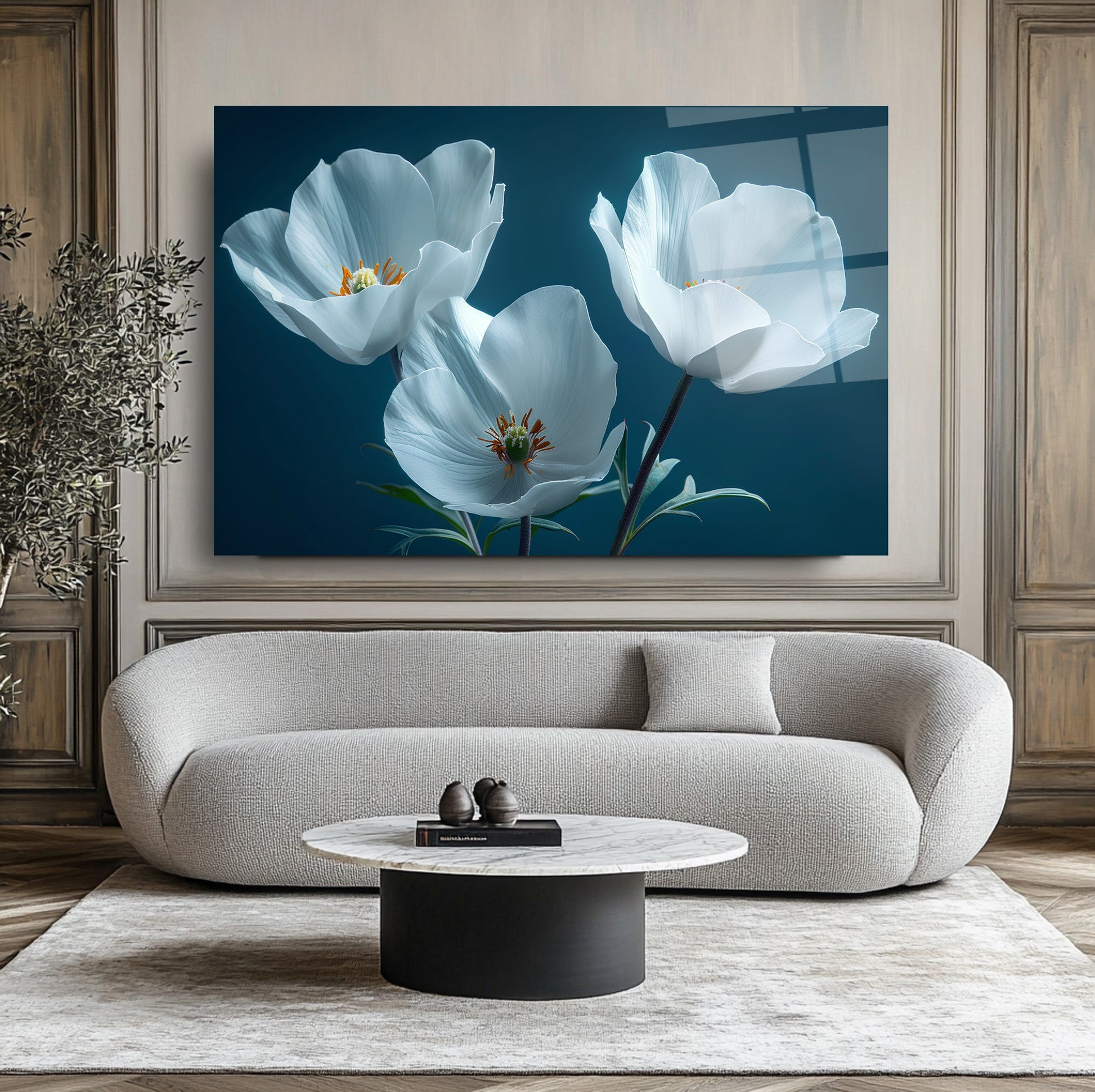 Mavi arka plan üzerine beyaz çiçek desenleriyle tasarlanan bu modern cam tablo, ferah ve zarif bir atmosfer yaratır. UV baskı tekniğiyle canlı ve solmayan renkler, temperli cam yüzeyde uzun ömürlü kullanım sunar. Çerçevesiz minimalist tasarımı sayesinde salon, ofis veya yatak odası gibi her mekâna kolayca uyum sağlar. Estetik ve şıklığı bir arada arayanlar için ideal bir dekorasyon parçasıdır. Modern cam tablo, temperli cam baskı ve duvar dekoru arayanların favorisi.