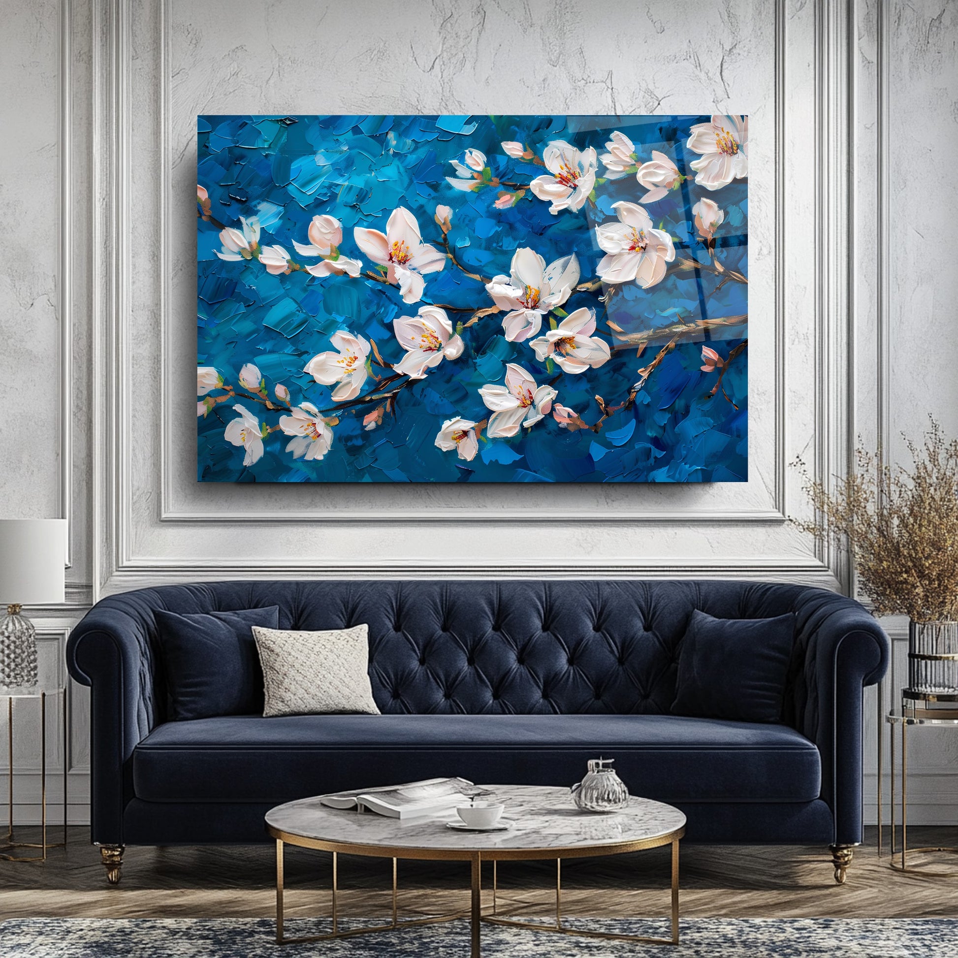 Mekanlarınıza Baharın Ferahlığını Taşıyın: Mavi Arkaplan Pastel Çizim Bahar Çiçekleri Cam Tablo