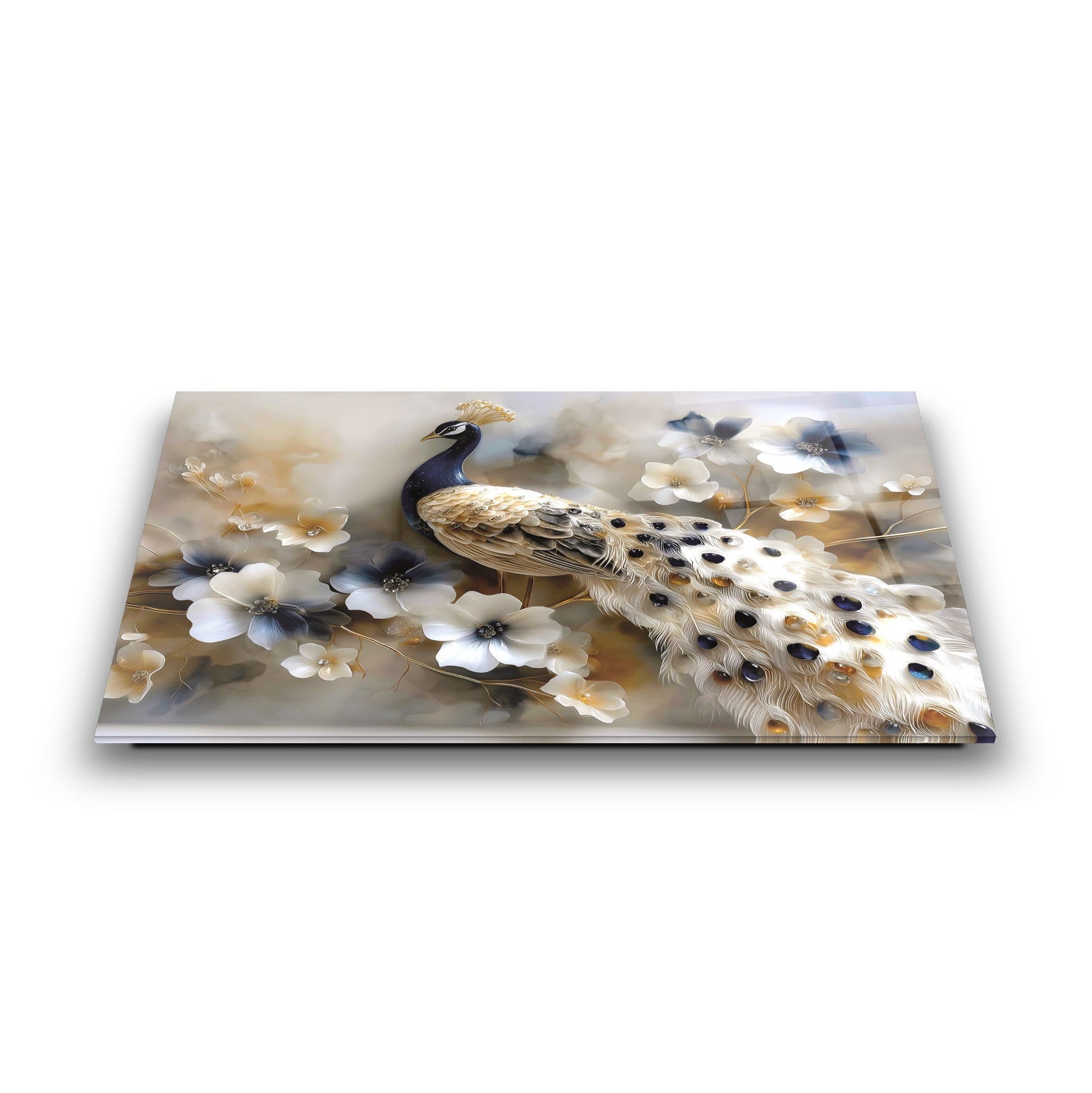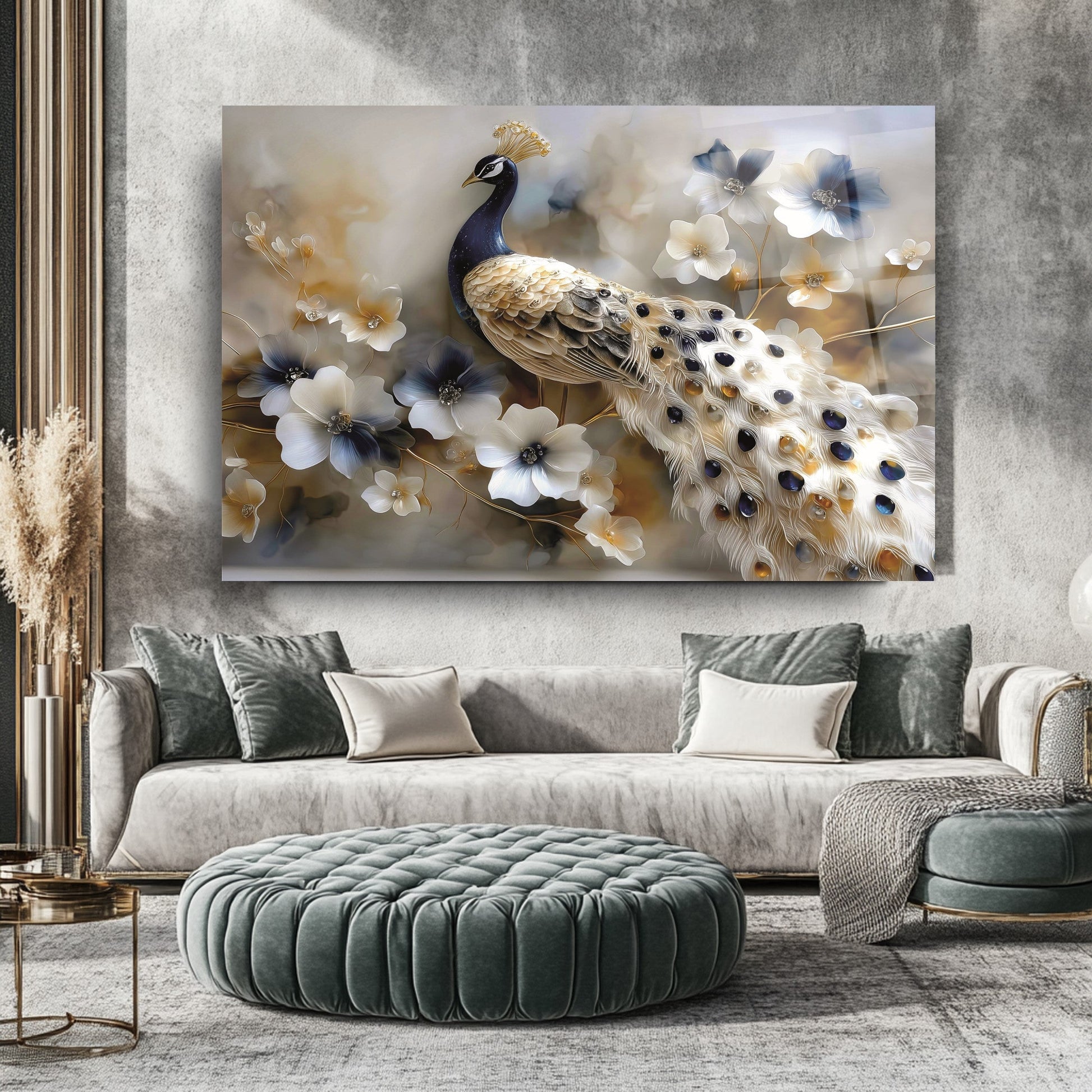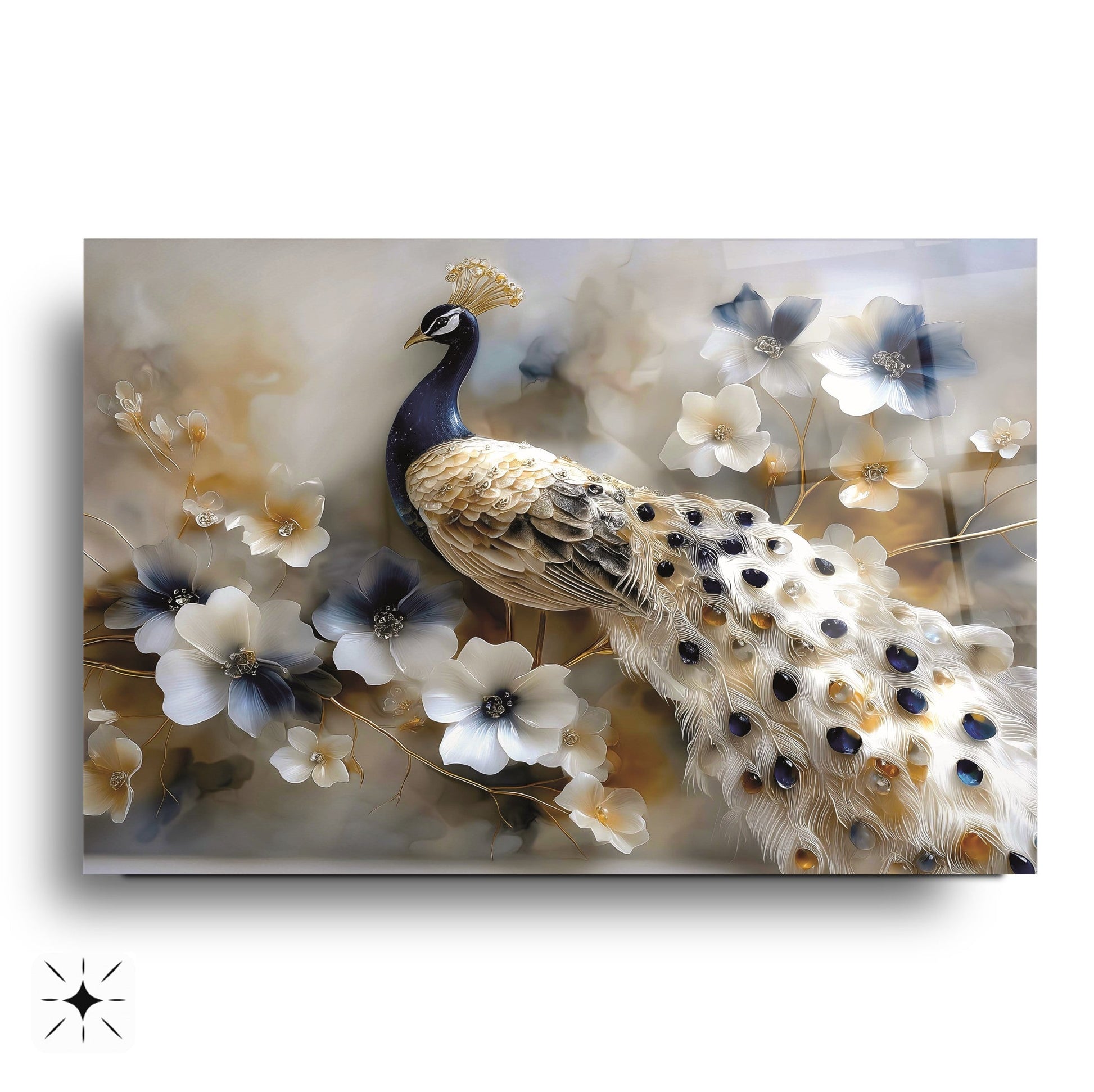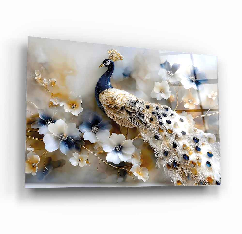 Mekanlarınıza Rengarenk Bir Zarafet: Mavi Beyaz Çiçekli Tavus Kuşu Cam Tablo